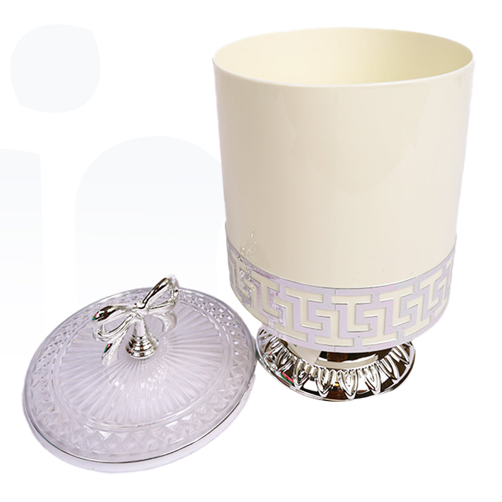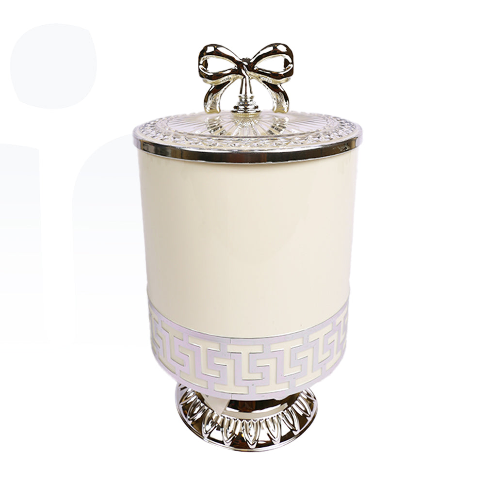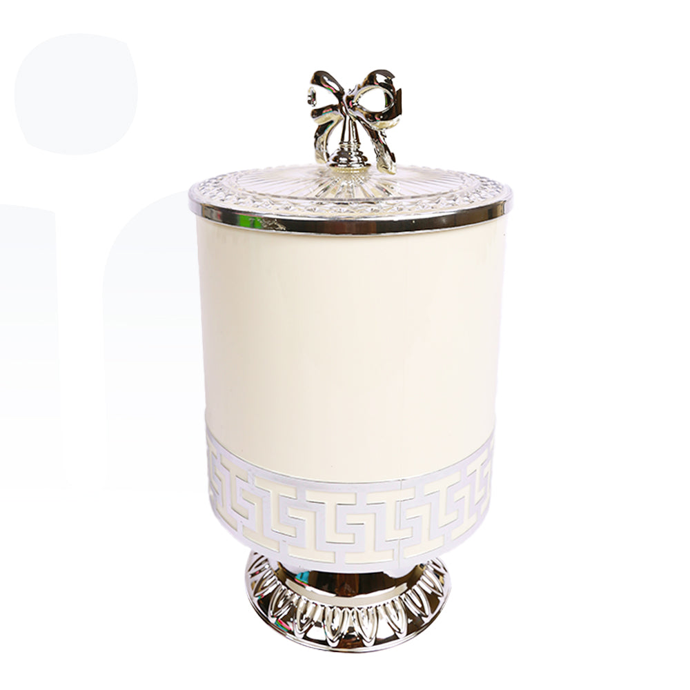 برطمان فاخر مصنوع من الأكريليك الشفاف بتصميم مزخرف أنيق ولون أبيض وفضي جذاب، مزود بغطاء فيونكة تضيف لمسة جمالية راقية. مثالي لتقديم الحلويات أو حفظ المكسرات والسكاكر بطريقة أنيقة، كما يمكن استخدامه كقطعة ديكور مميزة في المناسبات أو على طاولة الضيافة.