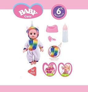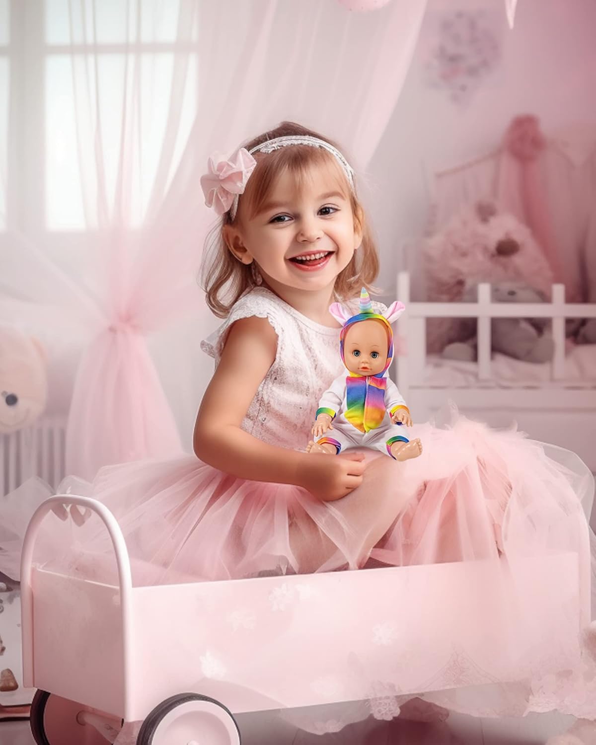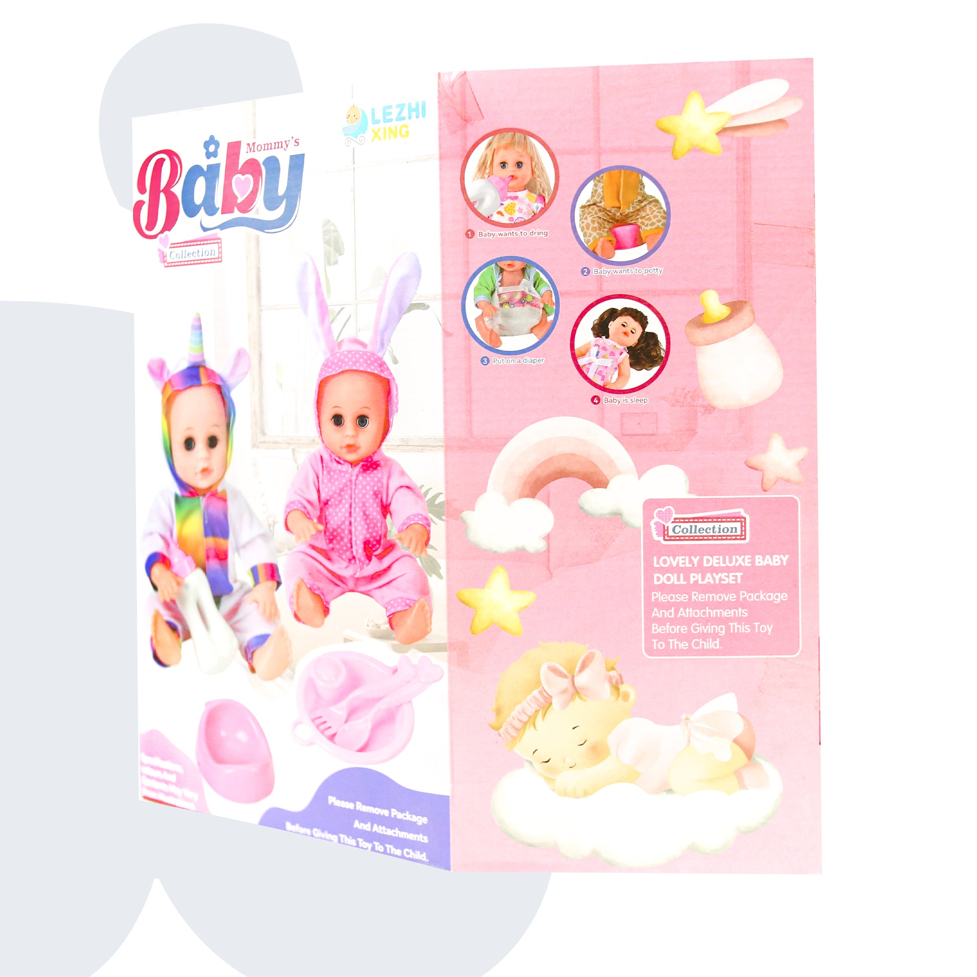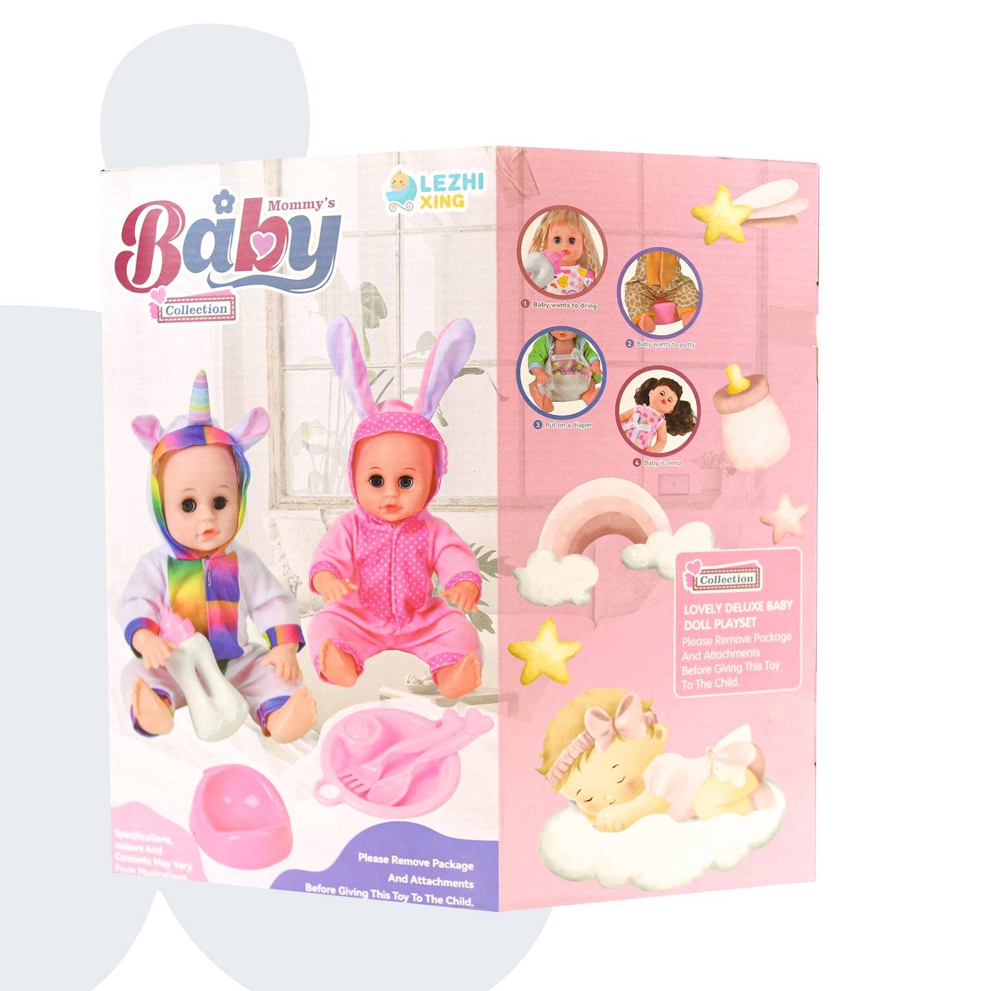 دمية بيبي واقعية الملامح تأتي بملابس تنكرية لطيفة (زي الأرنب أو اليونيكورن)، مع مجموعة من أدوات الإطعام مثل الطبق والمعلقة والقصعة الصغيرة. مصنوعة من مواد آمنة وملابس قماشية ناعمة لتمنح الأطفال تجربة لعب ممتعة ورعاية تشبه الواقع.