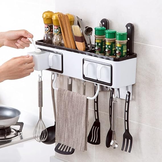 رف منظم عملي للمطبخ يجمع بين تخزين السكاكين والتوابل في تصميم واحد أنيق وموفر للمساحة. مصنوع من الأكريليك عالي الجودة، يتميز بمتانته وسهولة تنظيفه. يمكن تثبيته على الحائط لتوفير مساحة إضافية وتنظيم أدوات المطبخ بشكل مرتب وآمن، مما يجعله خياراً مثالياً لكل مطبخ عصري.