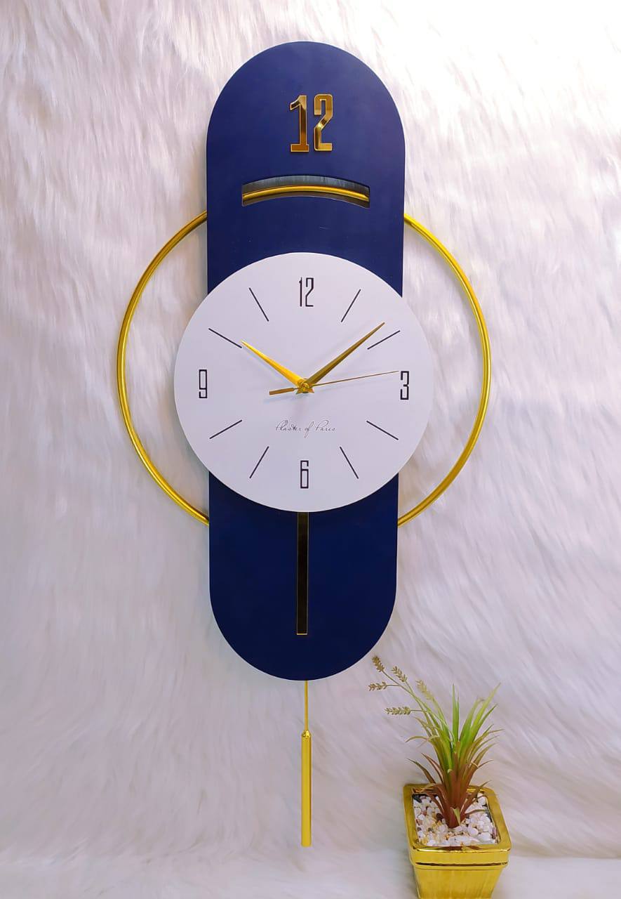 ساعة حائط فاخرة بتصميم بندول عصري تضيف لمسة فخامة وأناقة إلى الديكور الداخلي، مصنوعة من معدن مطلي باللون الذهبي عالي الجودة يمنحها مظهرًا راقيًا ومتانة تدوم طويلًا.
