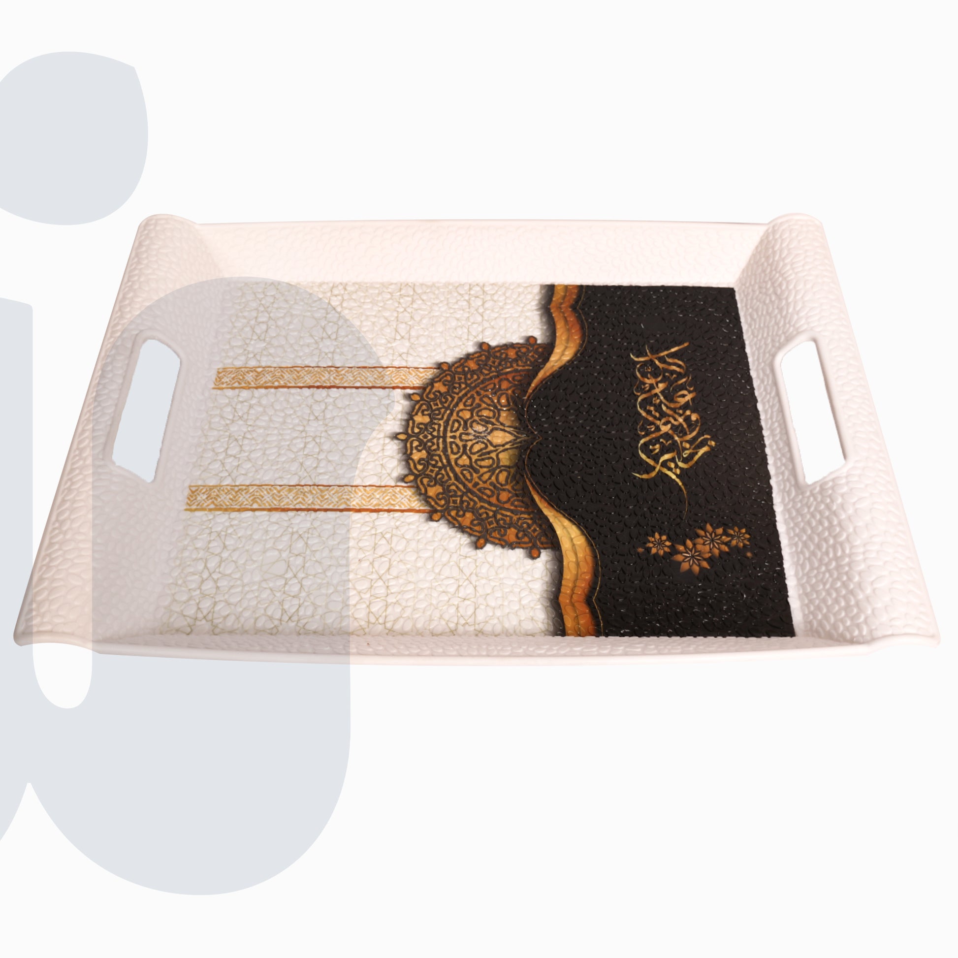 صينية أنيقة بشكل مستطيل، مزينة بتصميم مئذنة جامع يعبّر عن أجواء رمضان وروحانيته. مناسبة لتقديم الضيافة في الشهر الكريم أو للاستخدام كقطعة ديكور تضيف لمسة هدوء وجمال للسفرة أو ركن القهوة. اختيار عملي وشيك، وتنفع كهدية مميزة في رمضان.