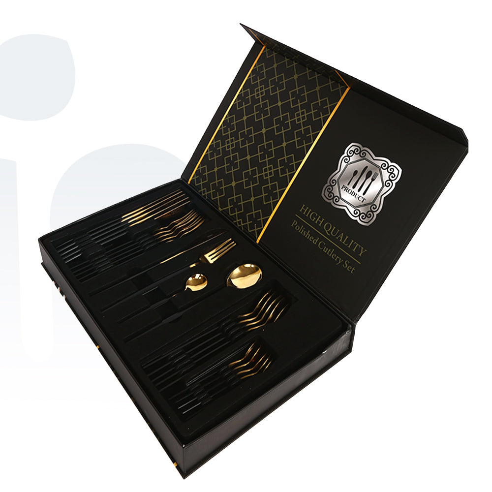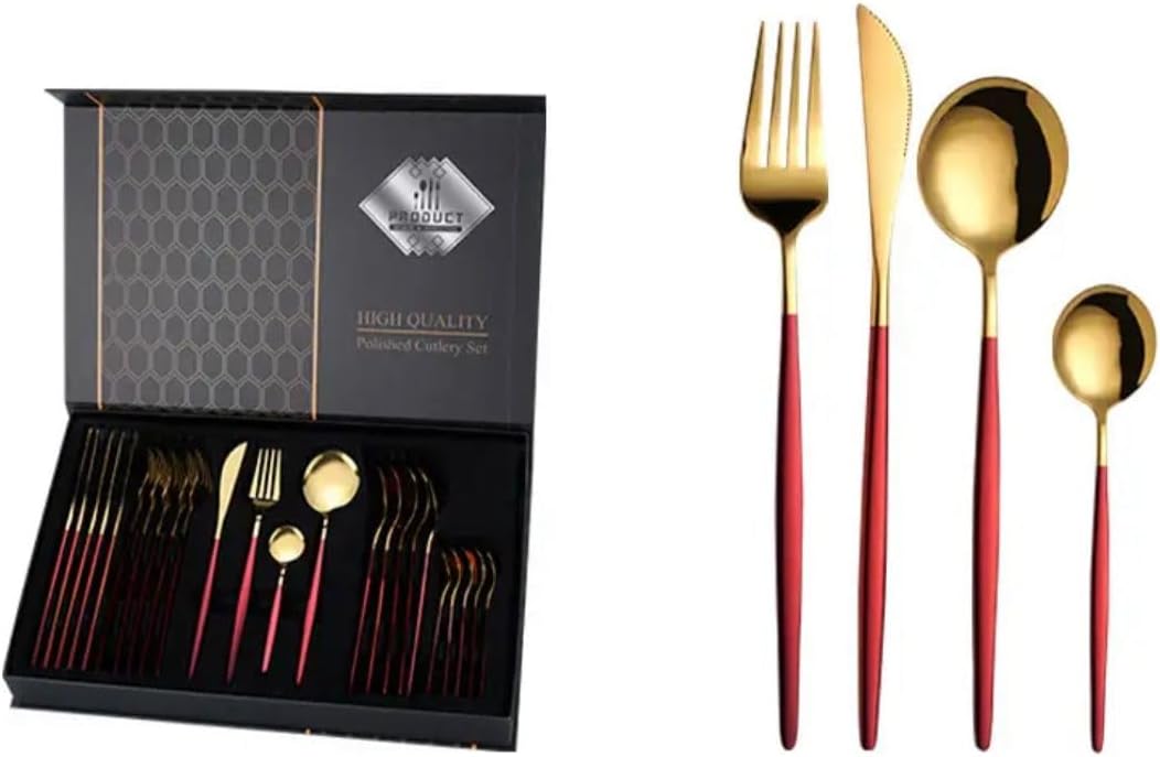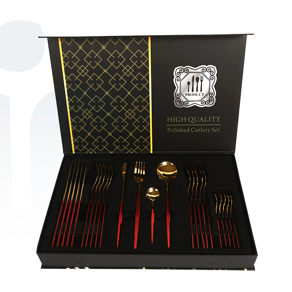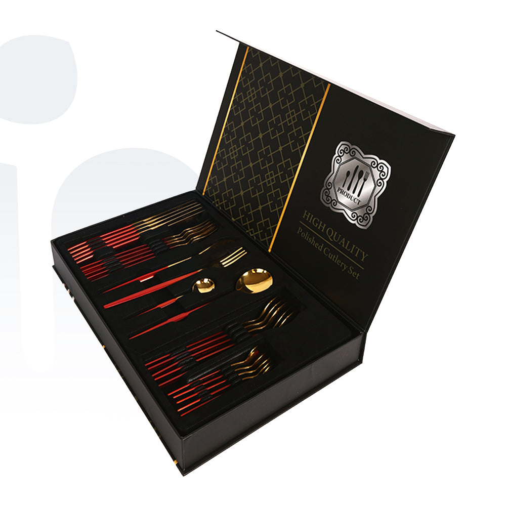 طقم أنيق مكون من معالق وشوك وسكاكين يأتي في علبة فاخرة مناسبة للهدايا. يتميز بتصميم عصري وألوان راقية بالأسود والأحمر، مما يضفي لمسة فخمة على مائدتك اليومية أو في المناسبات الخاصة.