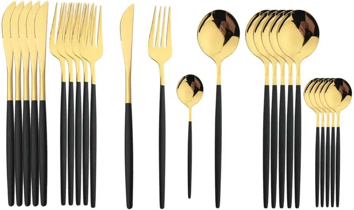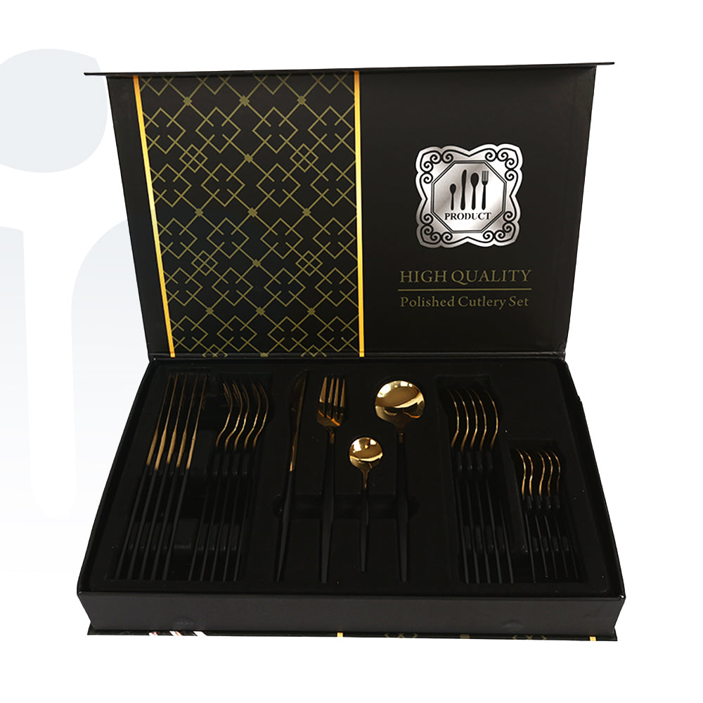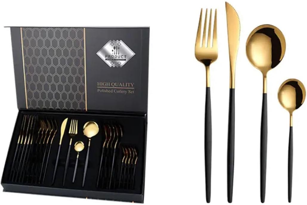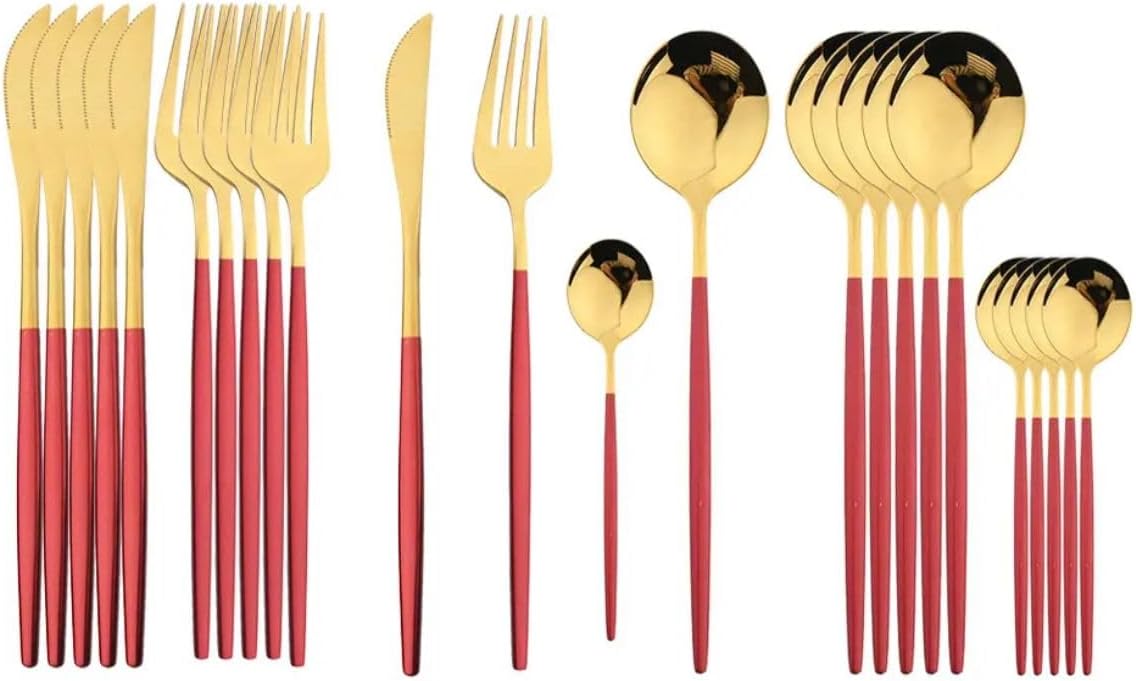طقم أنيق مكون من معالق وشوك وسكاكين يأتي في علبة فاخرة مناسبة للهدايا. يتميز بتصميم عصري وألوان راقية بالأسود والأحمر، مما يضفي لمسة فخمة على مائدتك اليومية أو في المناسبات الخاصة.