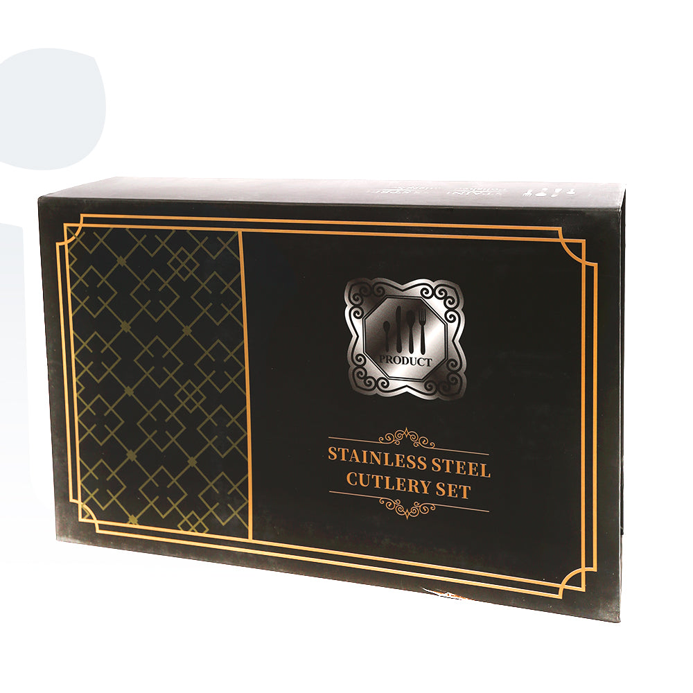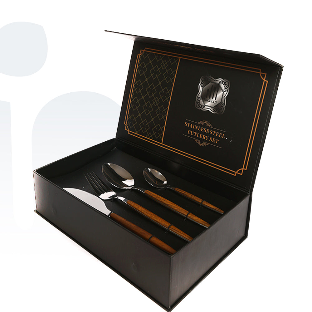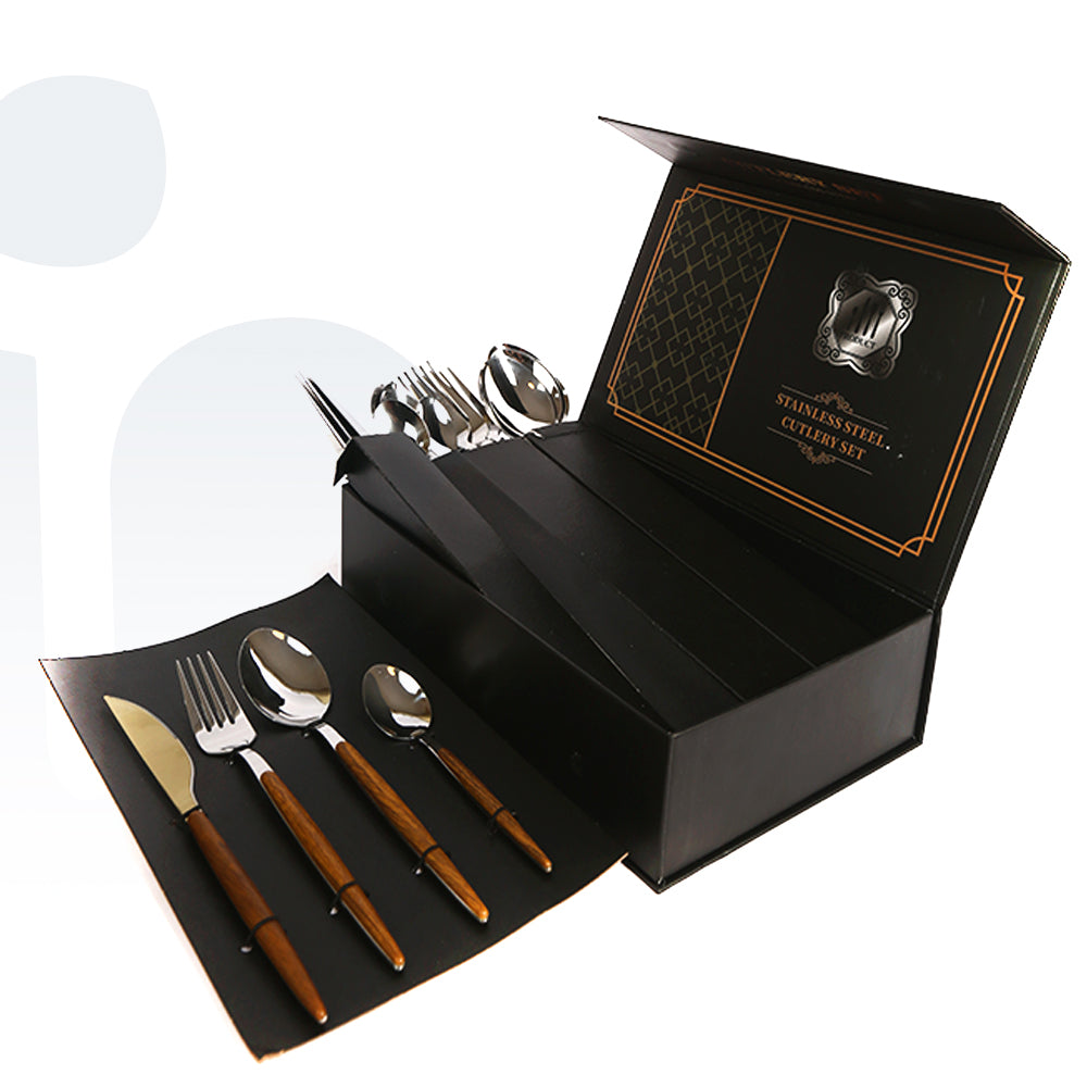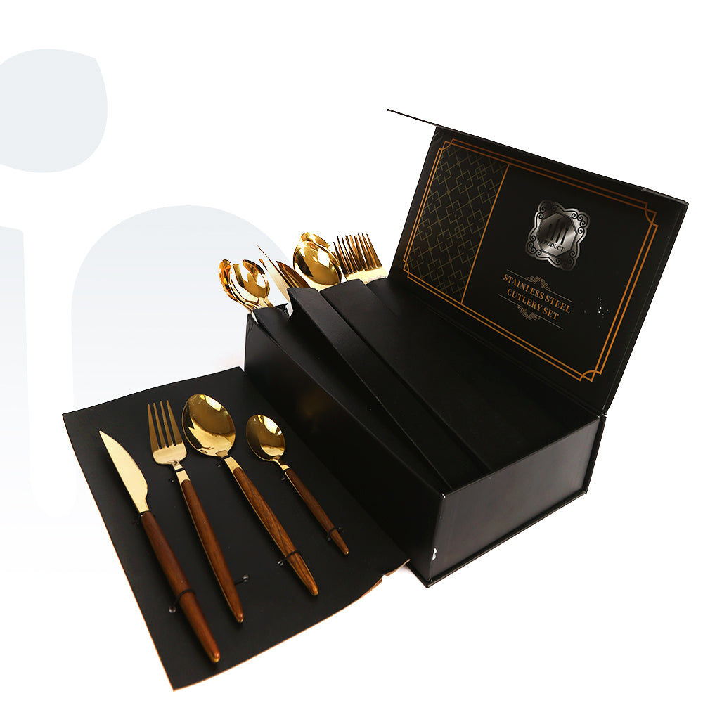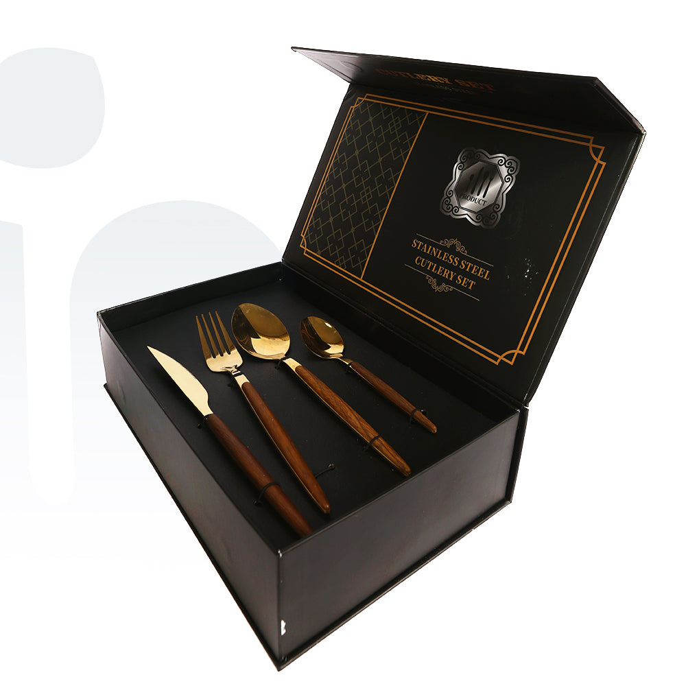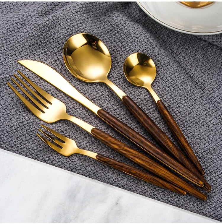 طقم أنيق من أدوات المائدة مكون من 24 قطعة بتصميم فاخر يجمع بين الخشب والفولاذ المقاوم للصدأ، متوفر باللونين الذهبي والفضي ليمنح مائدتك لمسة فخمة وأسلوب راقٍ في كل مناسبة.