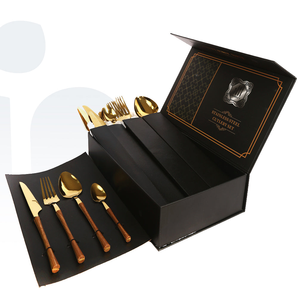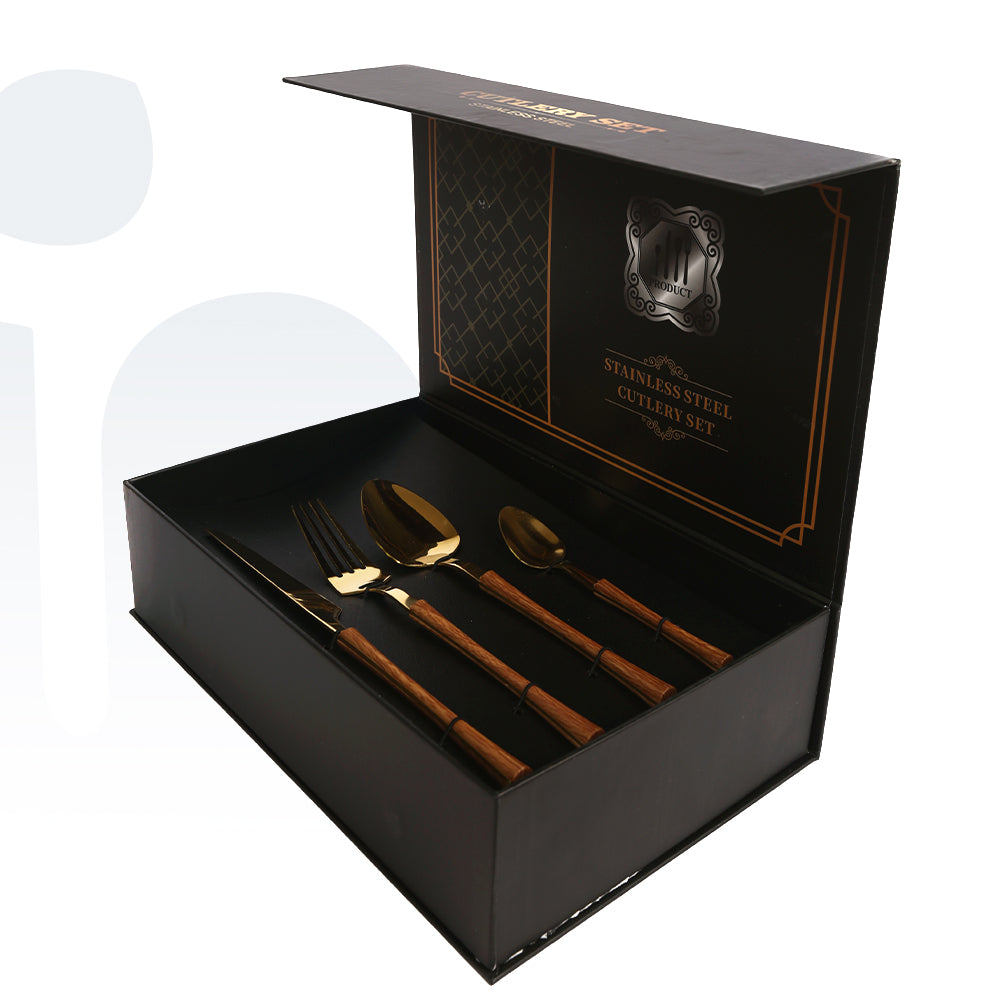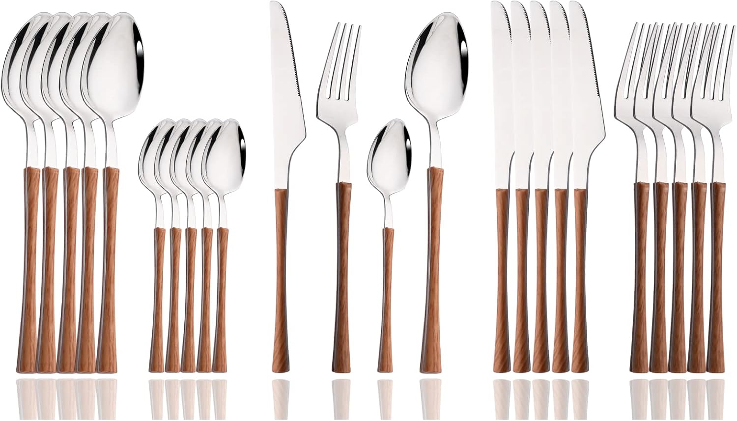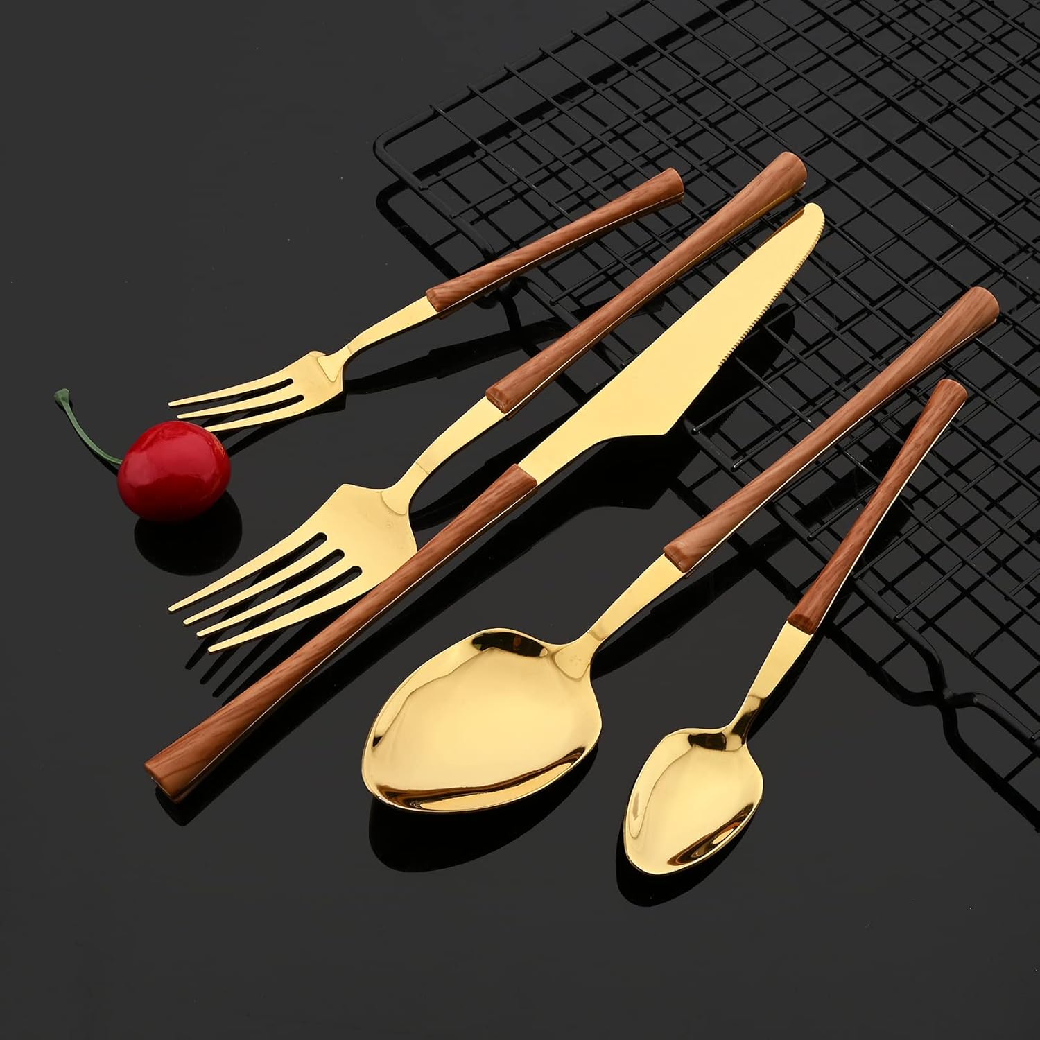 طقم أنيق من أدوات المائدة مكون من 24 قطعة بتصميم فاخر يجمع بين الخشب والفولاذ المقاوم للصدأ، متوفر باللونين الذهبي والفضي ليمنح مائدتك لمسة فخمة وأسلوب راقٍ في كل مناسبة.
