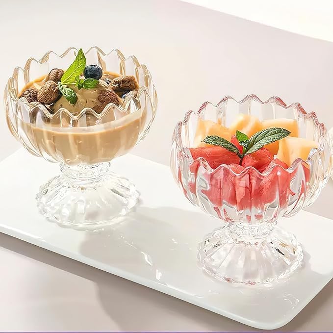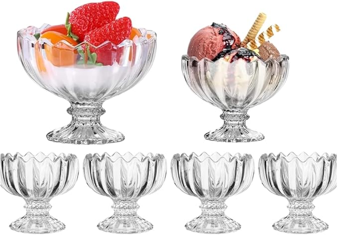 طقم أنيق مكون من 6 أكواب زجاجية شفافة بتصميم زهرة التوليب، سعة كل كوب 6.8 أونصة. مثالية لتقديم الآيس كريم، الكوكتيل، السلطات أو الحلوى بشكل راقٍ ومميز. مصنوعة من زجاج عالي الجودة يمنح مظهراً جذاباً ومتانة للاستخدام اليومي، مما يجعلها خيارًا رائعًا للمناسبات أو الاستخدام المنزلي اليومي.
