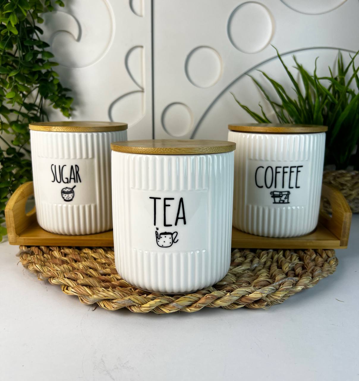 طقم بورسلين * خشب بتصميم عصري وشكل شيك جدًا، مناسب للمطبخ والكوفي كورنر. مثالي لوضع الشاي والسكر والقهوة، ويضيف لمسة فخامة للمكان.