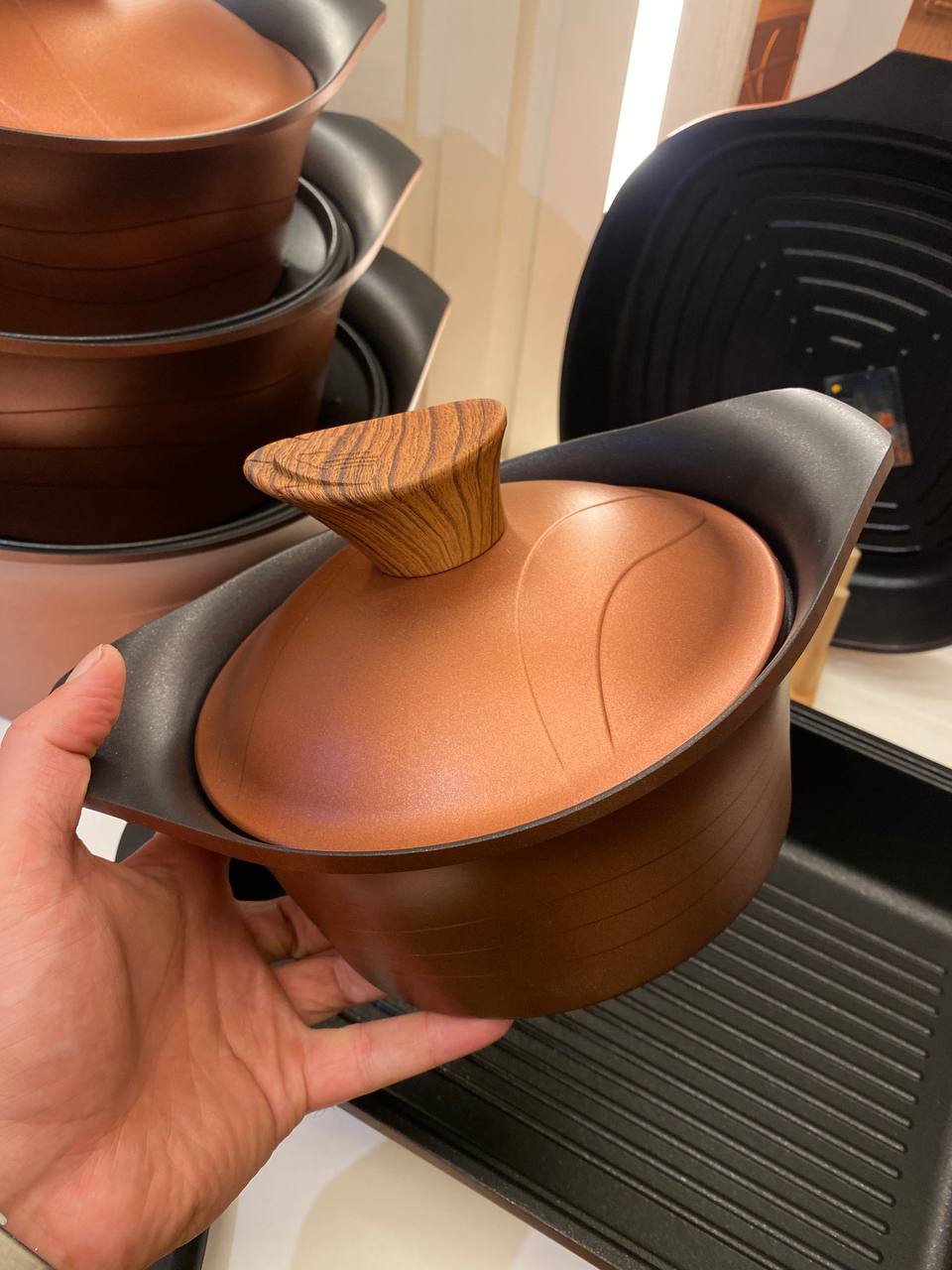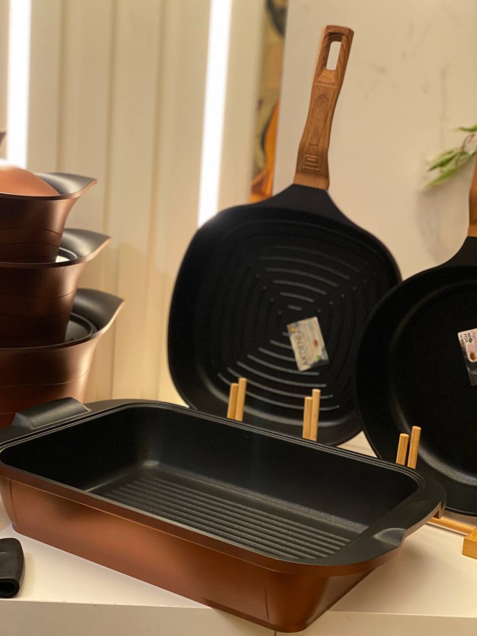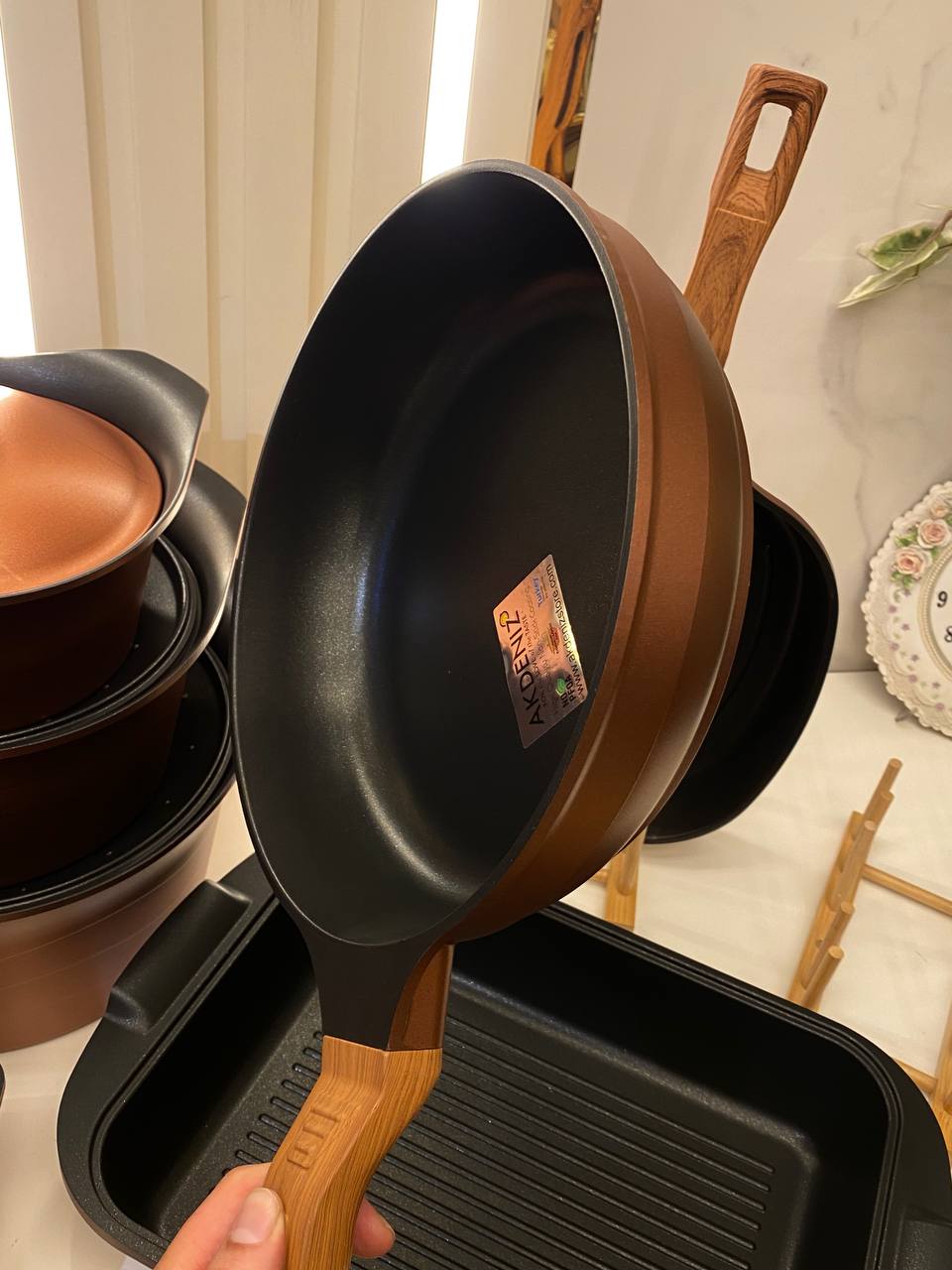 طقم حلل فاخر مصنوع من التيتانيوم عالي الجودة التركية يتميز بطلاء غير قابل للخدش وخالٍ تمامًا من الرصاص مما يجعله آمنًا وصحيًا للاستخدام اليومي يتمتع الطقم بقاعدة حرارية قوية تساعد على توزيع .الحرارة بالتساوي وتسريع عملية الطهي كما أن السطح غير اللاصق يمنع التصاق الطعام ويسهل تنظيفه