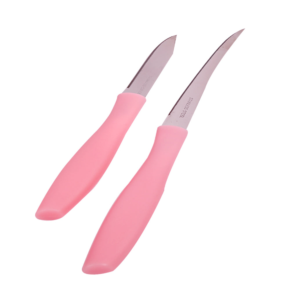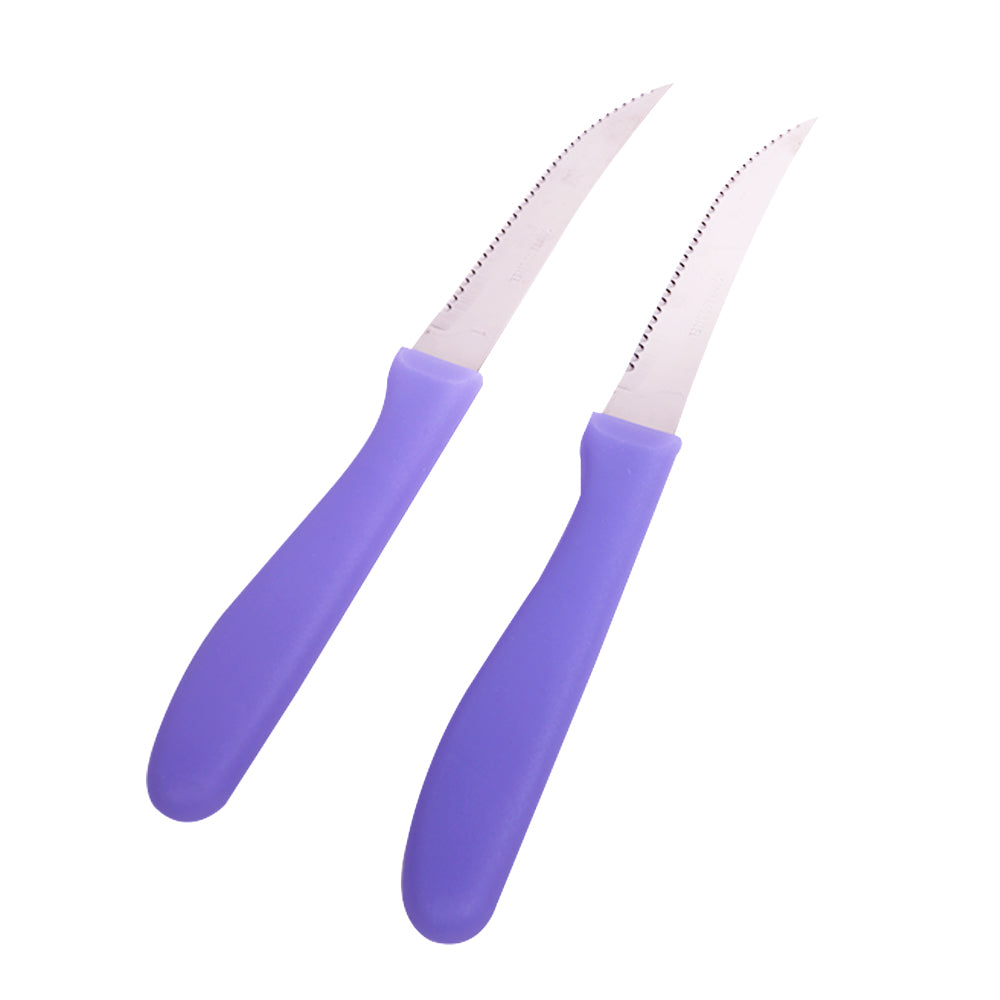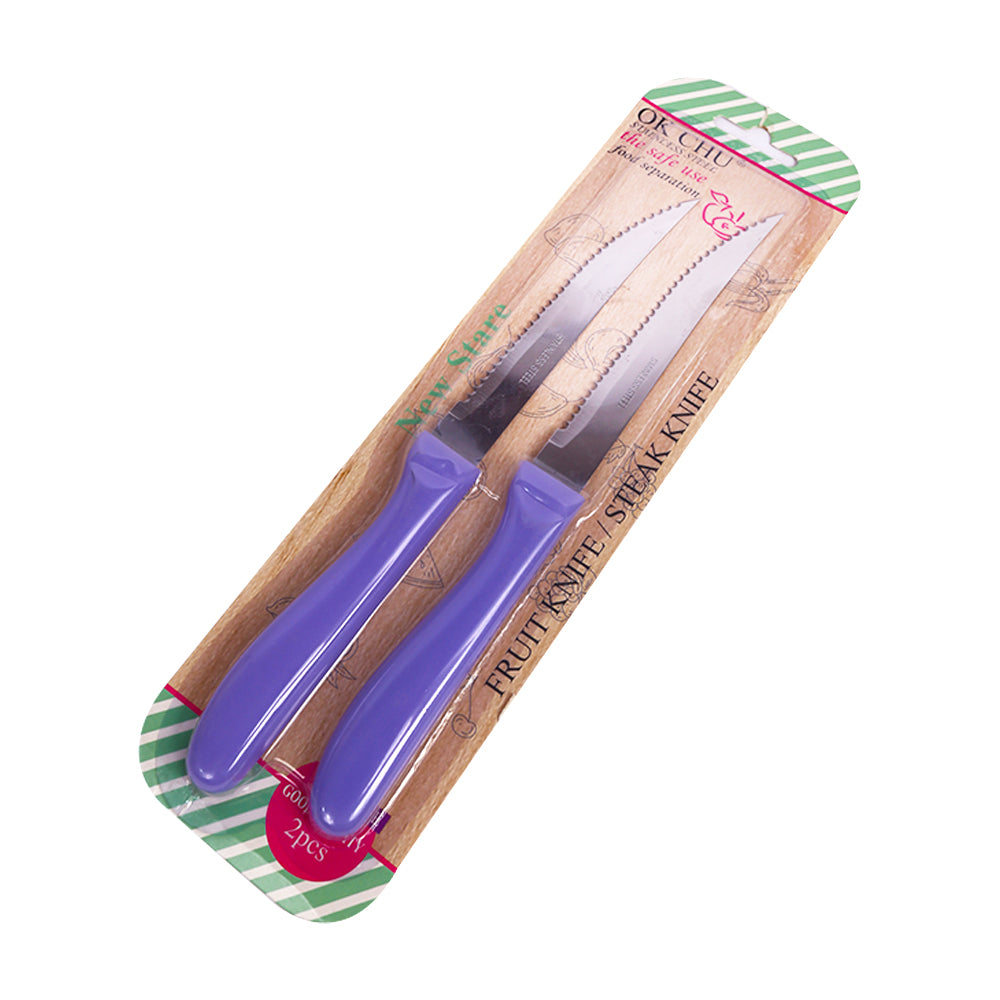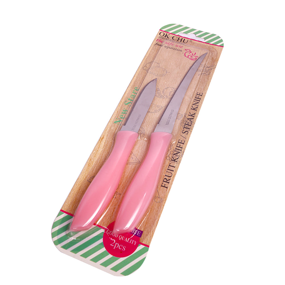 طقم أنيق مكون من سكينتين حادتين مصممتين لتقطيع وتقطير مختلف أنواع الأطعمة بسهولة ودقة. مصنوعتان من الفولاذ المقاوم للصدأ لضمان المتانة وطول العمر، مع مقابض مريحة توفر قبضة ثابتة وآمنة أثناء الاستخدام اليومي في المطبخ.