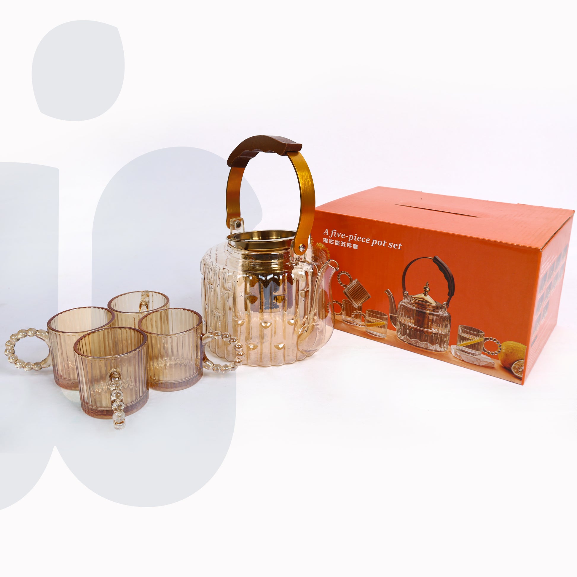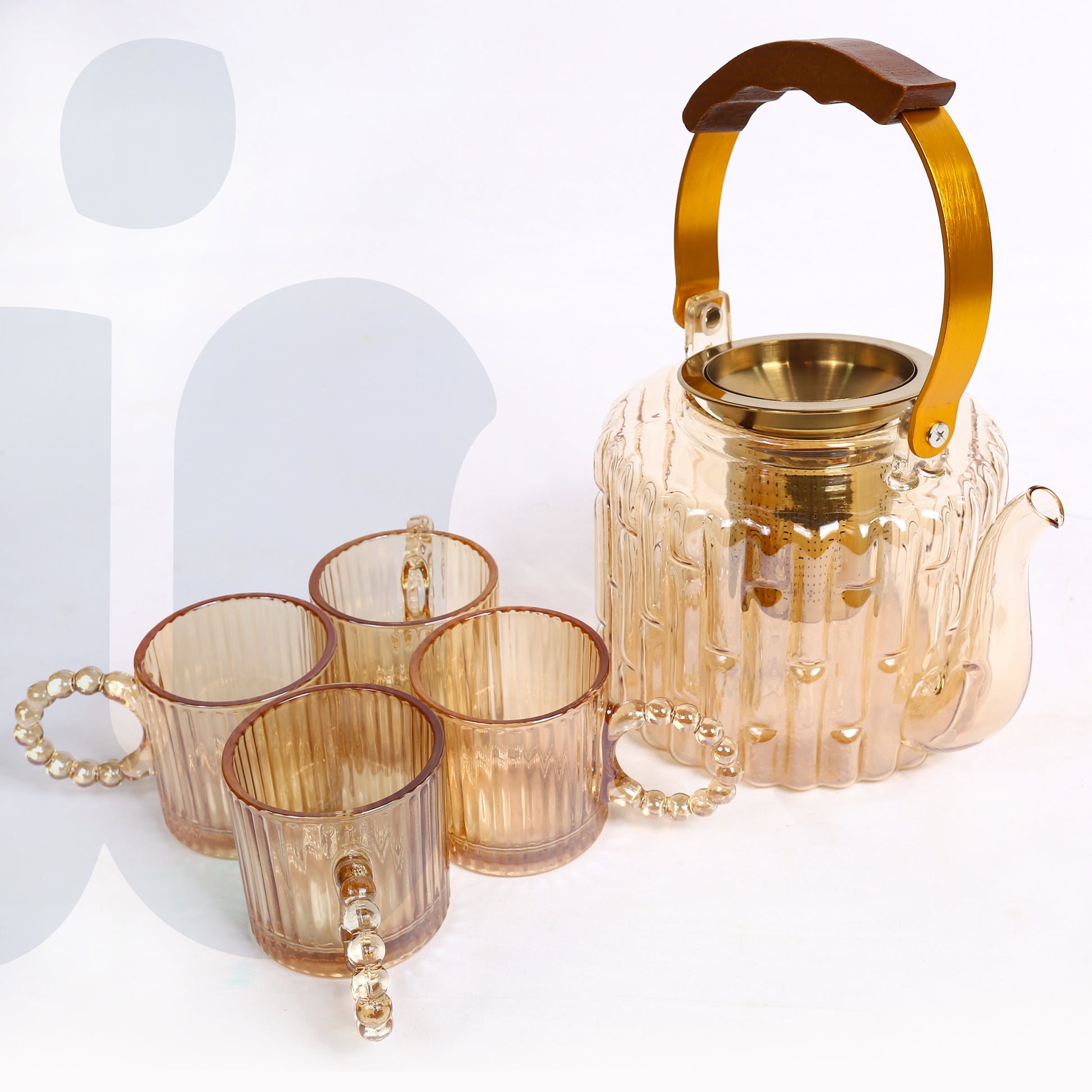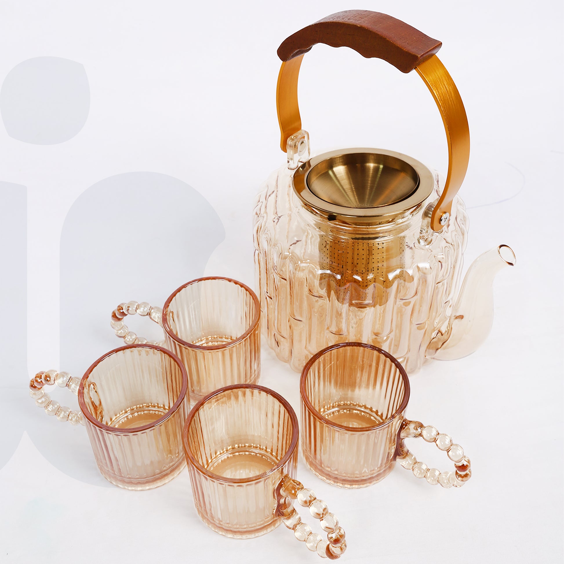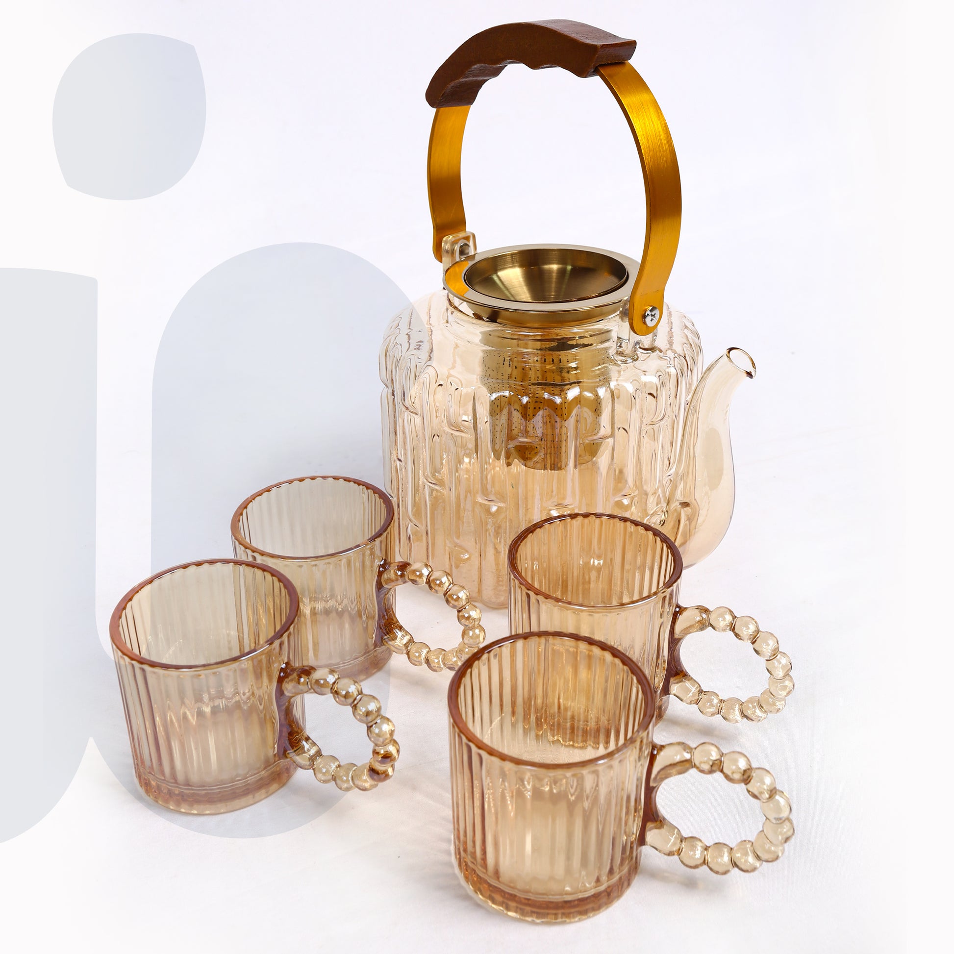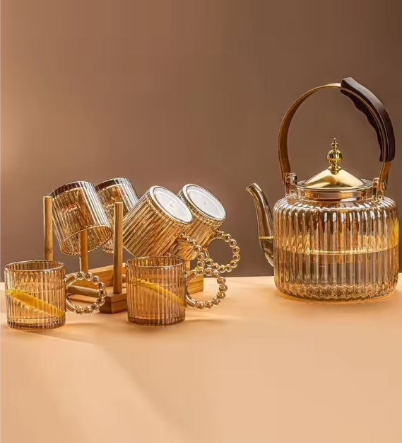 طقم شاي أنيق مصنوع من زجاج البايركس المقاوم للحرارة، بتصميم عصري يضفي لمسة فخمة على مائدتك. مثالي للاستخدام اليومي أو للضيافة.