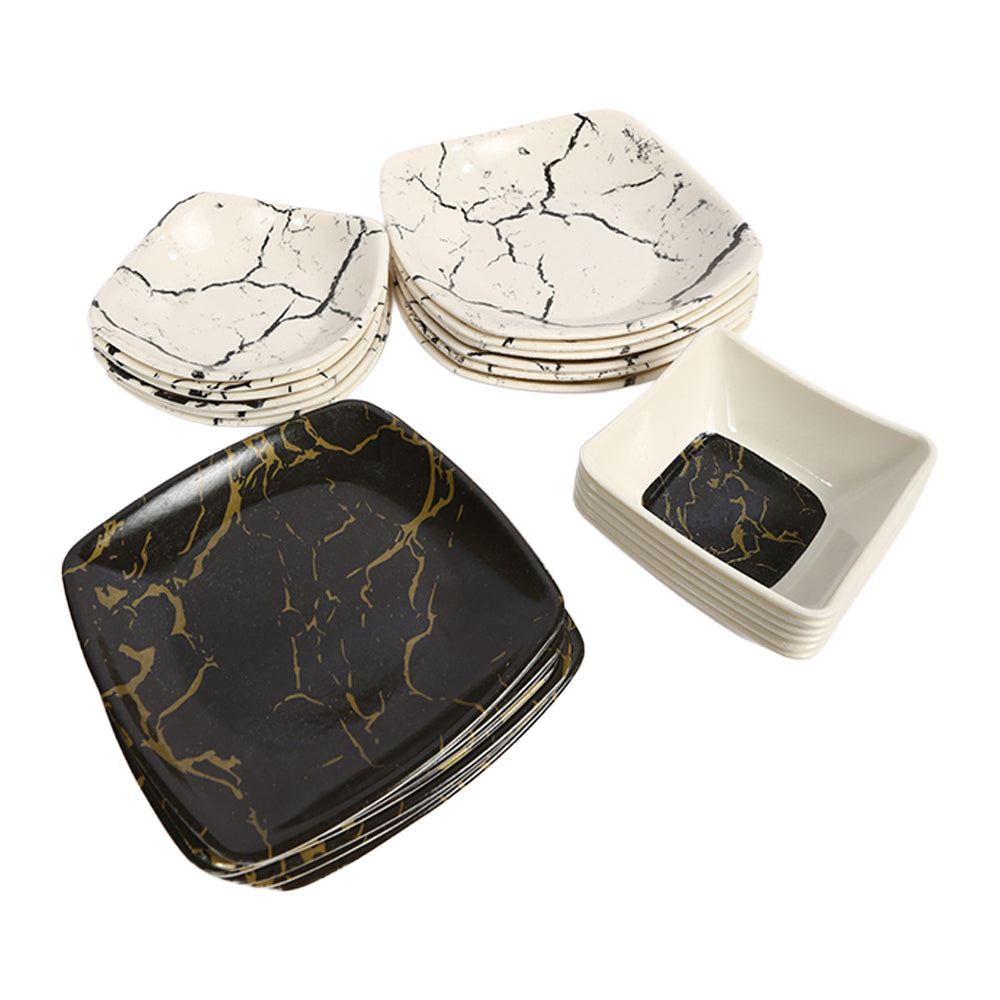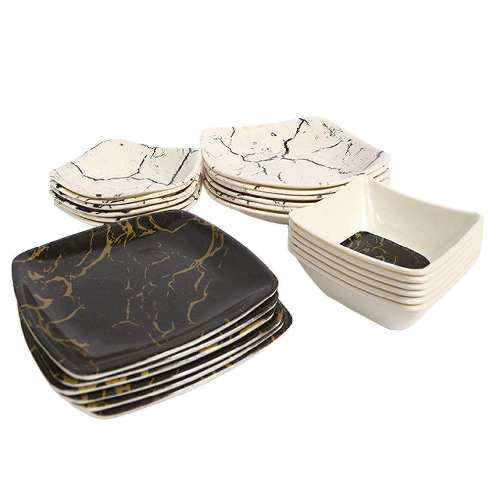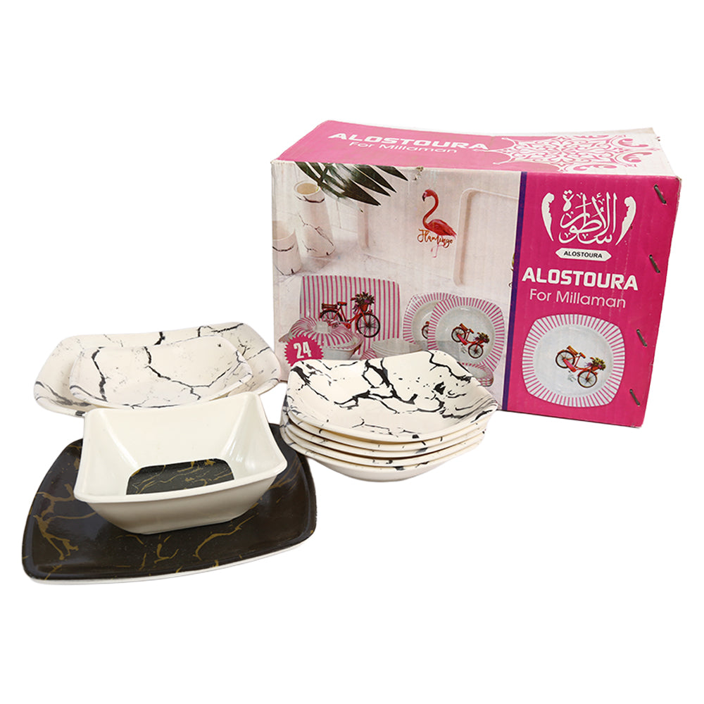 طقم مائدة متكامل مصنوع من الملامين عالي الجودة، يتكون من 24 قطعة متنوعة تناسب الاستخدام اليومي والعزومات. يتميز بخفة الوزن ومقاومته للكسر وسهولة تنظيفه، كما يأتي بألوان متعددة تضيف لمسة جمالية للمائدة.