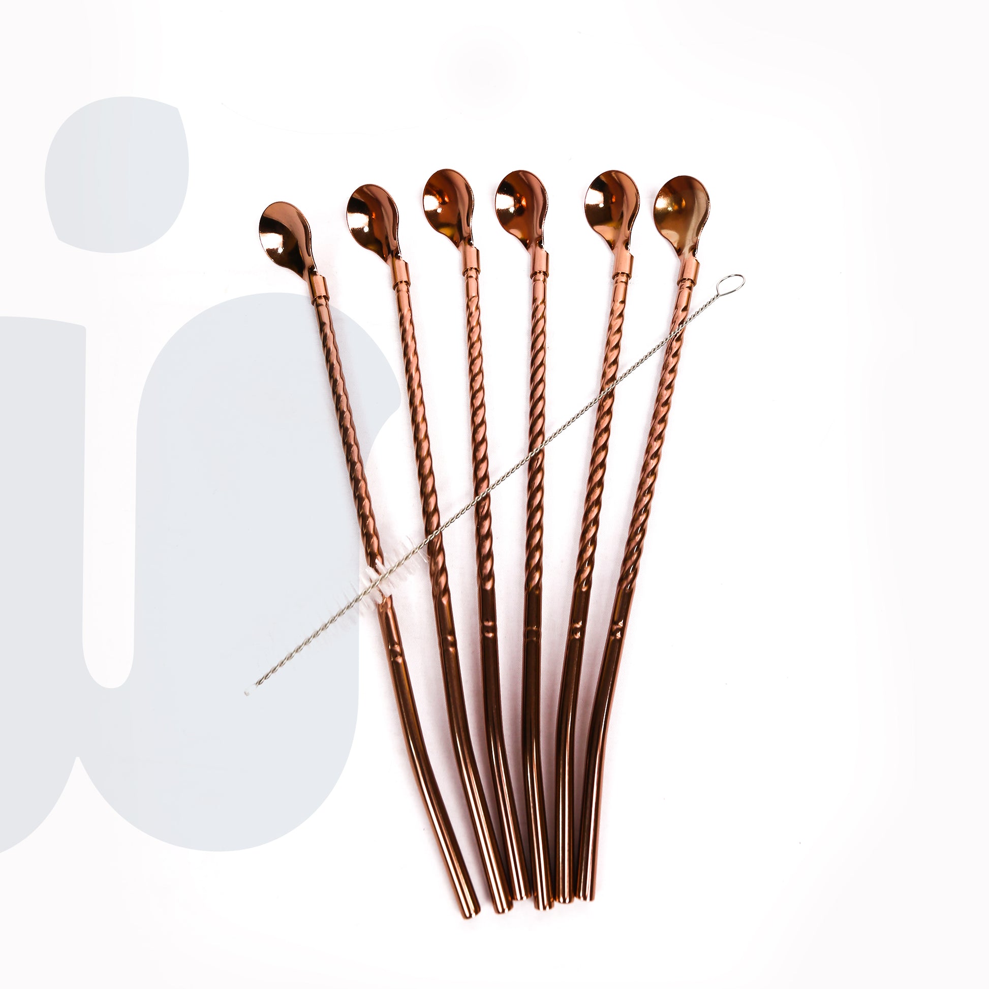 طقم 6 ملاعق شرب من الفولاذ المقاوم للصدأ مع فرشاة تنظيف – نحاسي
