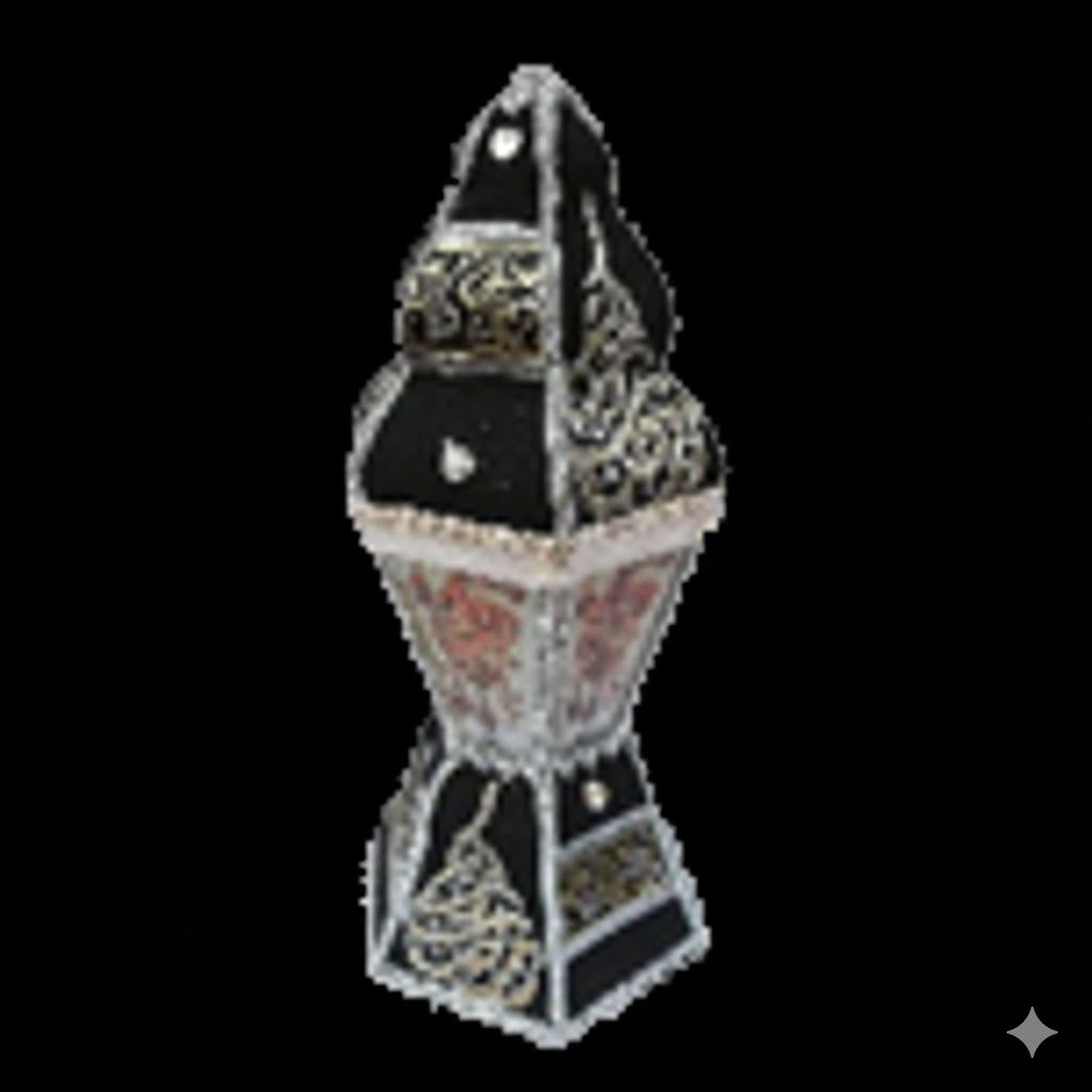"قطعة فنية تجسد عبق التراث الرمضاني، صُممت بعناية فائقة لتكون أيقونة في الزوايا الروحانية. هذا الفانوس مصنوع بكسوة قماشية فاخرة باللون الأسود القاتم، ومزين بزخارف نباتية وهندسية متداخلة تمزج بين اللونين الذهبي والفضي اللامع.