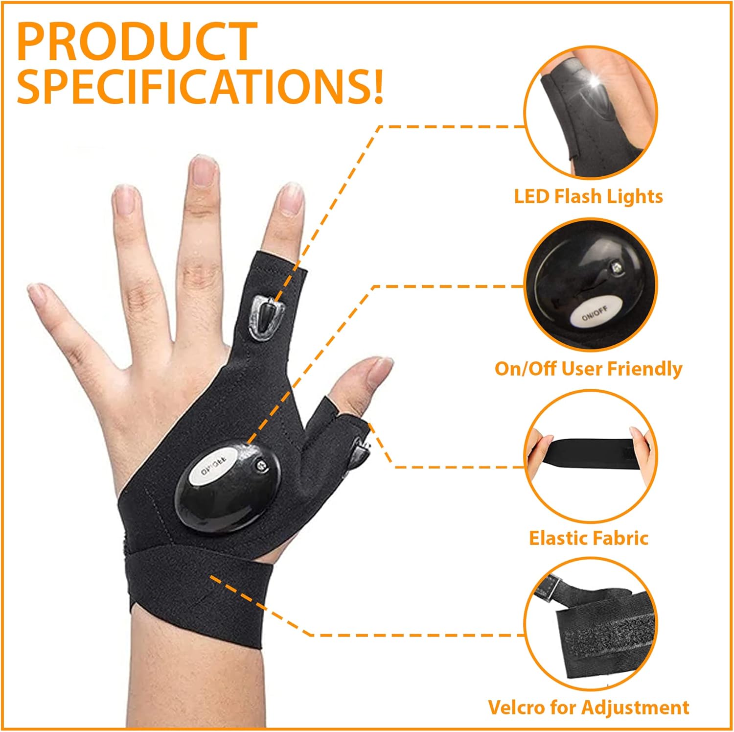 قفازات عملية مزودة بمصابيح ليد ساطعة لتوفير إضاءة مثالية في الأماكن المظلمة أو أثناء العمل الليلي. تتميز بتصميم بدون أصابع يمنح مرونة وسهولة في الاستخدام، كما أنها مقاومة للماء وتعمل بالبطارية، مما يجعلها مناسبة للأعمال اليدوية، التخييم، الصيد، والإصلاحات المنزلية.