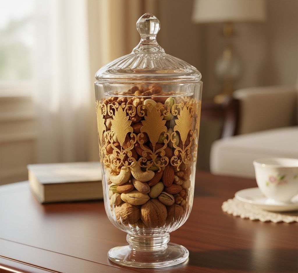 جرة زجاج أنيقة بتصميم شيك وعصري، مثالية لتقديم وحفظ الكاندي والمكسرات. منتج مستورد عالي الجودة.