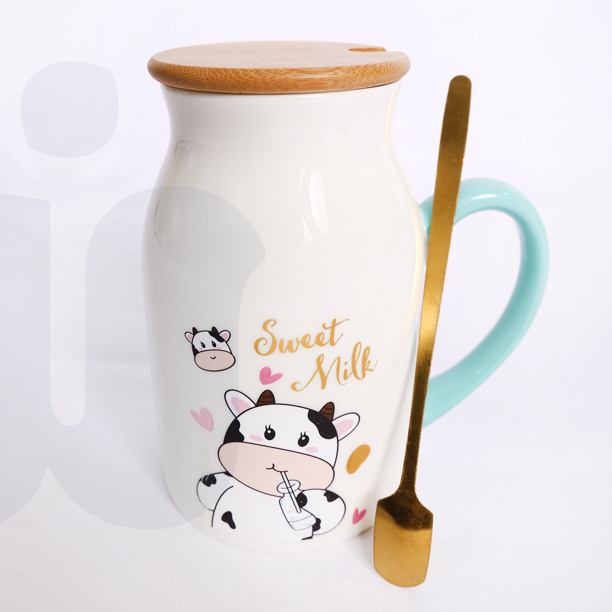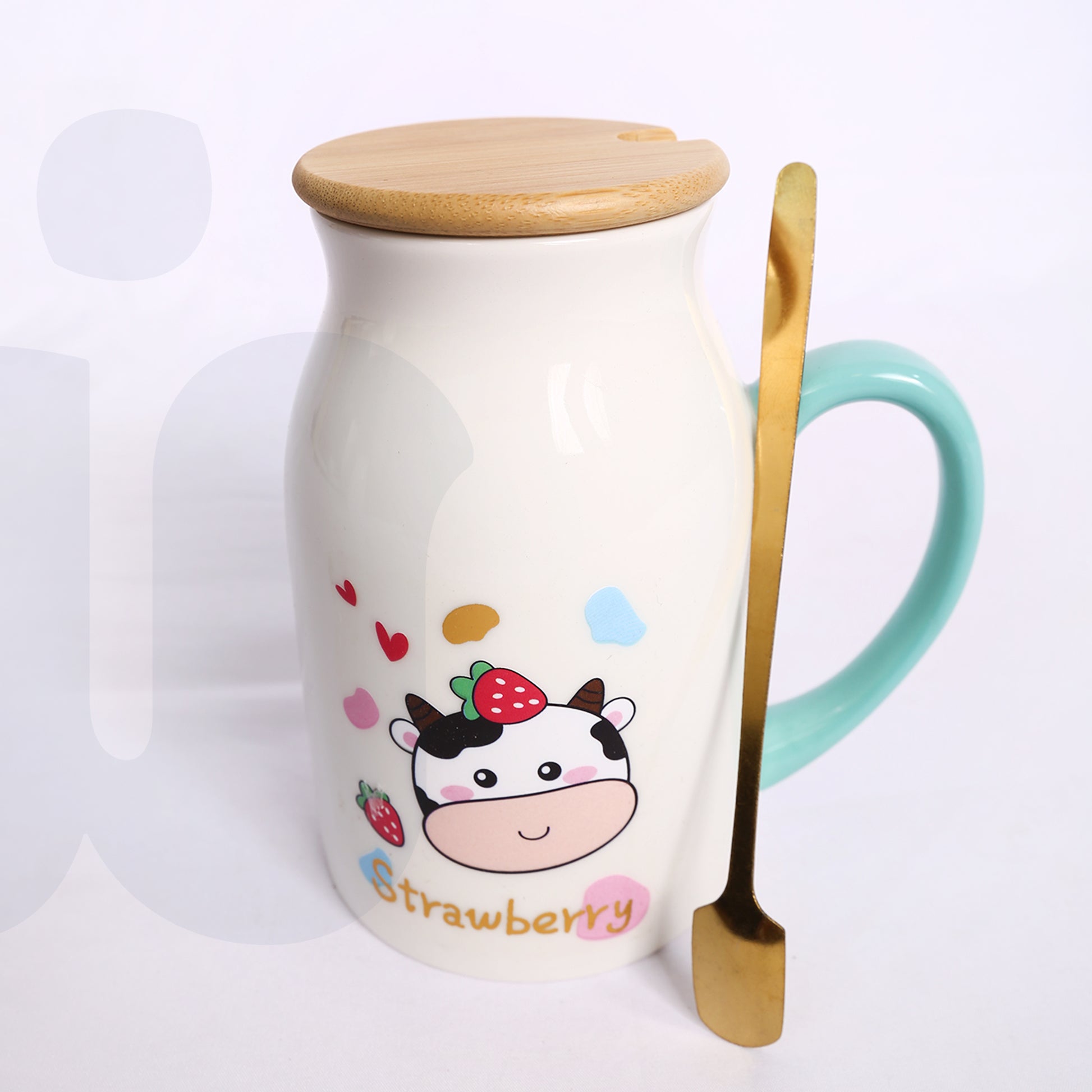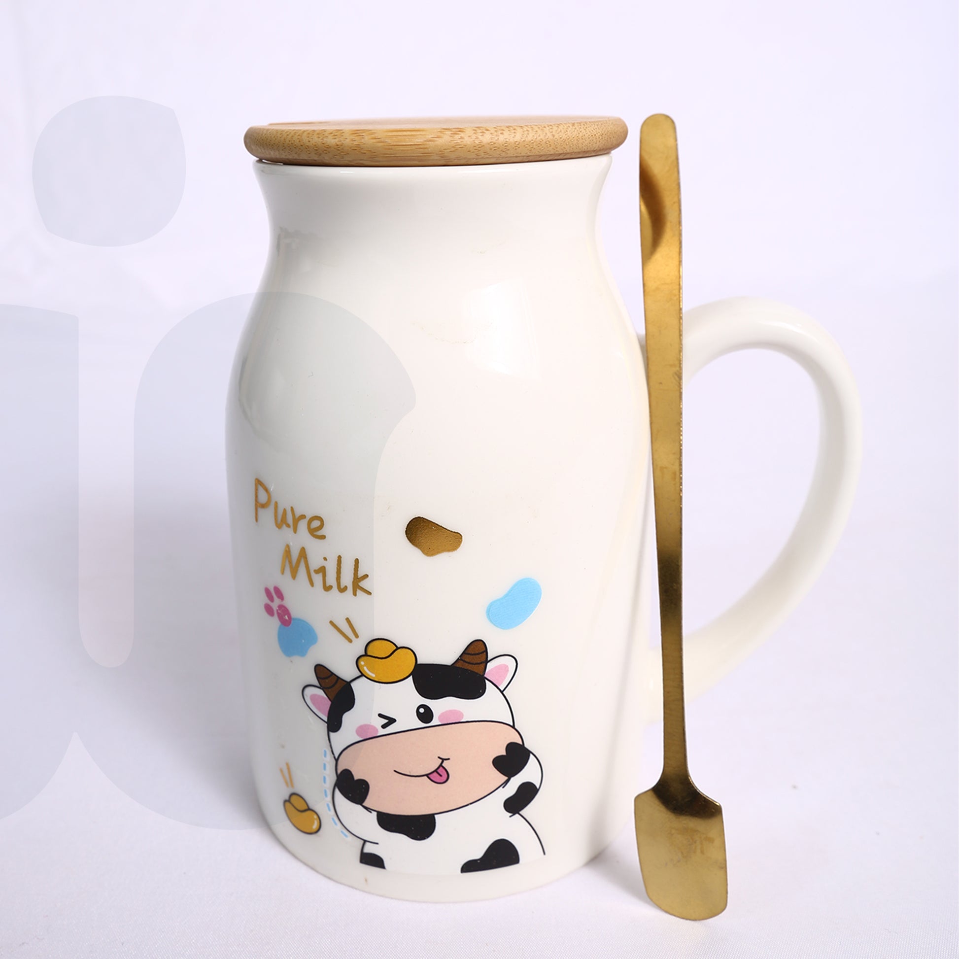 كوب بورسلين أشكال بقرة بغطاء خشب ومعلقة جولد – 470 مل
