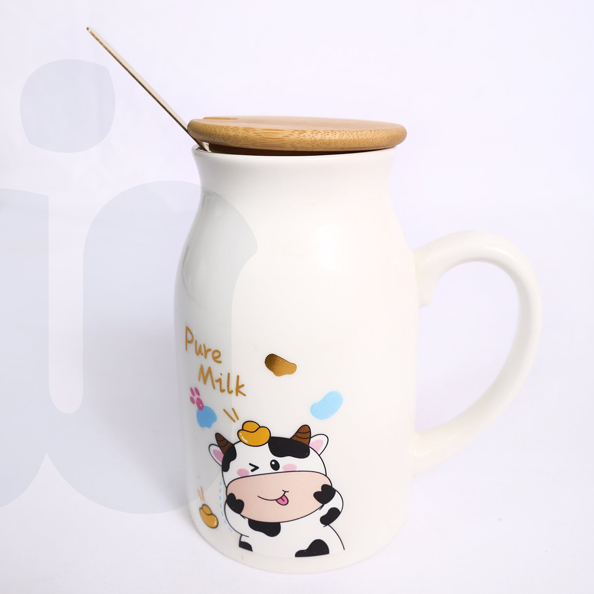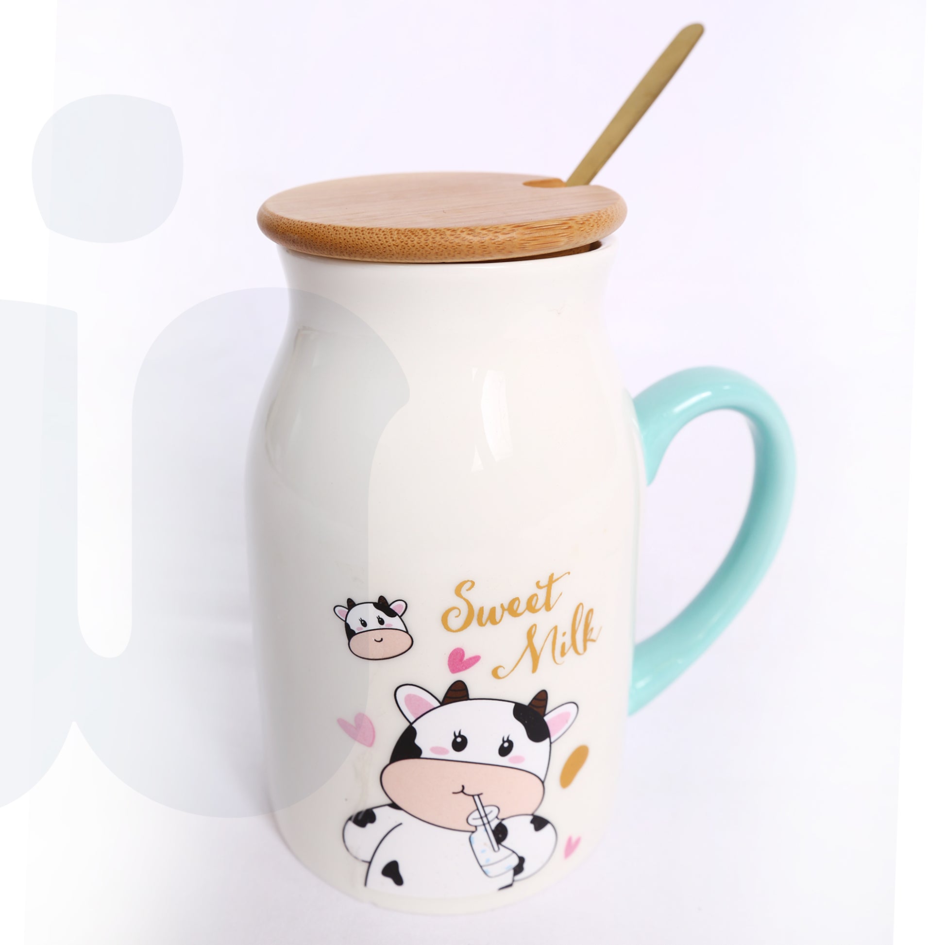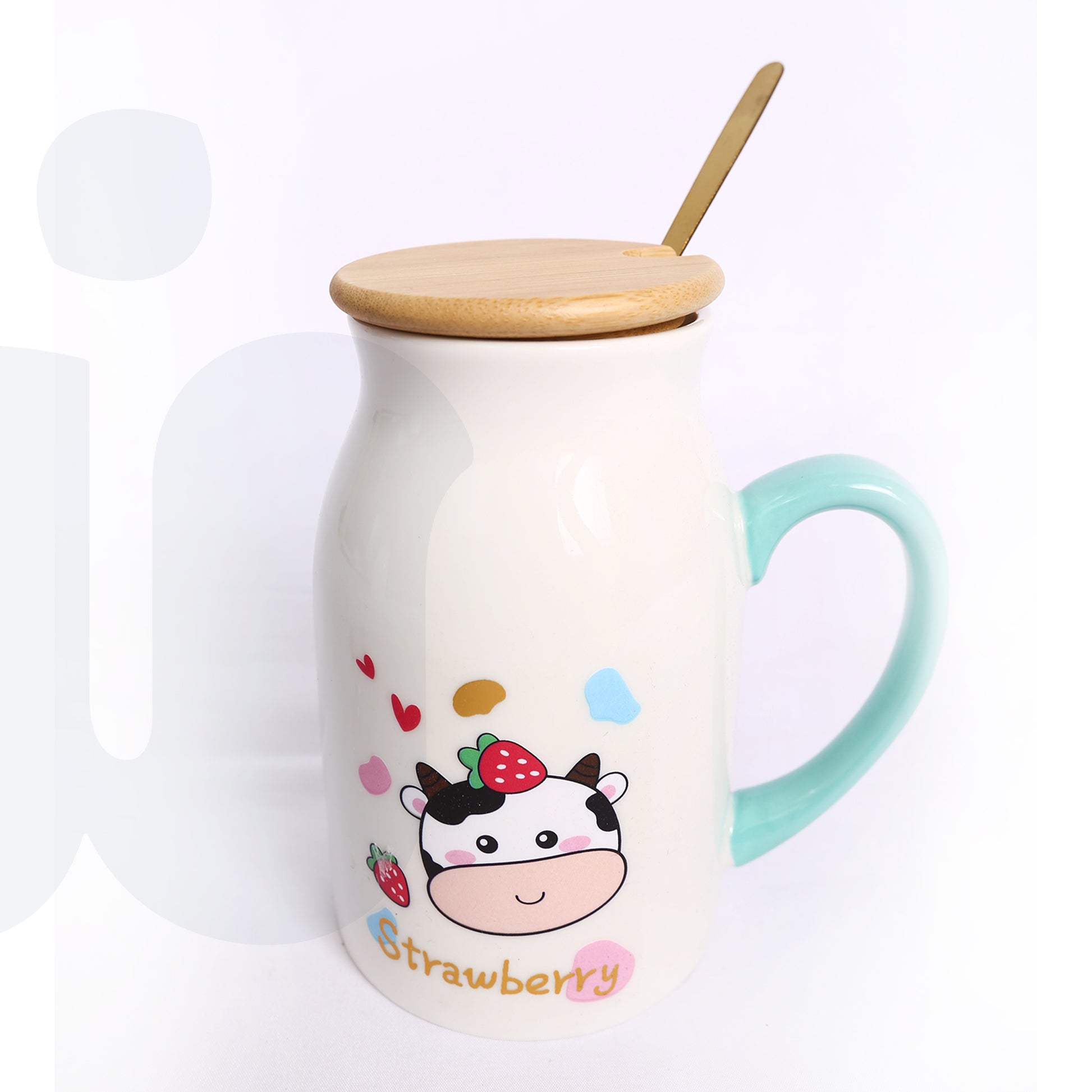 كوب بورسلين أشكال بقرة بغطاء خشب ومعلقة جولد – 470 مل