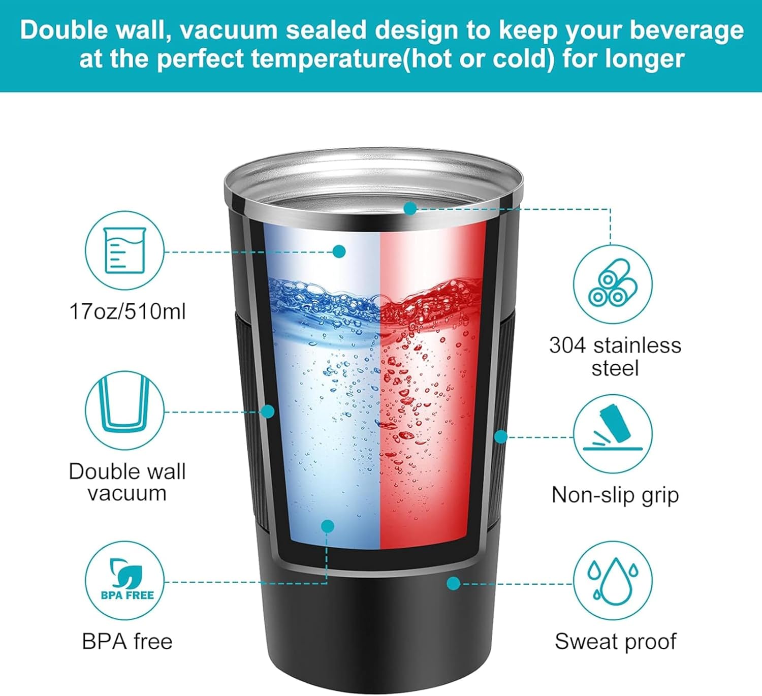 كوب قهوة حراري أنيق مصنوع من ستانلس ستيل عالي الجودة بتقنية العزل المفرغ، يحافظ على المشروبات الساخنة والباردة لفترات طويلة. يتميز بتصميم عصري ومتين مناسب للاستخدام اليومي في العمل، السيارة أو أثناء السفر. الغطاء محكم الإغلاق يمنع التسرب، مما يجعله خيارًا عمليًا لحمل القهوة، الشاي أو العصائر في أي وقت وأي مكان.