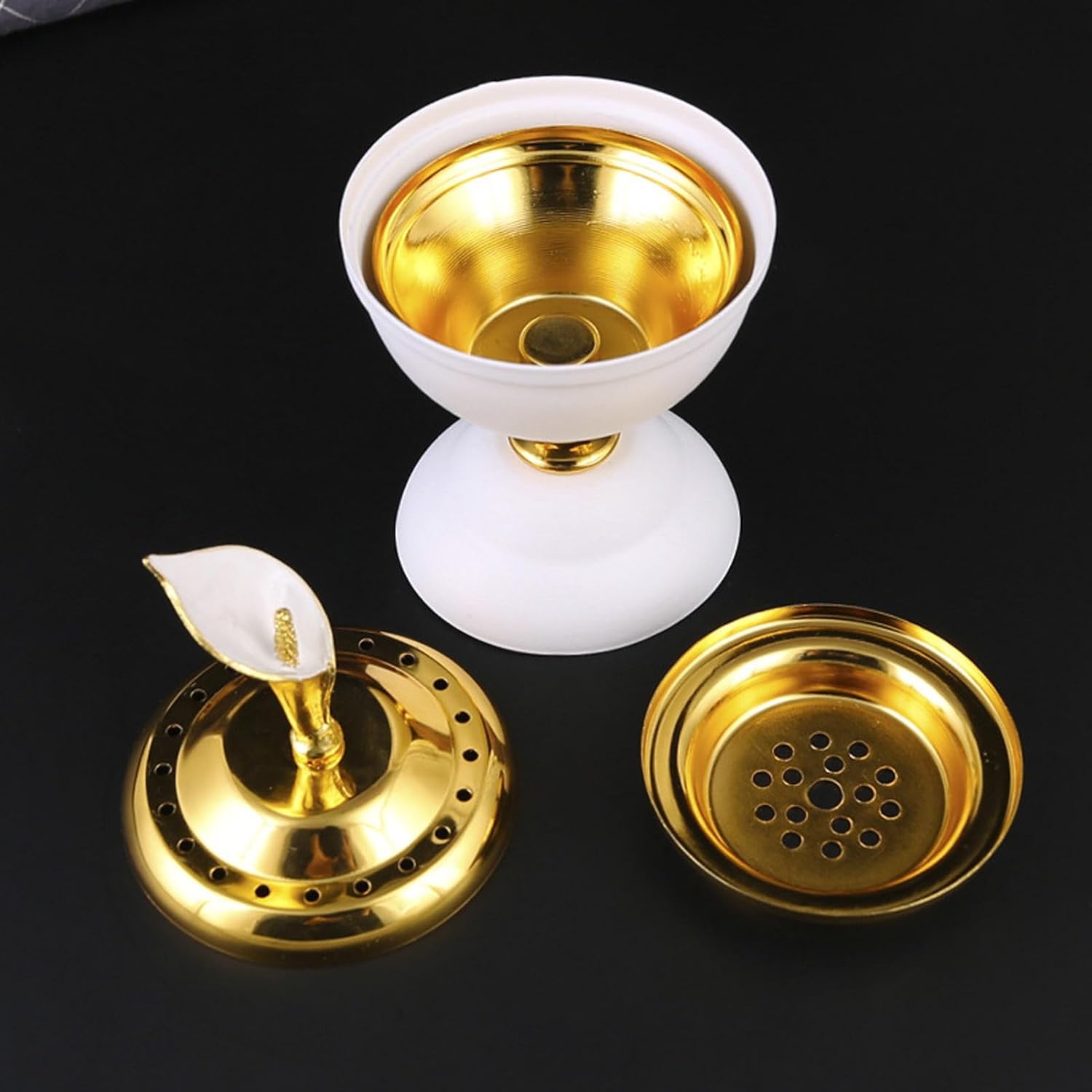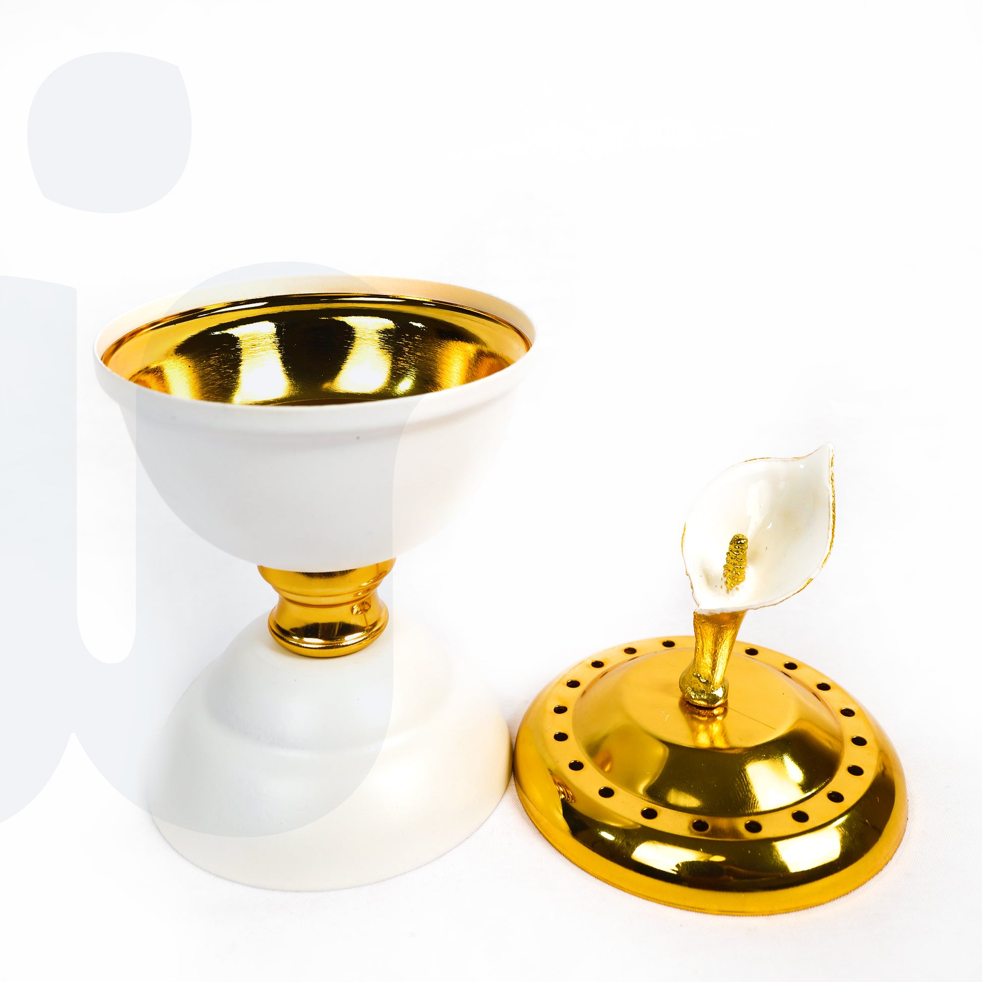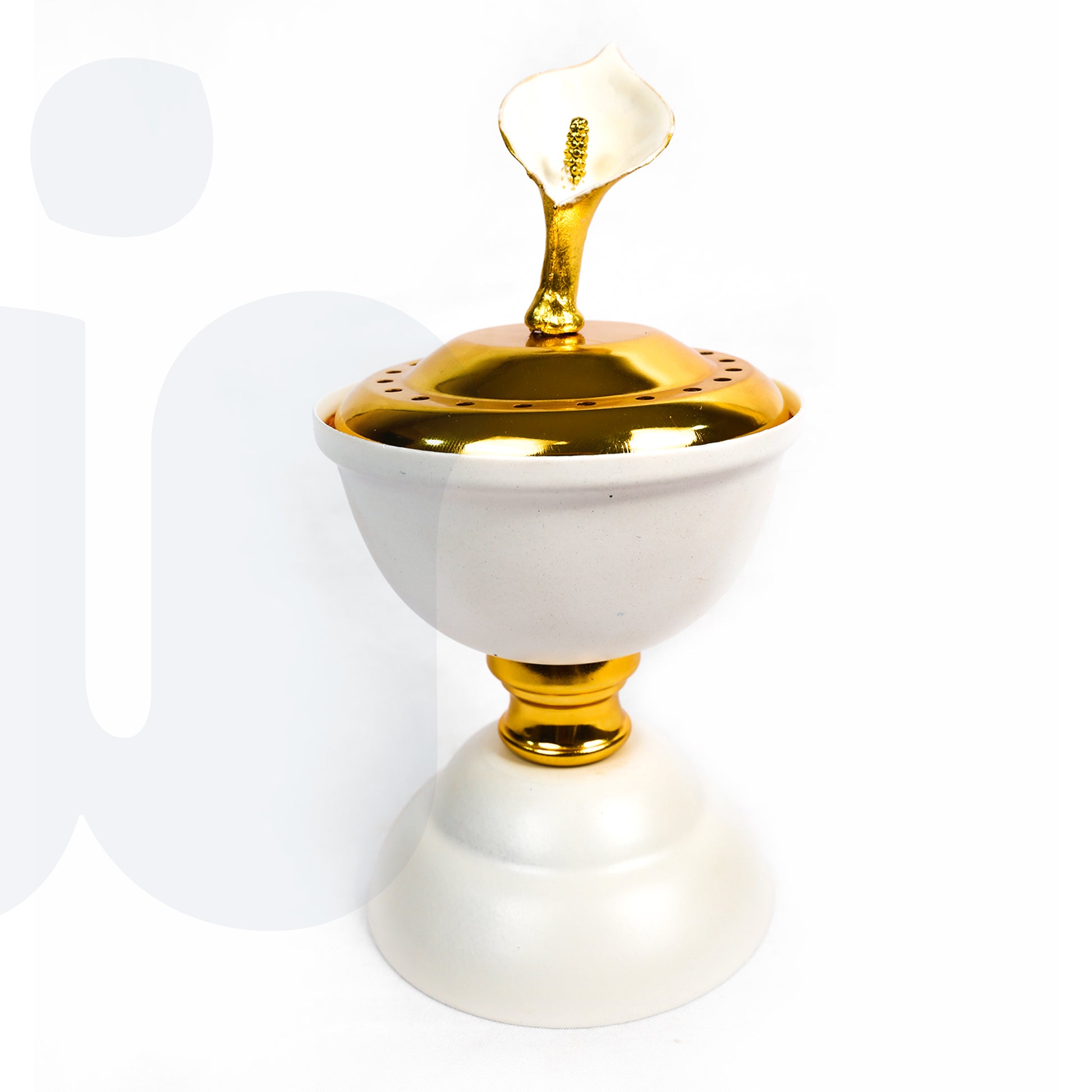 مبخرة أنيقة تجمع بين الفخامة والبساطة بتصميم عصري يجمع اللونين الأبيض والذهبي اللامع. مصنوعة من خامات عالية الجودة تتحمل الحرارة، وتأتي بغطاء مزخرف بزهرة أنيقة تضيف لمسة من الرقي والتميز لديكور المنزل. مثالية لاستخدامها في تعطير المجالس والغرف بروائح البخور الفاخرة.