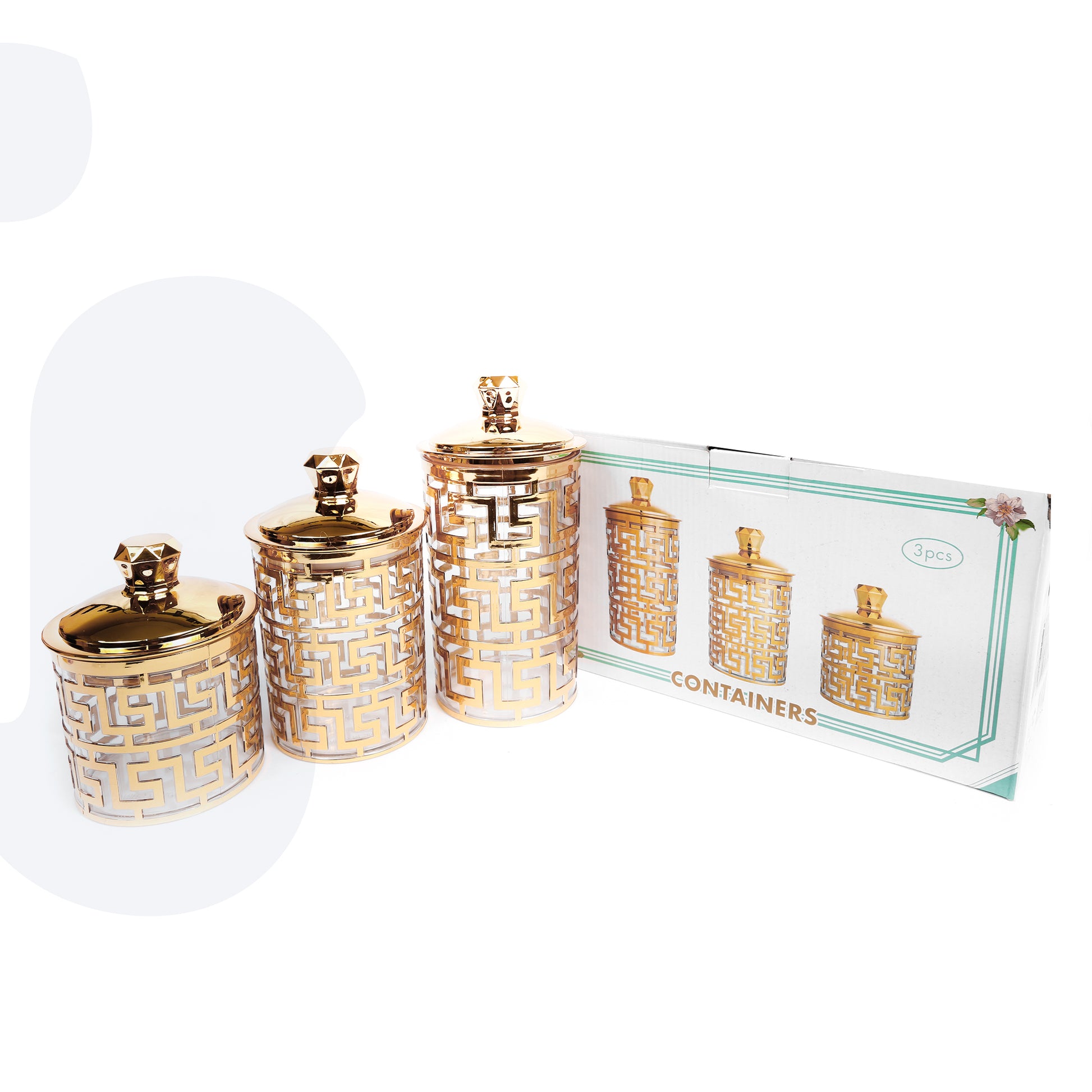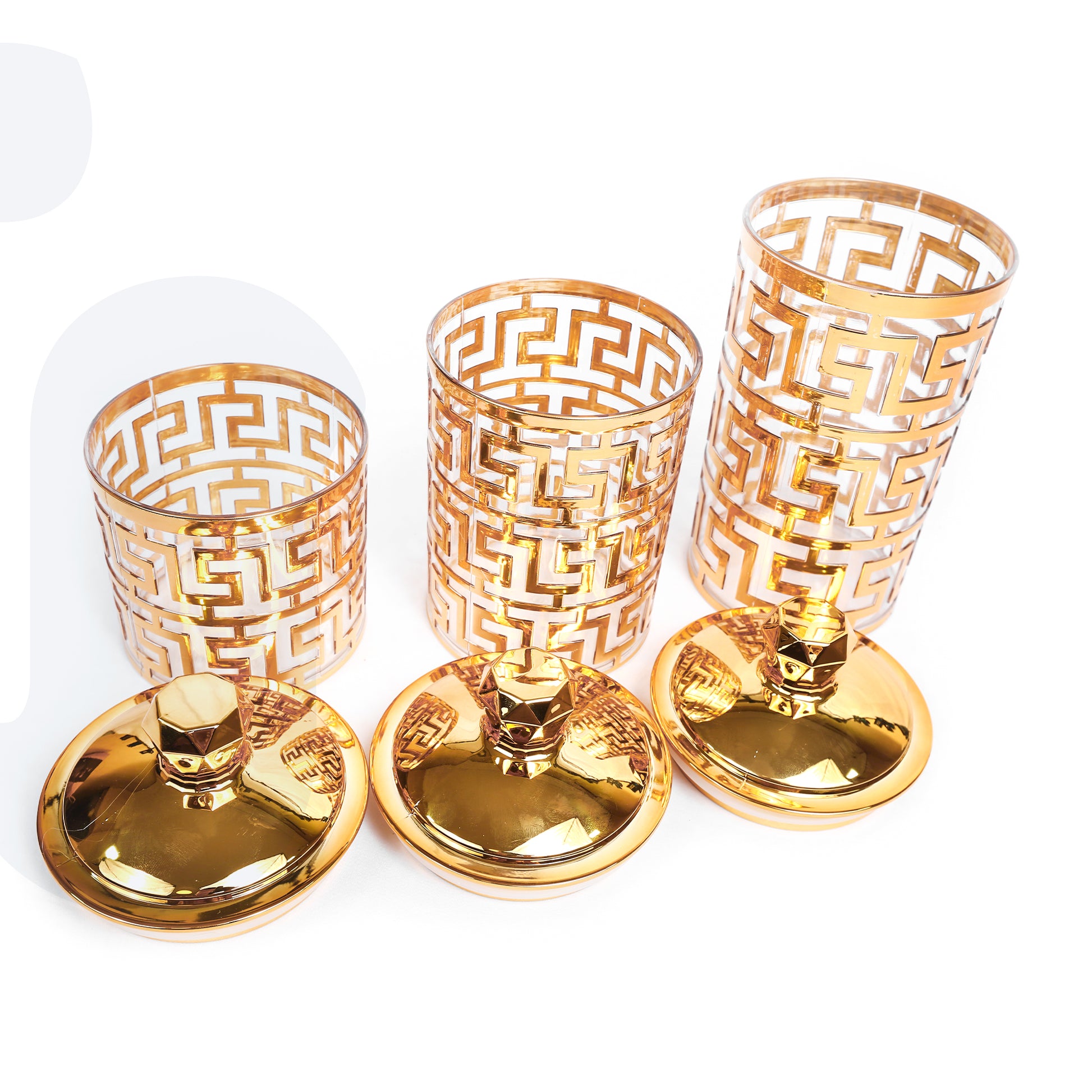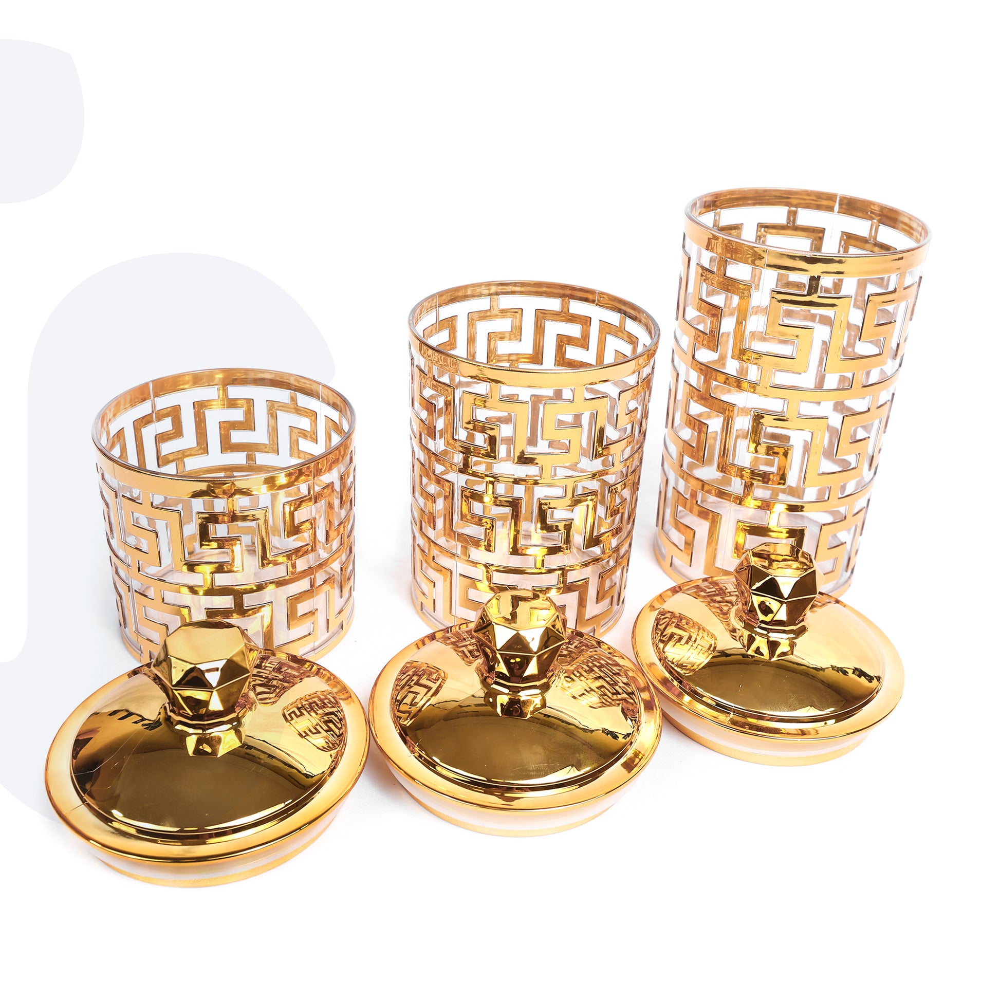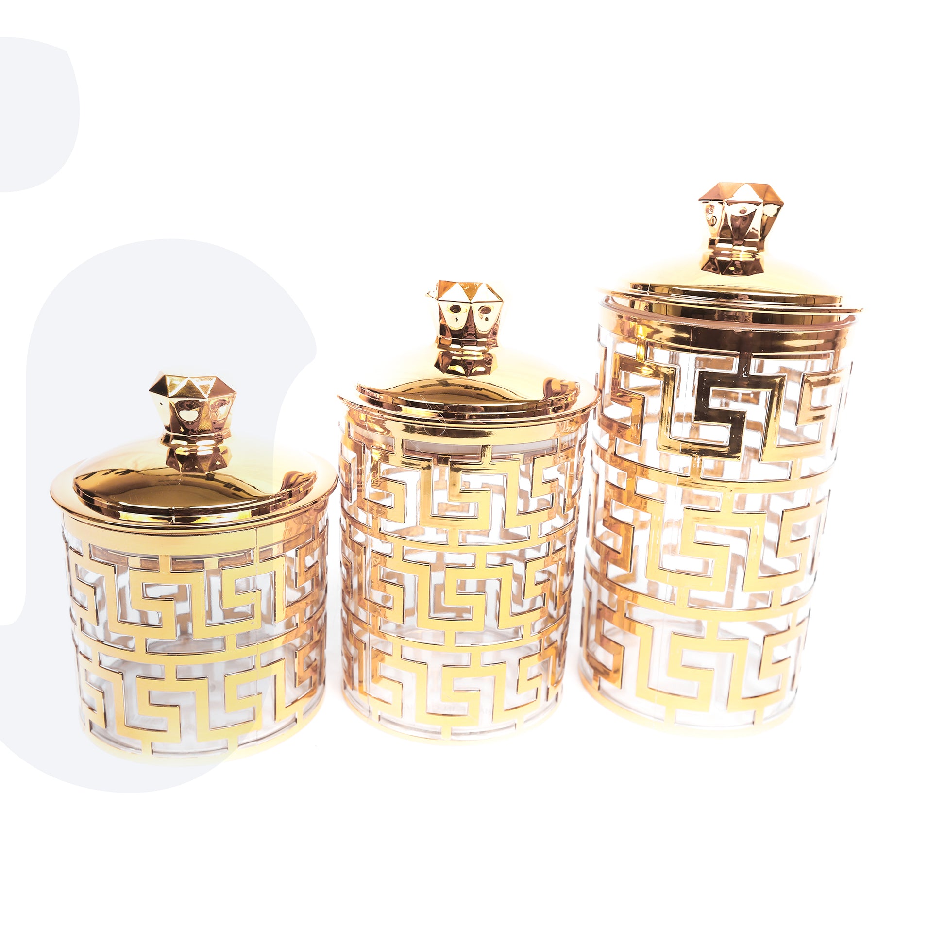 مجموعة أنيقة من أوعية الحلوى المصنوعة من الأكريليك الشفاف عالي الجودة، مزينة بنقوش ذهبية فاخرة تضيف لمسة من الفخامة إلى ديكور المطبخ أو غرفة المعيشة. تتضمن 3 قطع بأحجام مختلفة مع أغطية محكمة الغلق لحفظ الحلوى أو المكسرات أو الحلويات بأناقة وتنظيم مثالي.