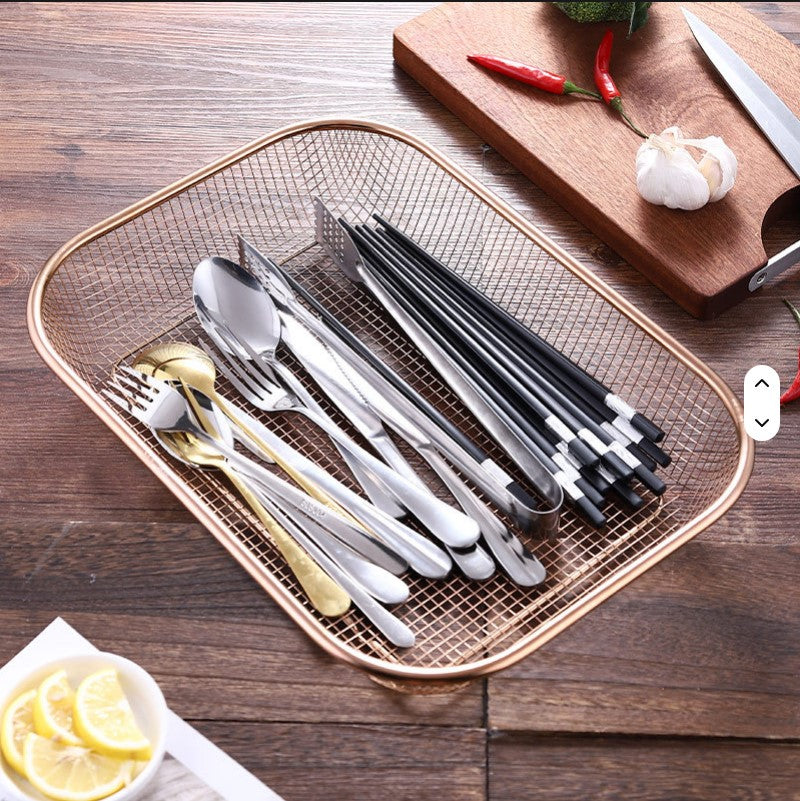 منظم أدوات مطبخ أنيق ، مصمم لتخزين أدوات المائدة مثل الملاعق، الشوك، السكاكين، والعيدان بشكل منظم وأنيق. يمكن استخدامه على سطح المكتب أو داخل الأدراج لتنظيم أدوات المطبخ أو المكتب. مصنوع من المعدن المتين لضمان المتانة وطول العمر مع تصميم عصري يضيف لمسة فخمة للمكان.