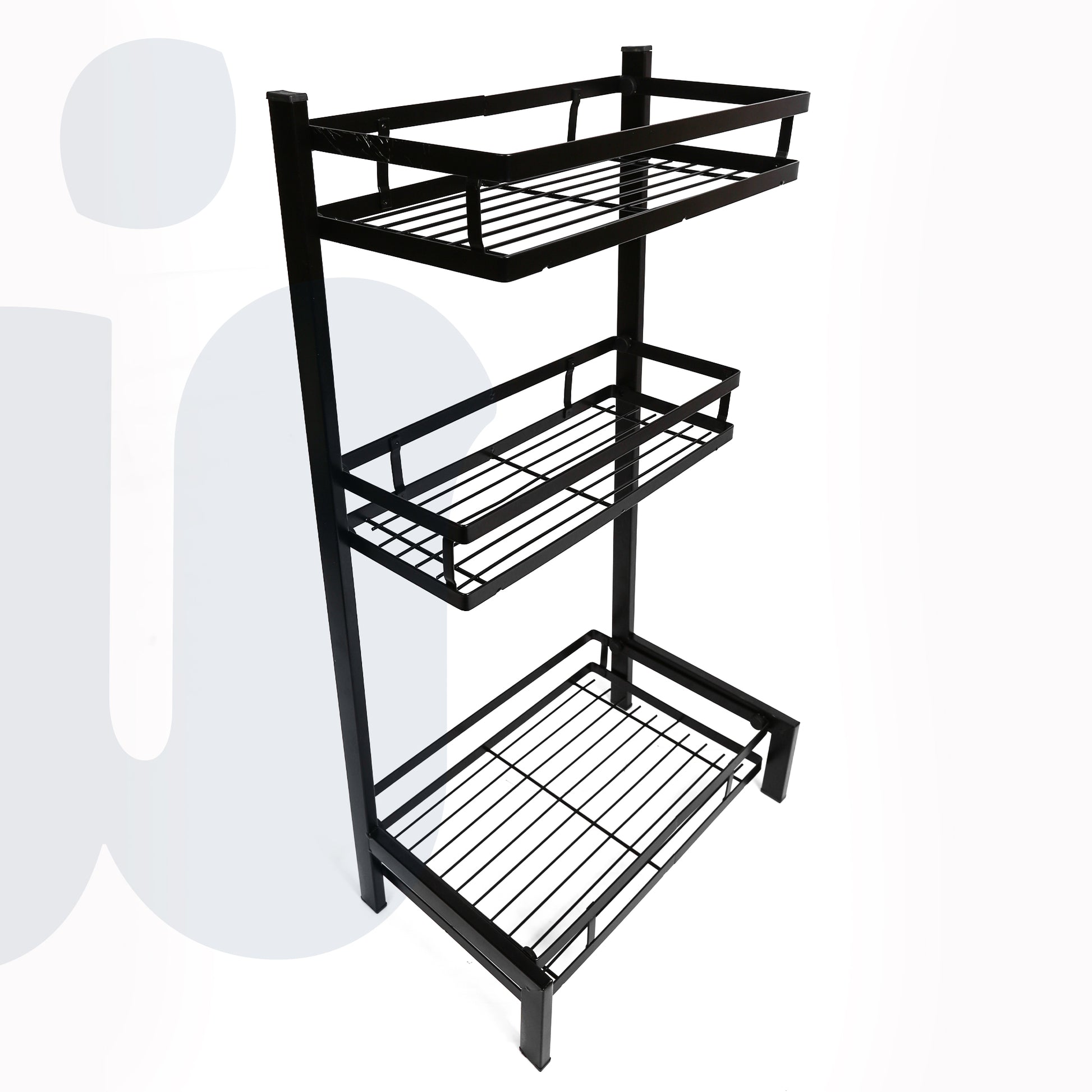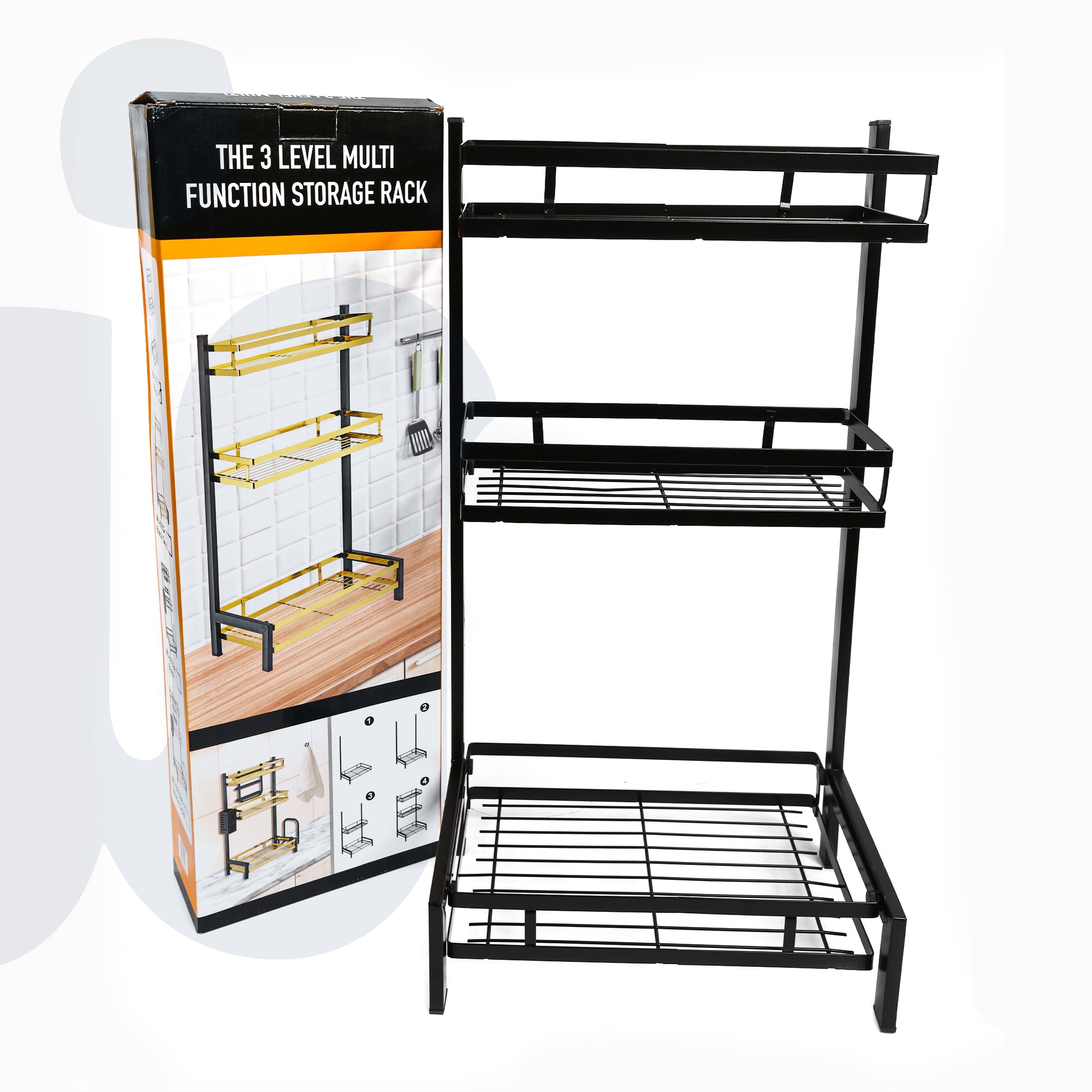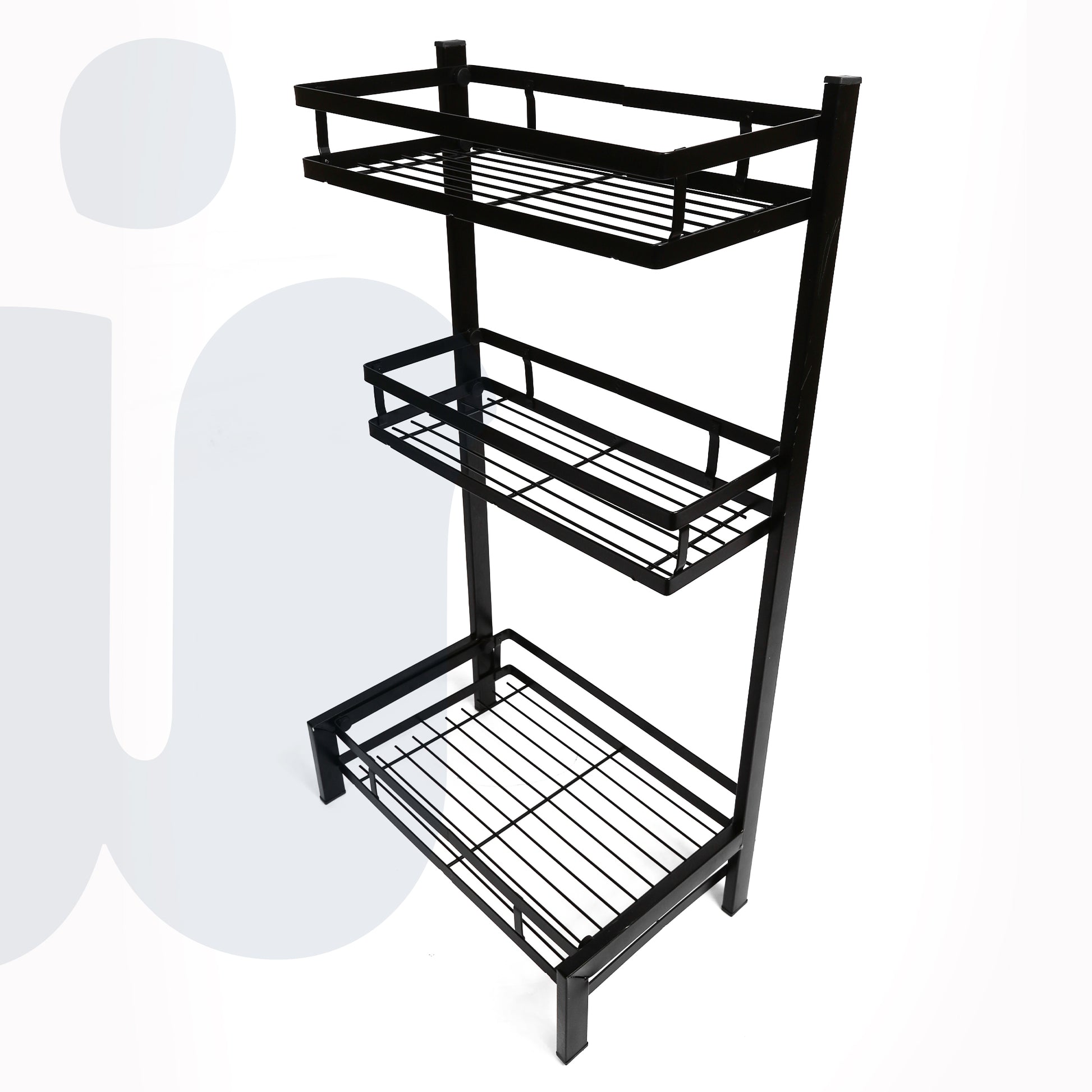 منظم توابل أنيق وعصري مصنوع من المعدن المتين باللون الأسود، يتميز بتصميم ثلاثي الأرفف لتوفير مساحة تخزين إضافية وتنظيم فعال. مثالي لترتيب التوابل أو الزيوت أو الأدوات الصغيرة في المطبخ بطريقة مرتبة وأنيقة.