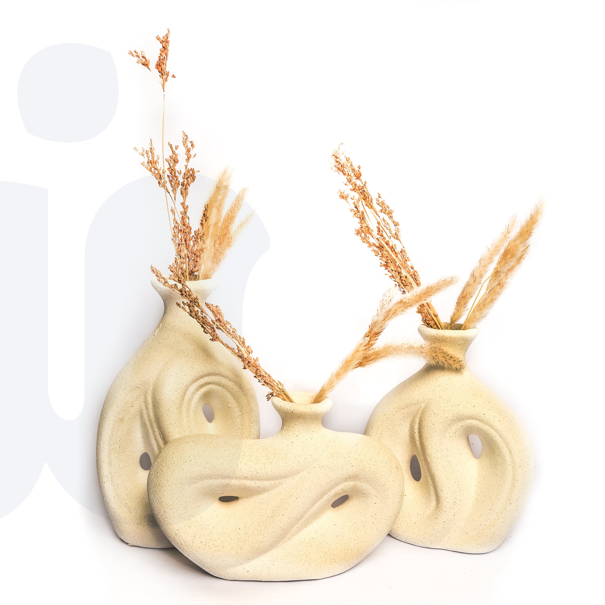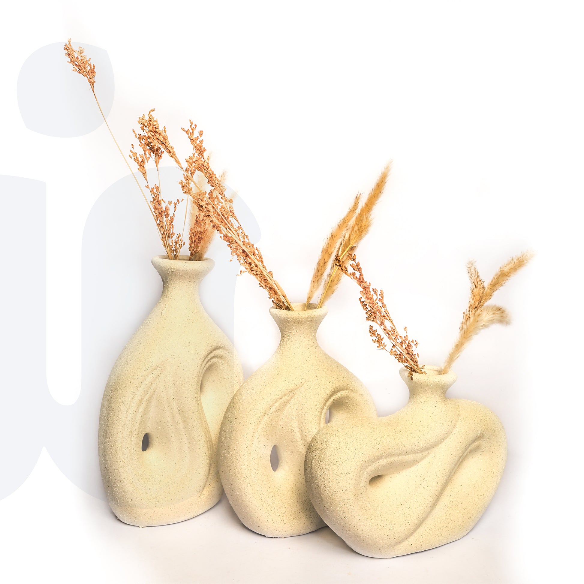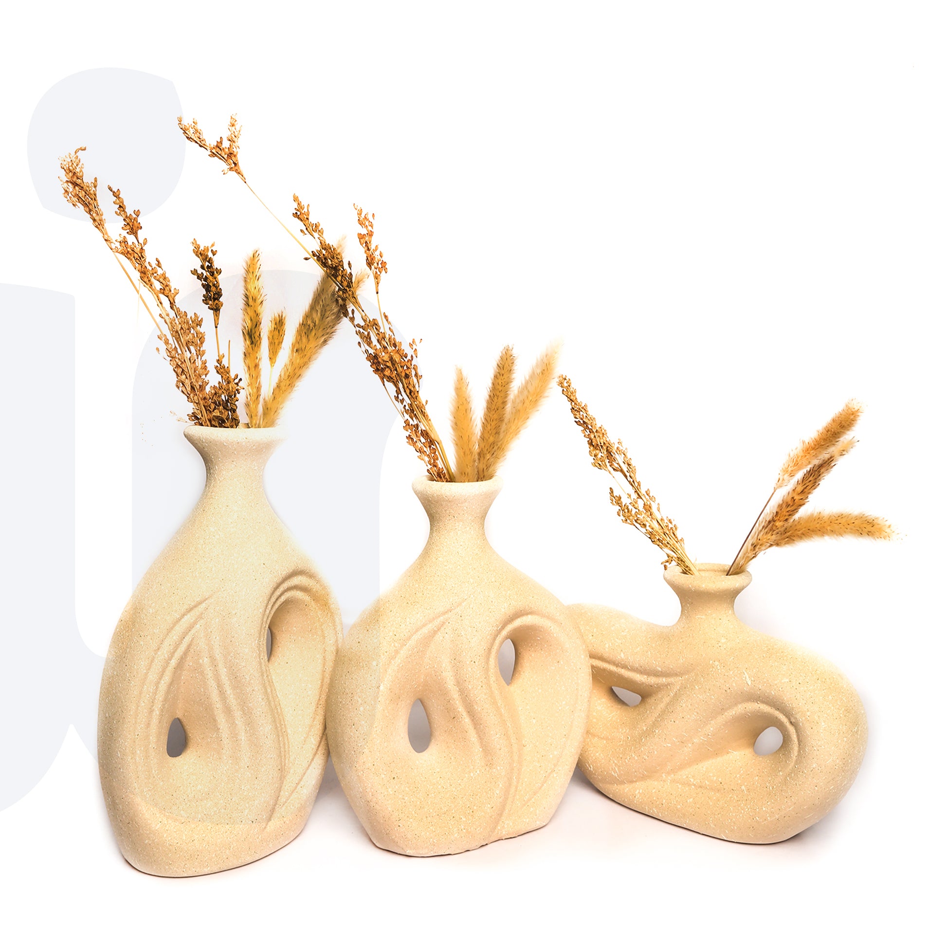 مجموعة من ثلاث فازات باللون Beige الراقي، تصميمها خرافي يجمع بين الأناقة والعصرية. كل فازة تضيف لمسة دافئة وهادئة لأي مساحة، مناسبة لترتيب الزهور القصيرة والطويلة أو للديكور بدون زهور، لتخلق تناغم فريد يبرز ذوقك الراقي في كل ركن من المنزل أو المكتب.