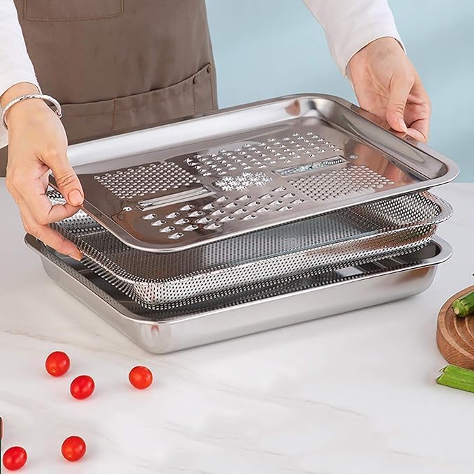 متعدد الوظائف 3 في 1: يجمع الطقم بين المبشرة، المصفاة، والوعاء، مما يجعله أداة متكاملة لجميع مهام تحضير الطعام.