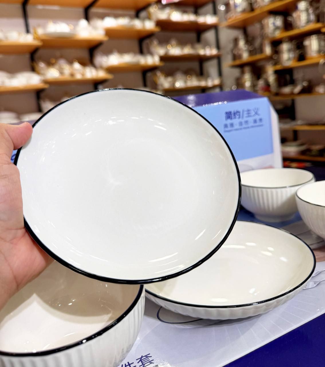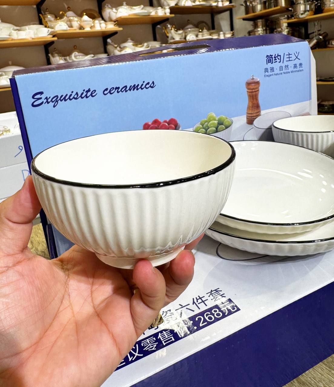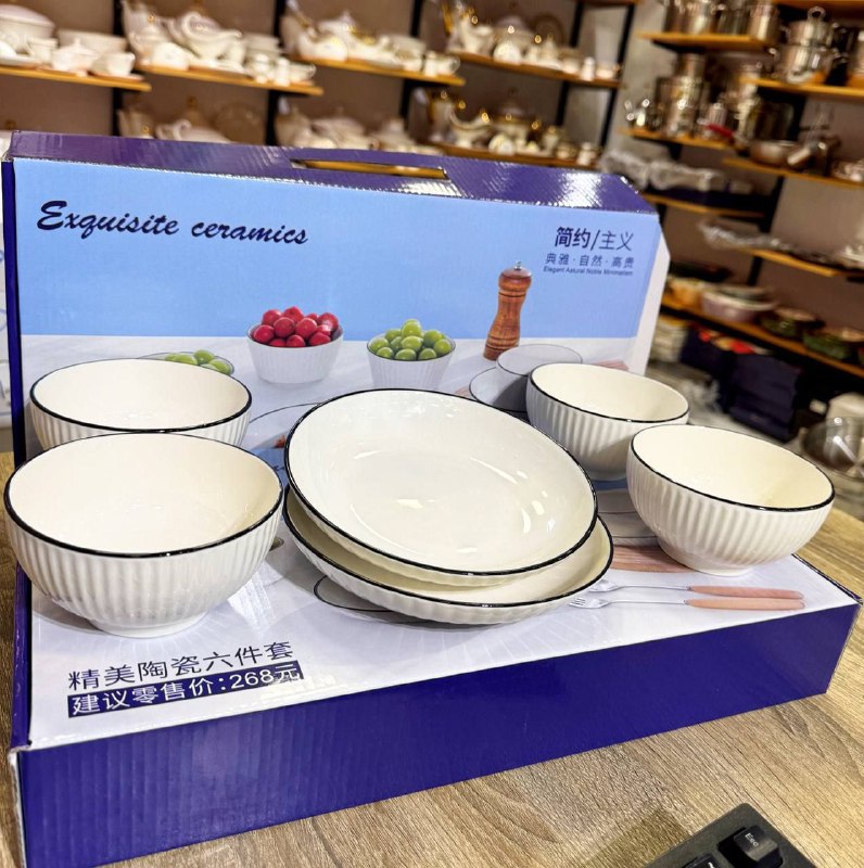 طقم فطار بورسلين بتصميم مضلع عصري وأنيق، مثالي للاستخدام اليومي والمناسبات. الطقم يتضمن 4 بوالٍ و2 طبق مسطح، ويأتي في علبة شيك للتقديم أو الهدايا. يمكن استخدامه بأمان في الميكروويف وغسالة الأطباق.