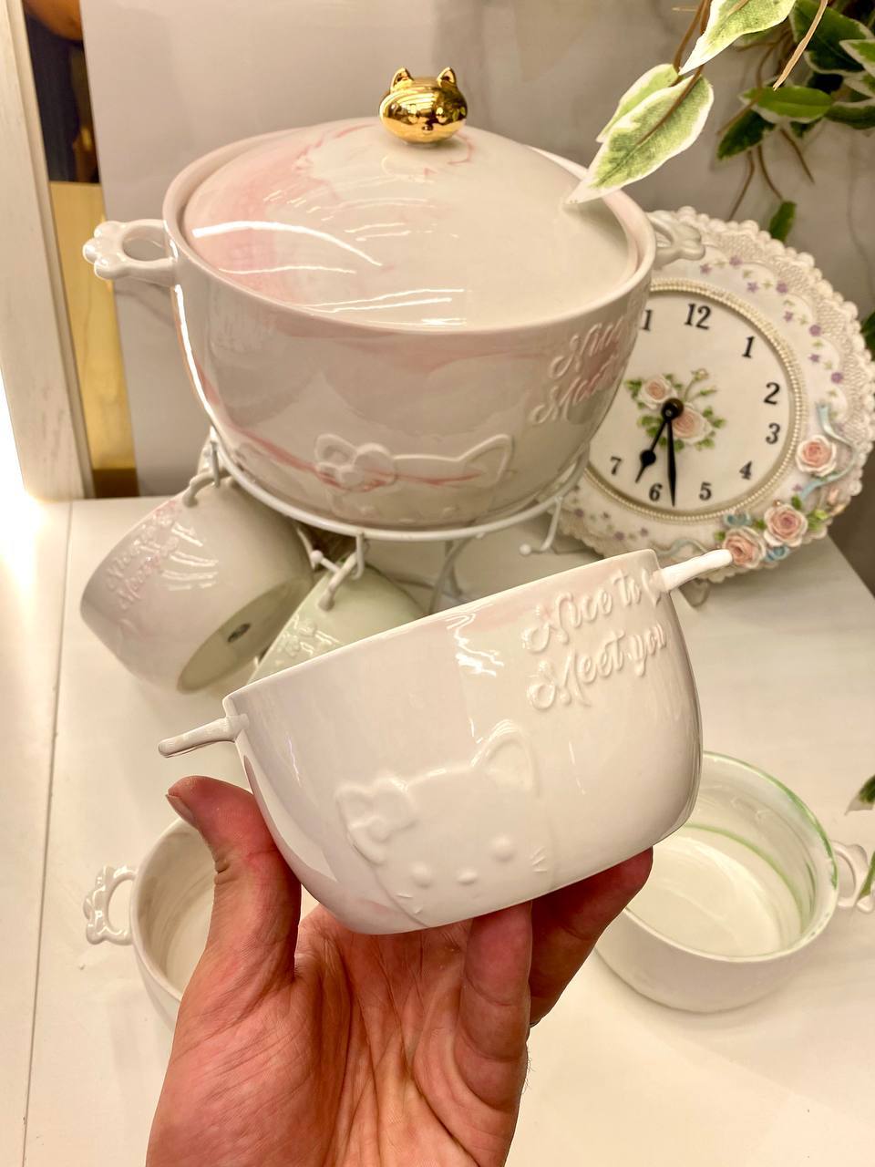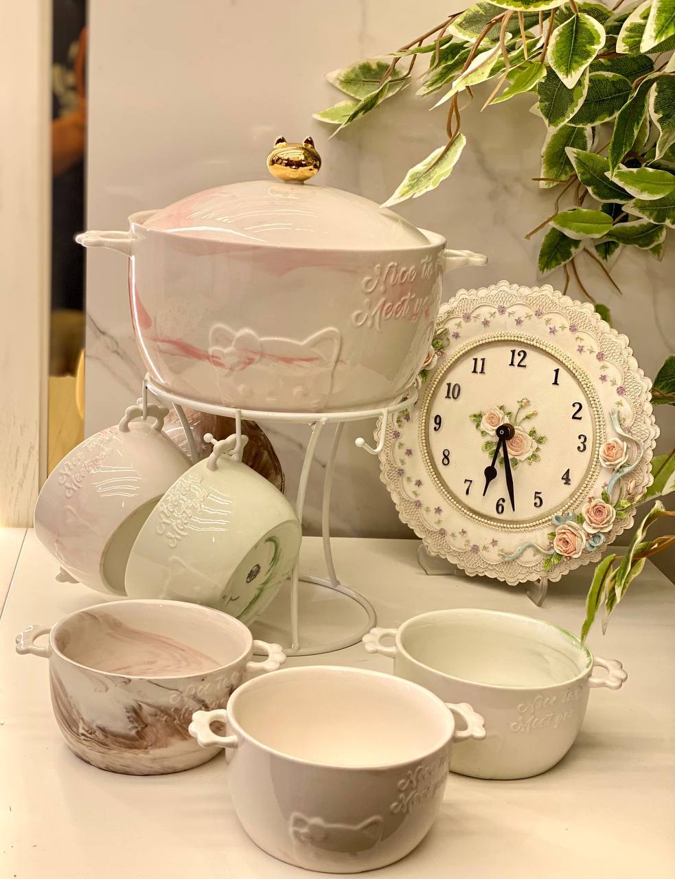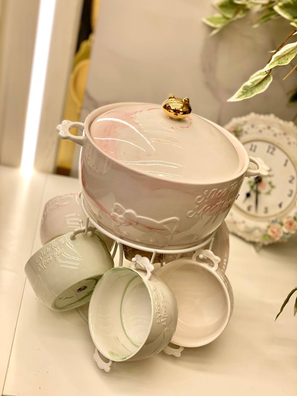 يشمل 6 مجات كبيرة وحلة شوربة كبيرة مع استاند للتقديم