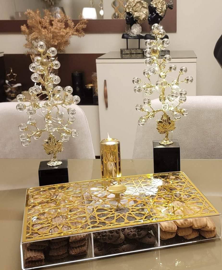 علبة تقديم فاخرة مصنوعة من الأكريليك الشفاف بتصميم أنيق ومقسم داخليًا إلى 6 خانات مع غطاء أربيسك باللون الذهبي تضيف لمسة راقية للمائدة مثالية لتقديم الكحك والتسالي والبسكويت والمكسرات كما تضيف لمسة ديكور أنيقة في المناسبات والعزومات