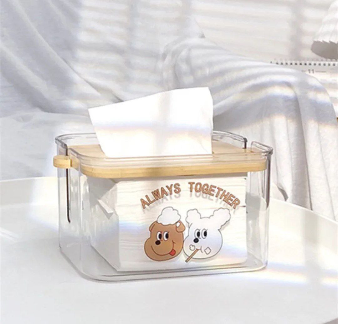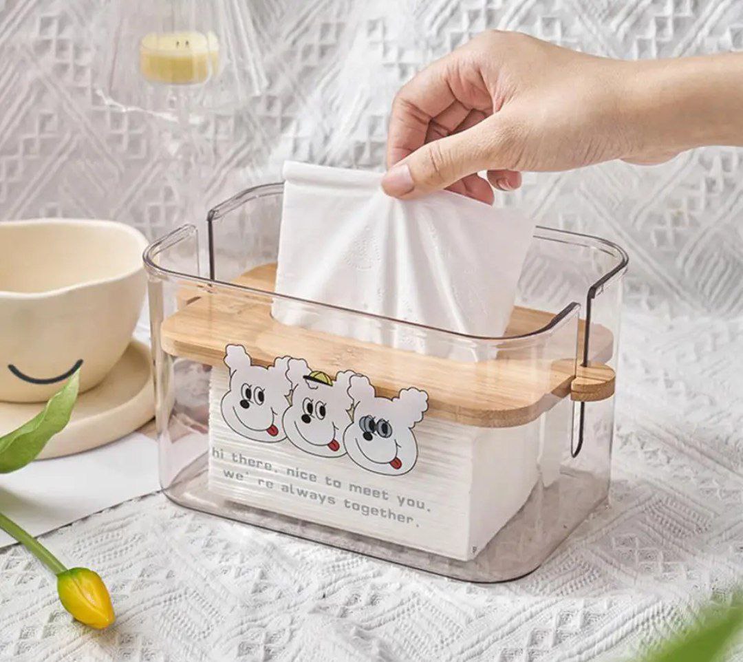 علبة مناديل مصنوعة من الأكريليك عالي الجودة، مقاومة للكسر وتتمتع بتصميم دبدوب جذاب يضيف لمسة جمالية لأي مكان. مزودة بغطاء خشب بامبو متين مع آلية غطاء متحرك تساعد على ضغط المناديل للأسفل لتسهيل السحب والاستخدام اليومي. تصميم عملي ومناسب لغرف النوم، الصالون، المكتب أو الحمام. يتم اختيار الشكل عشوائياً حسب المتوفر.