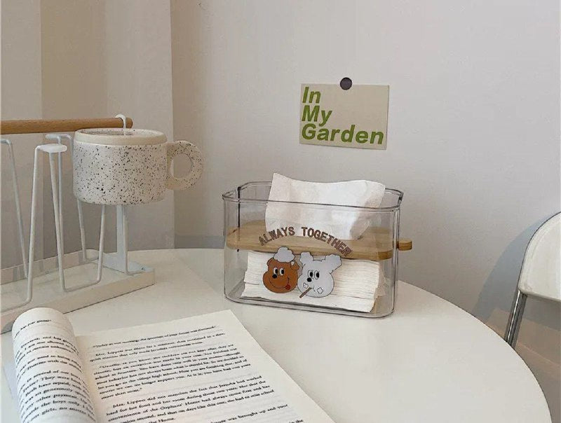 علبة مناديل أكريليك دبدوب بغطاء خشب بامبو