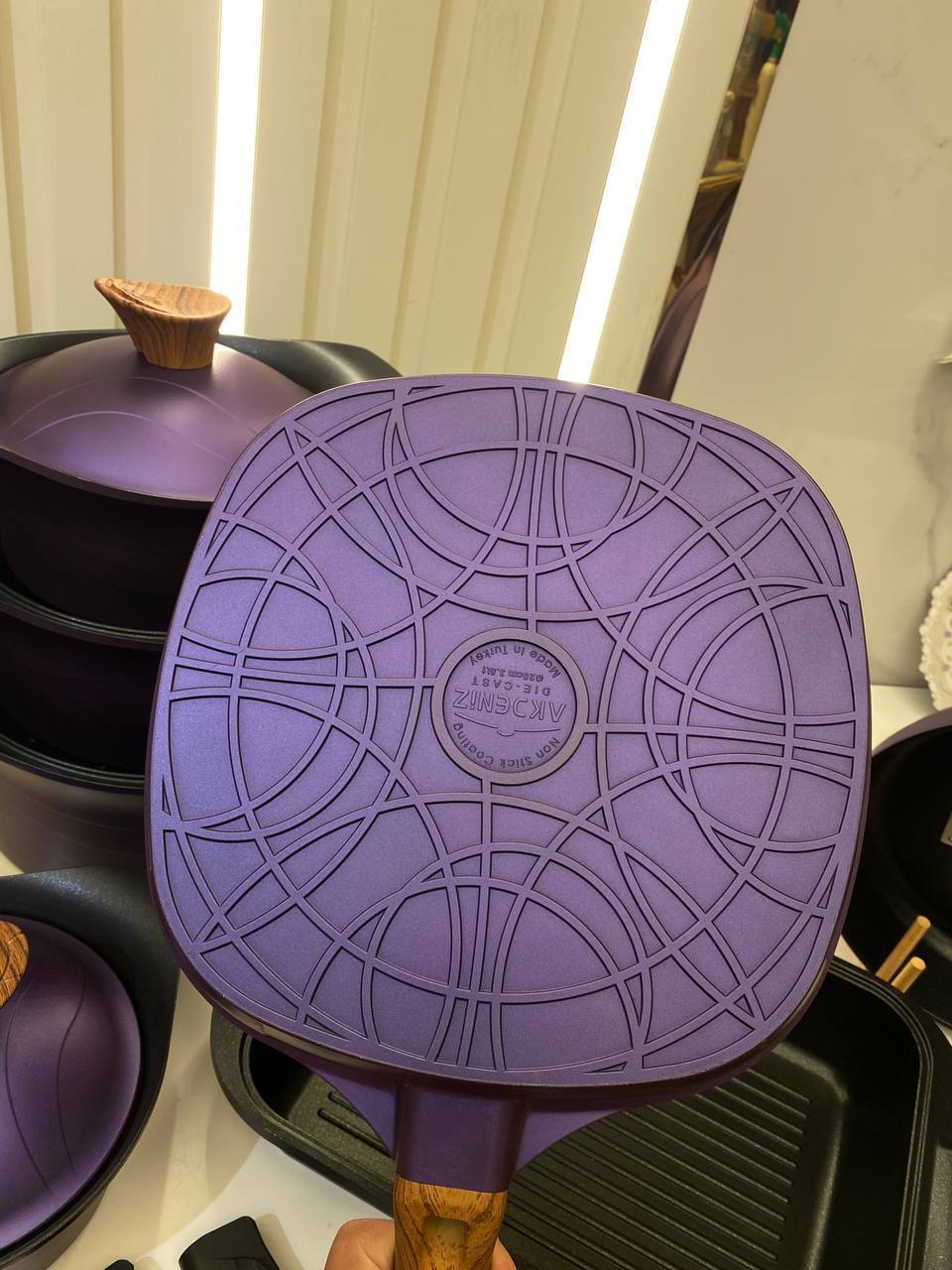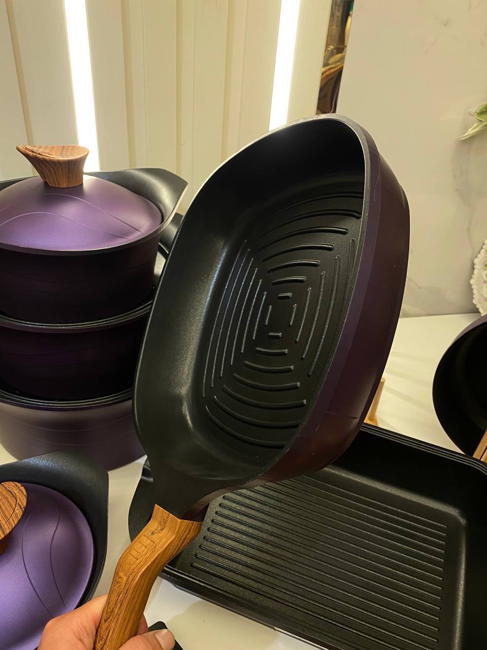 طقم حلل فاخر مصنوع من التيتانيوم عالي الجودة يتميز بطلاء غير قابل للخدش وخالٍ تمامًا من الرصاص مما يجعله آمنًا وصحيًا للاستخدام اليومي يتمتع الطقم بقاعدة حرارية قوية تساعد على توزيع الحرارة بالتساوي وتسريع عملية الطهي كما أن السطح غير اللاصق يمنع التصاق الطعام ويسهل تنظيفه