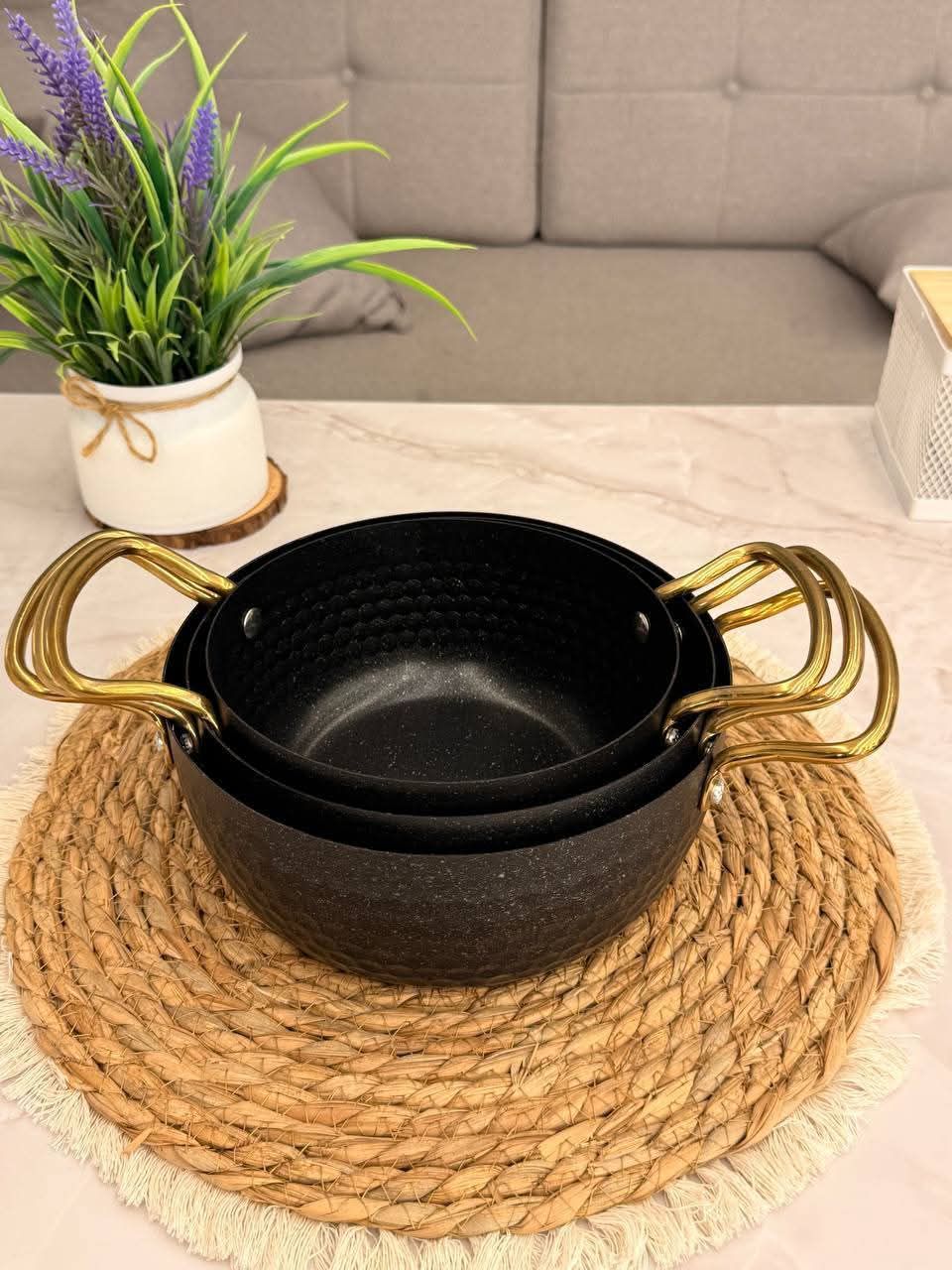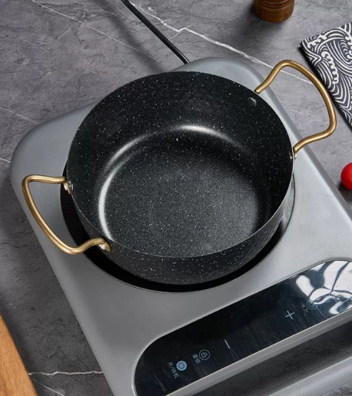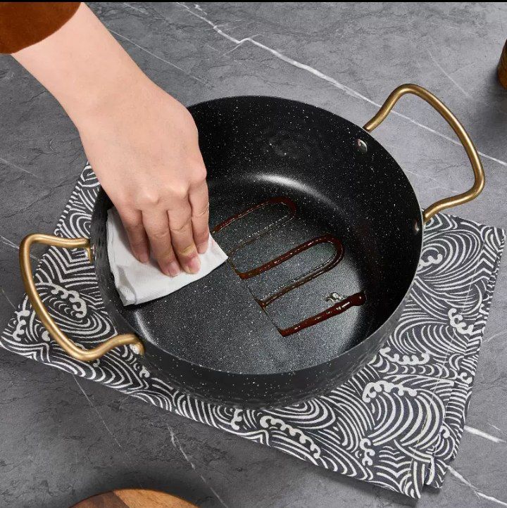 ووك أنيق مصنوع من استيل معدني مط عالي الجودة، يتميز بيد ذهبية فاخرة تمنحه مظهرًا جذابًا ومناسبًا للتقديم والاستخدام اليومي، كما يمكن استخدامه على النار مع وجود الشياطة فقط لضمان السلامة والحفاظ على جودته