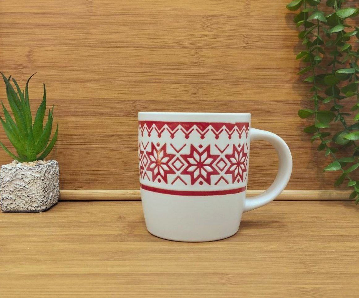 مج سيراميك بنقشة الثلج باللونين الأحمر والأبيض