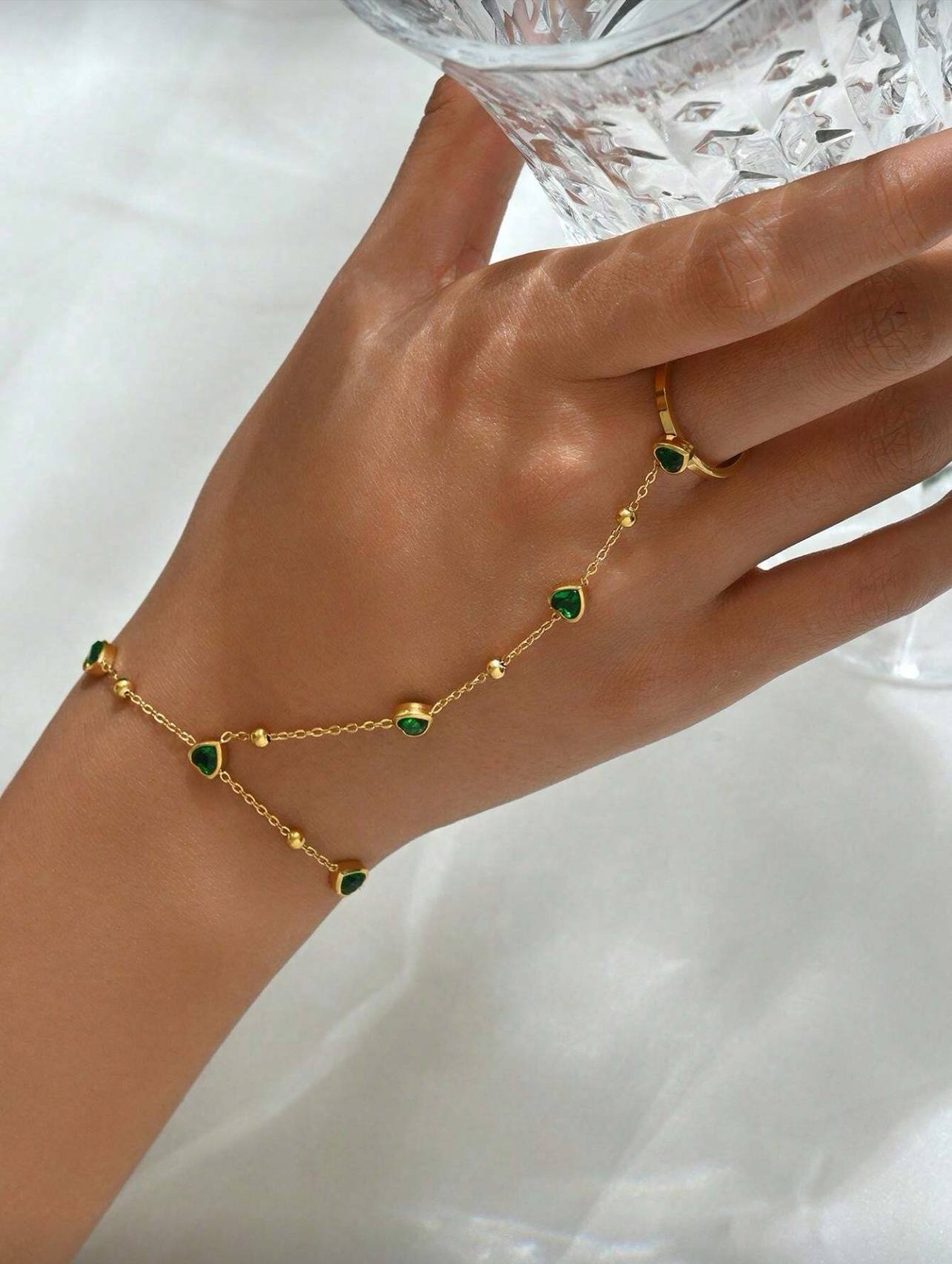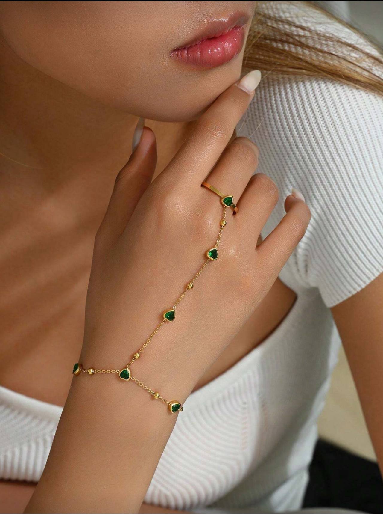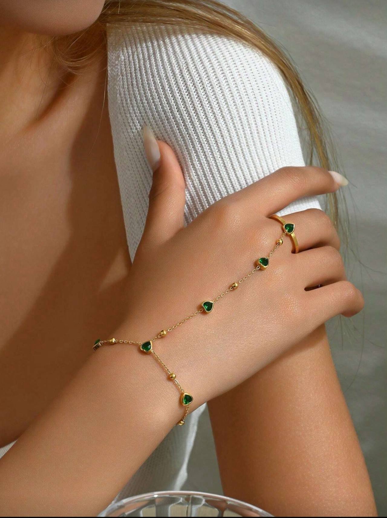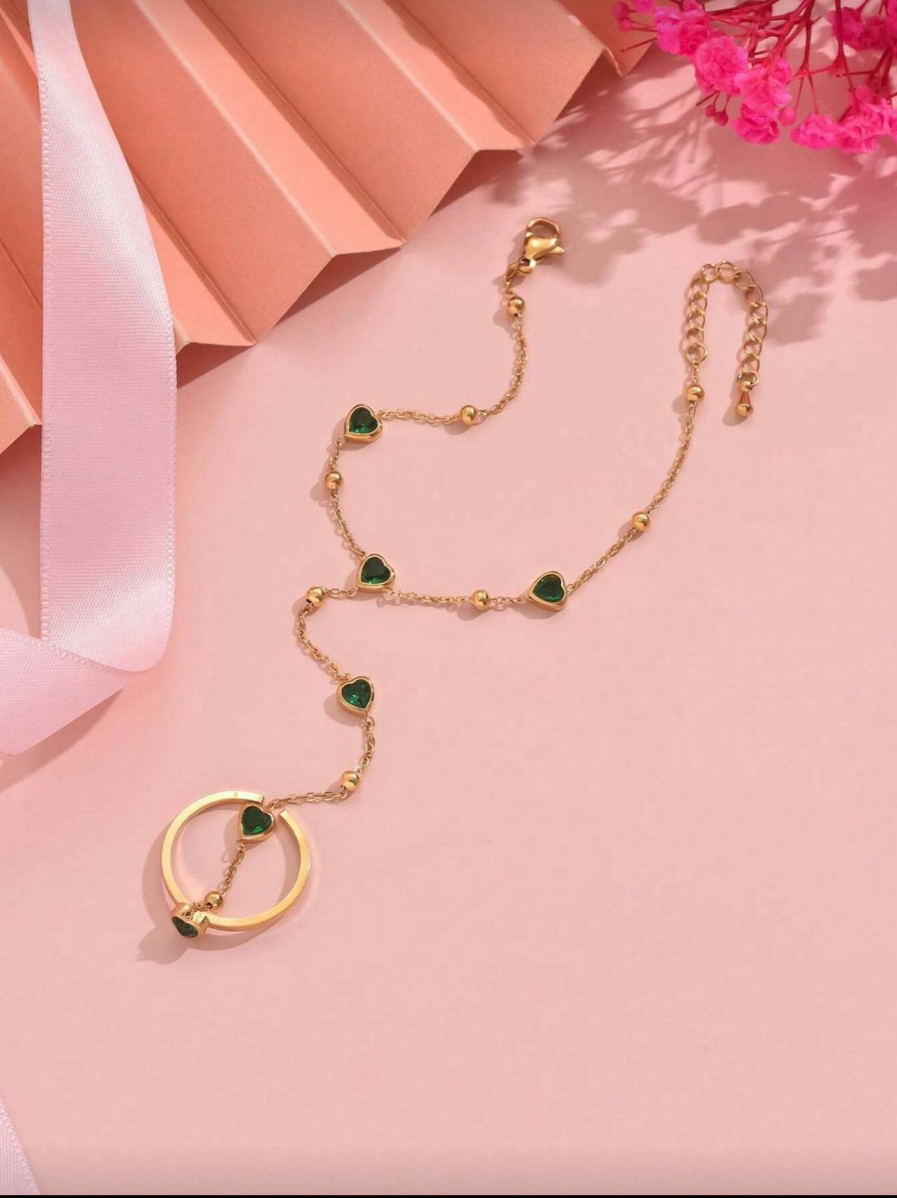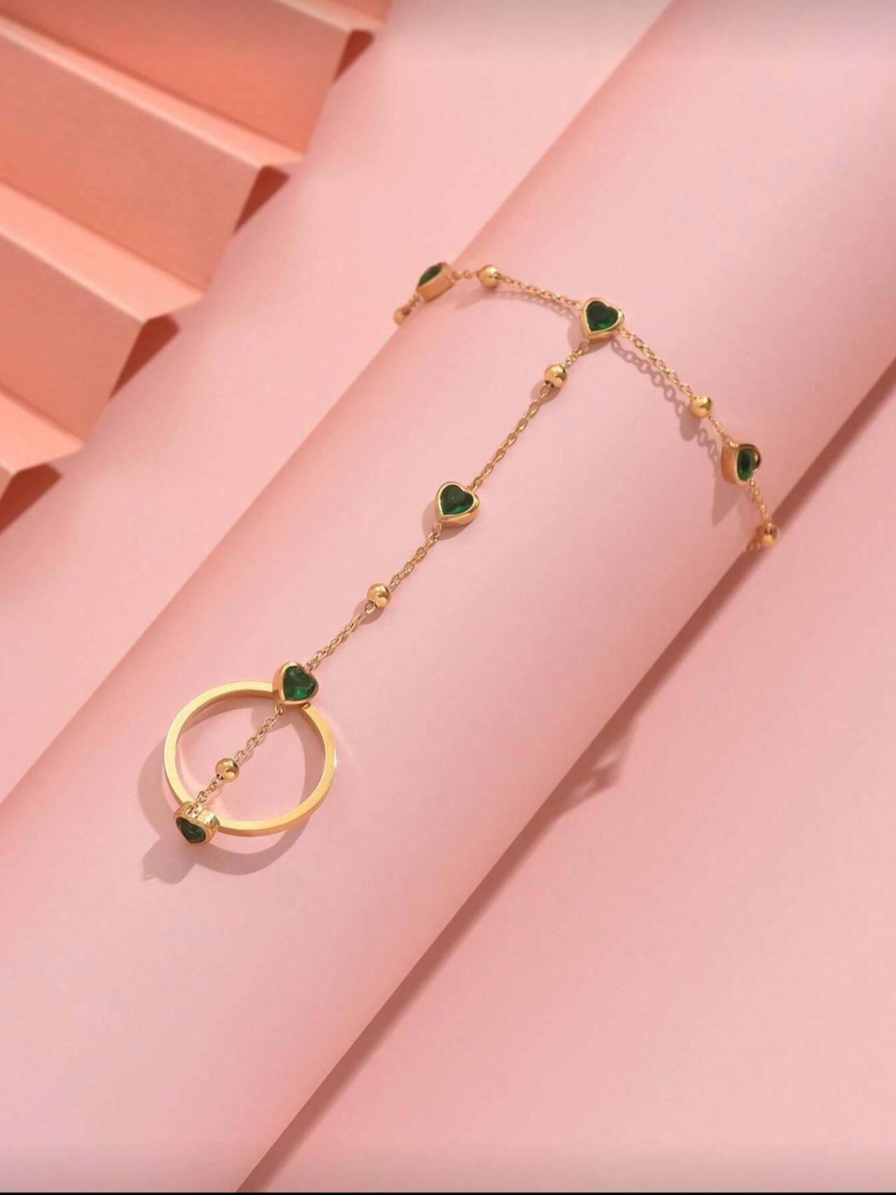 إسورة يد أنيقة مصنوعة من الستانلس ستيل باللون الذهبي، مزينة بقلوب خضراء من الزركون تضيف لمسة من الفخامة والرقي. تجمع بين البريق العصري والتفاصيل الراقية لتكون قطعة مثالية للإطلالات اليومية أو المناسبات الخاصة. تصميمها الجذاب يجعلها إضافة مميزة لمجموعتك من الإكسسوارات أو كهدية أنثوية راقية.