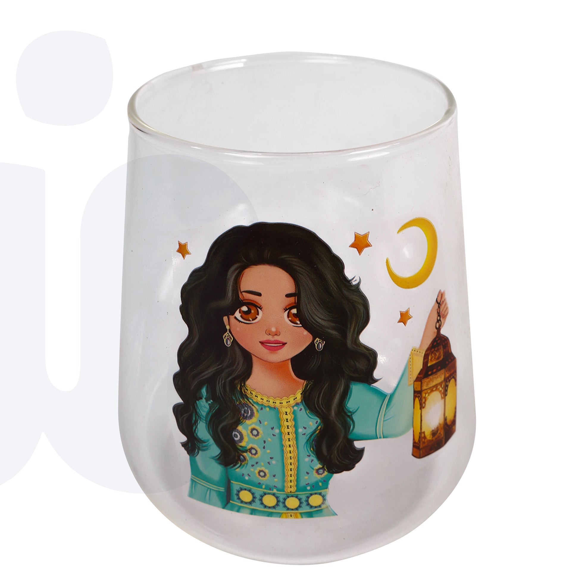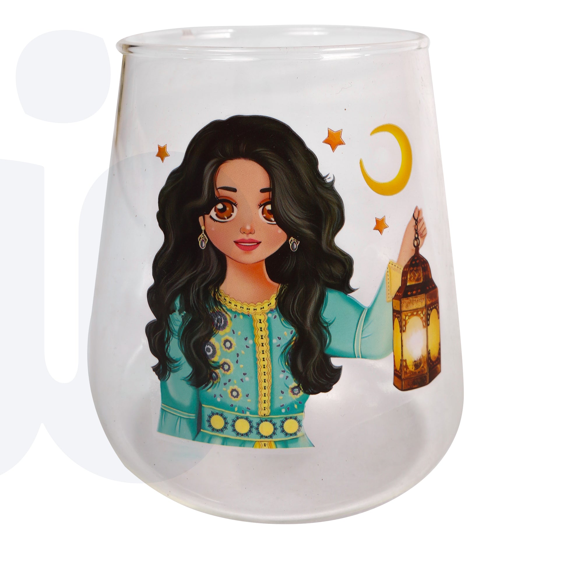 مجموعة أكواب زجاجية شفافة، مصممة خصيصاً لمناسبات شهر رمضان المبارك. تتميز بطبعات كرتونية ملونة جذابة لفتيات مع رموز رمضانية كالهلال والفوانيس. الكوب ذو تصميم واسع (على شكل كمثري) مثالي لتقديم المشروبات الباردة والساخنة كالماء، العصير، الشاي، والكركديه خلال وجبتي الإفطار والسحور.