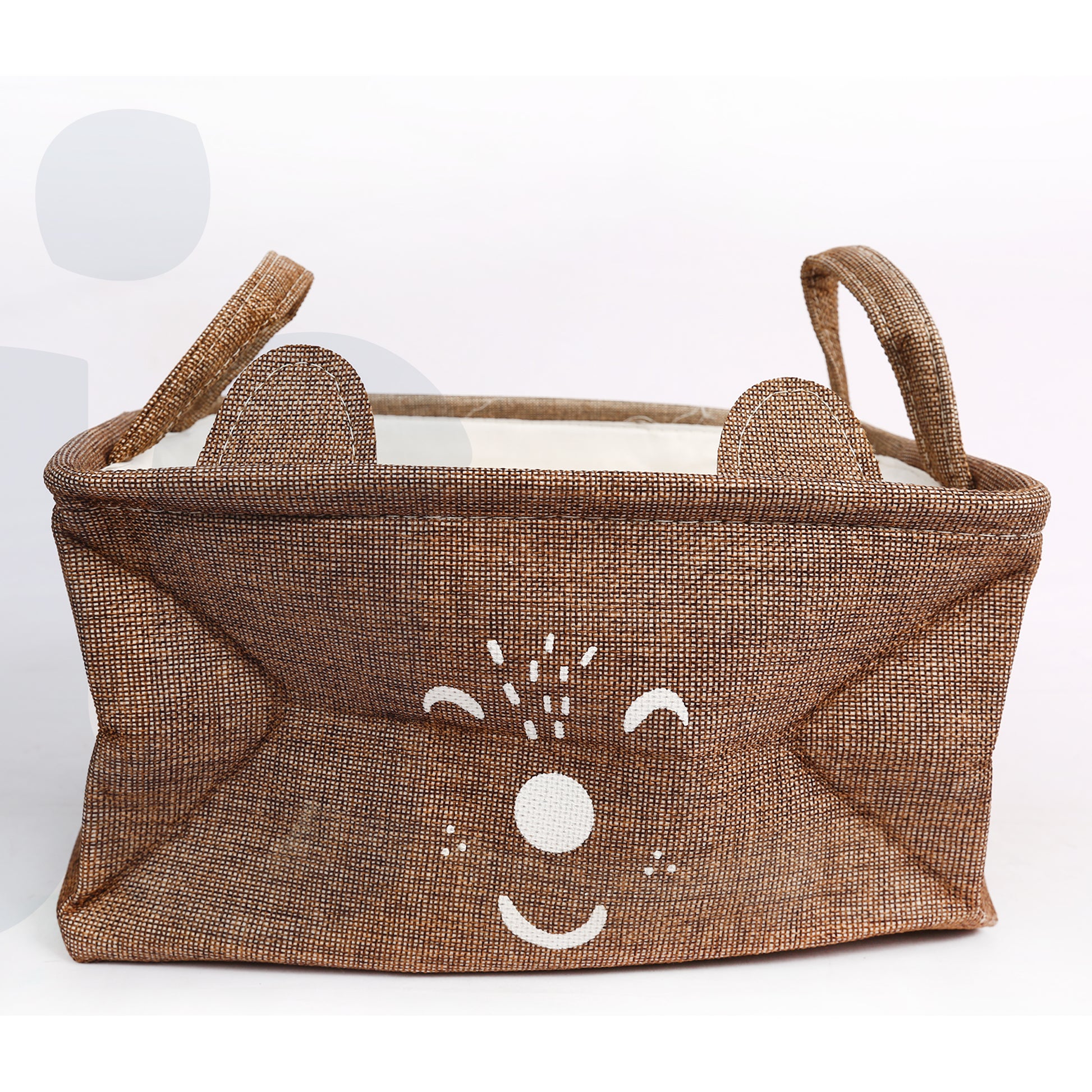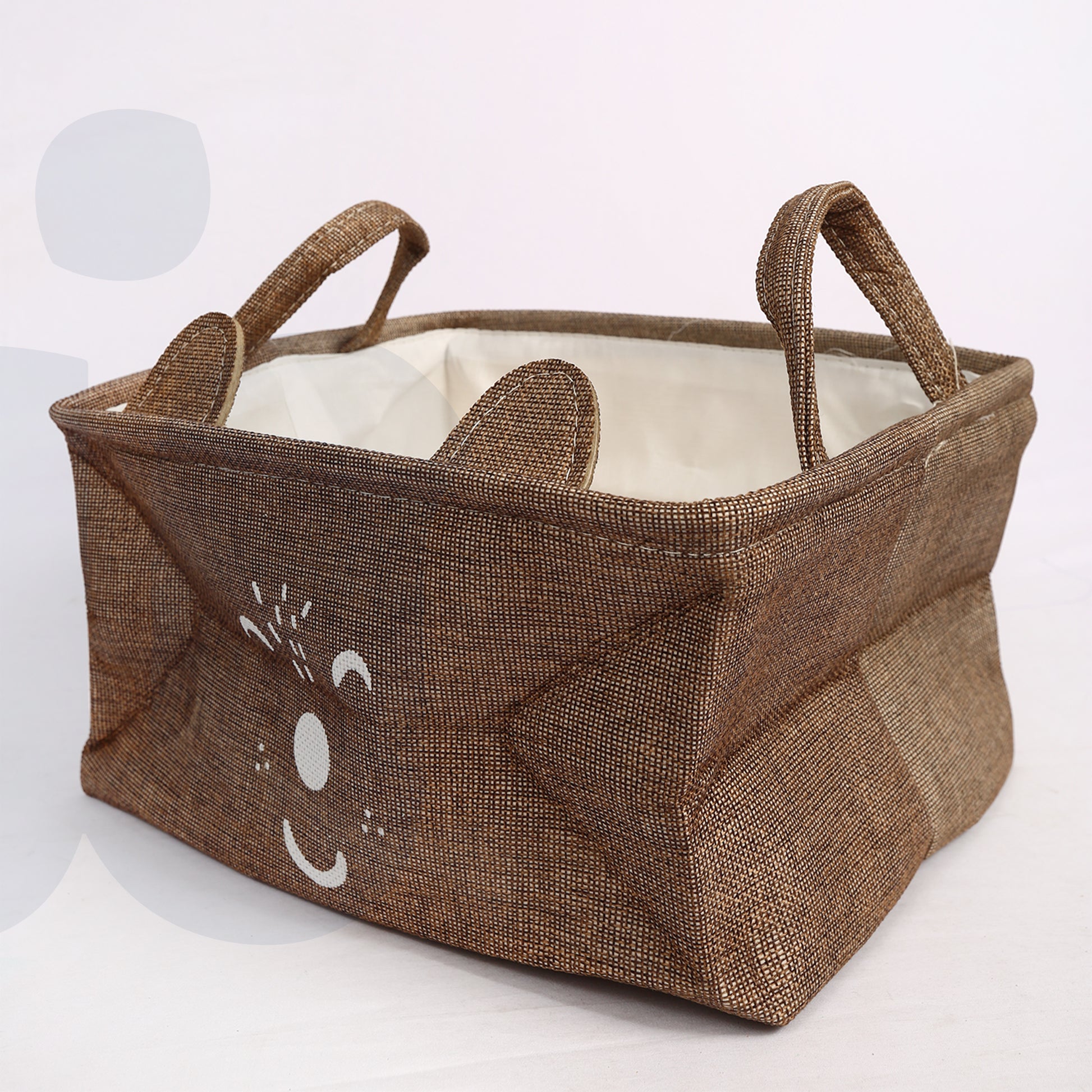 سلة تخزين أنيقة مصنوعة من قماش متين بملمس طبيعي، تتميز بتصميم وجه كرتوني لطيف يضفي لمسة مرحة وجذابة على الديكور. مثالية لتنظيم الألعاب أو الملابس أو الإكسسوارات في غرف الأطفال أو غرف النوم. مزودة بمقابض جانبية لسهولة الحمل وقابلة للطي لتوفير المساحة عند عدم الاستخدام.