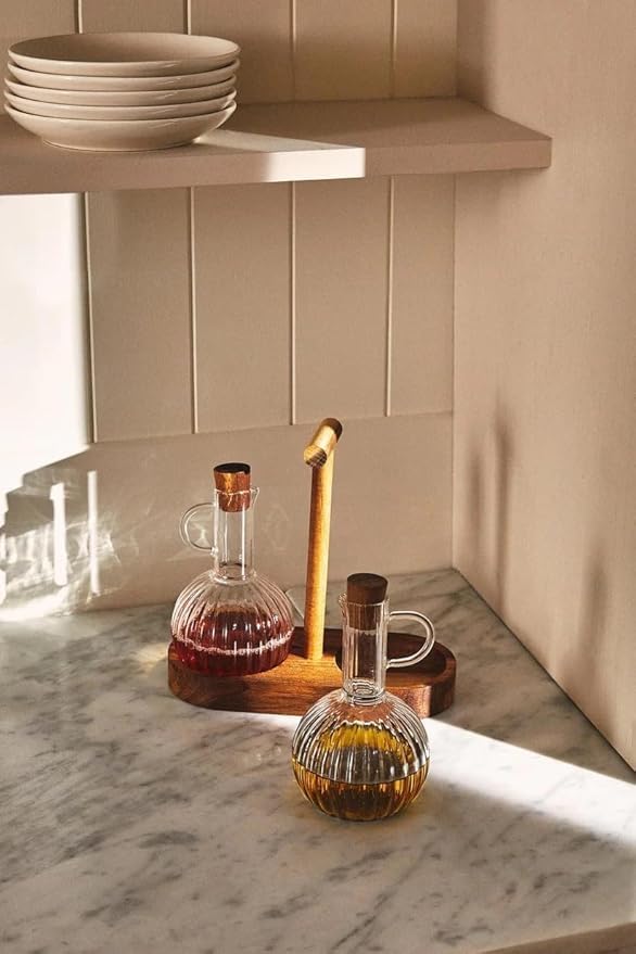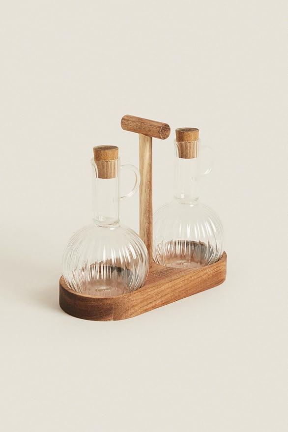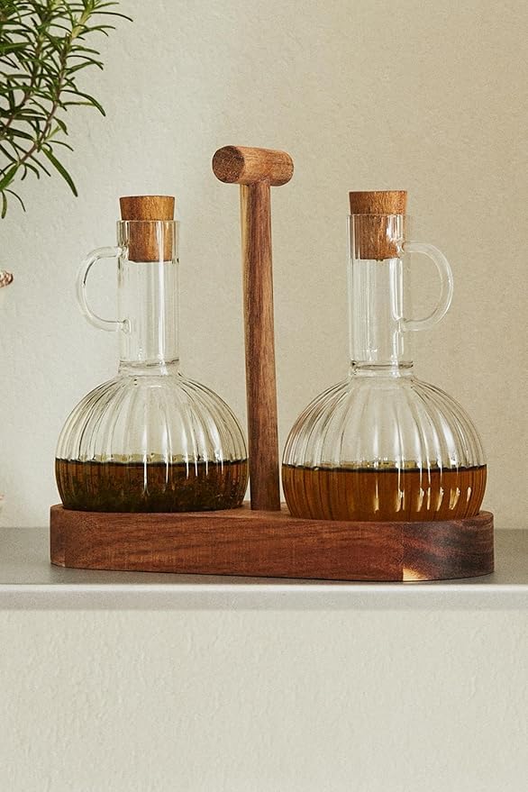 طقم موزع زيت وخل زجاجي مع حامل خشبي
