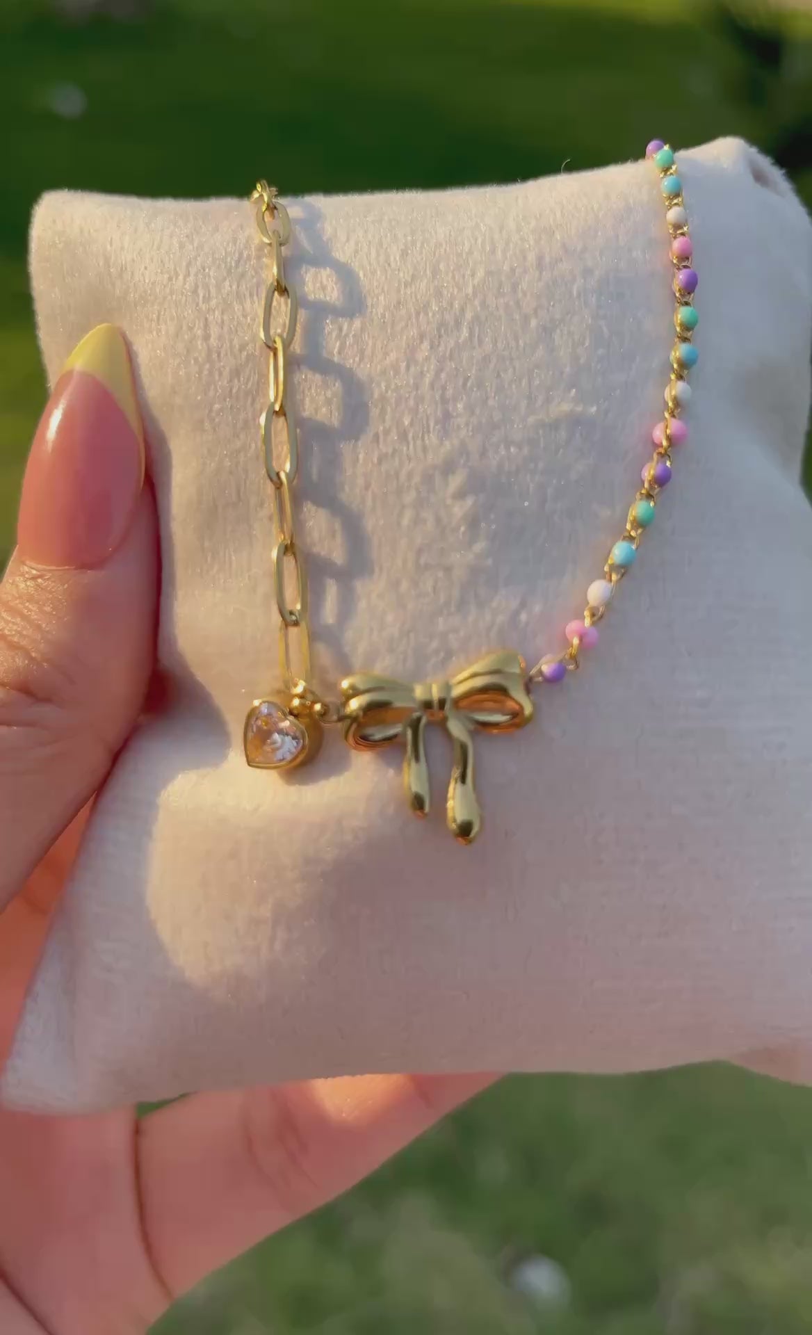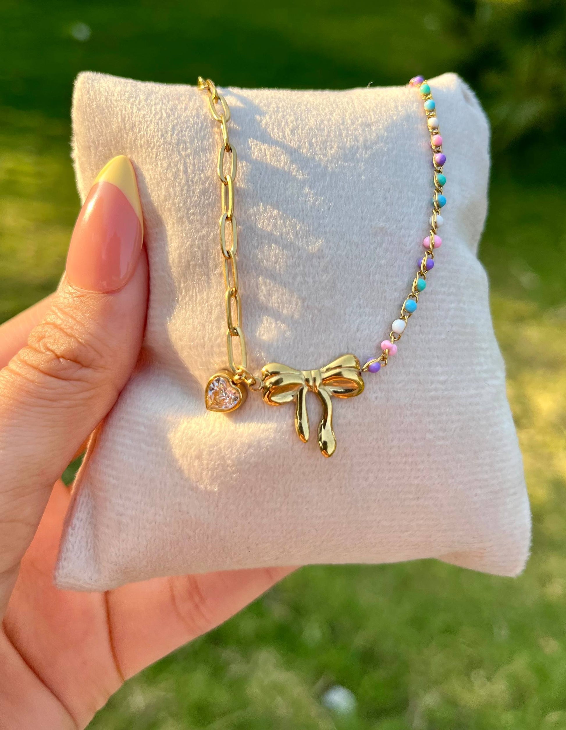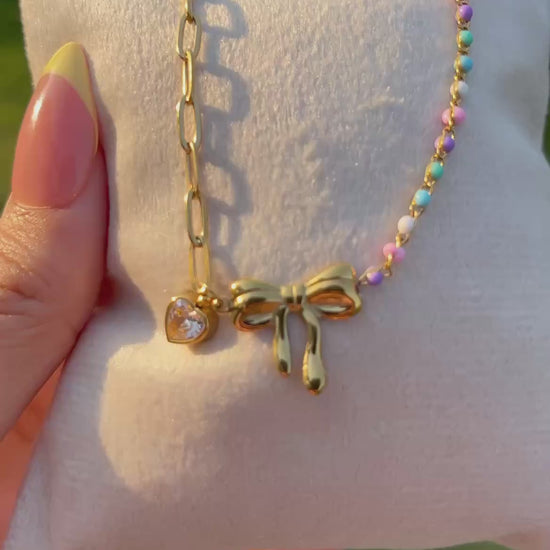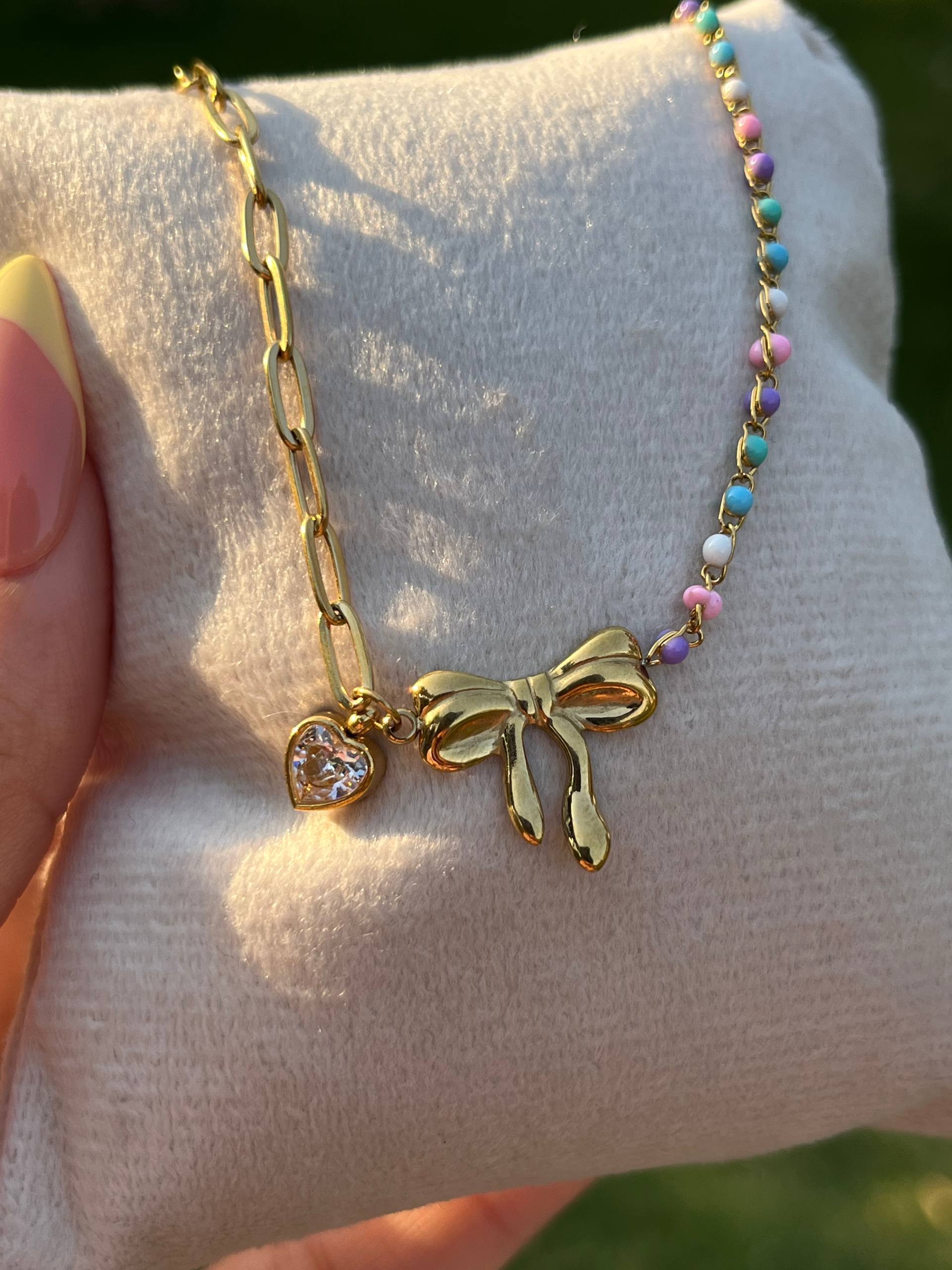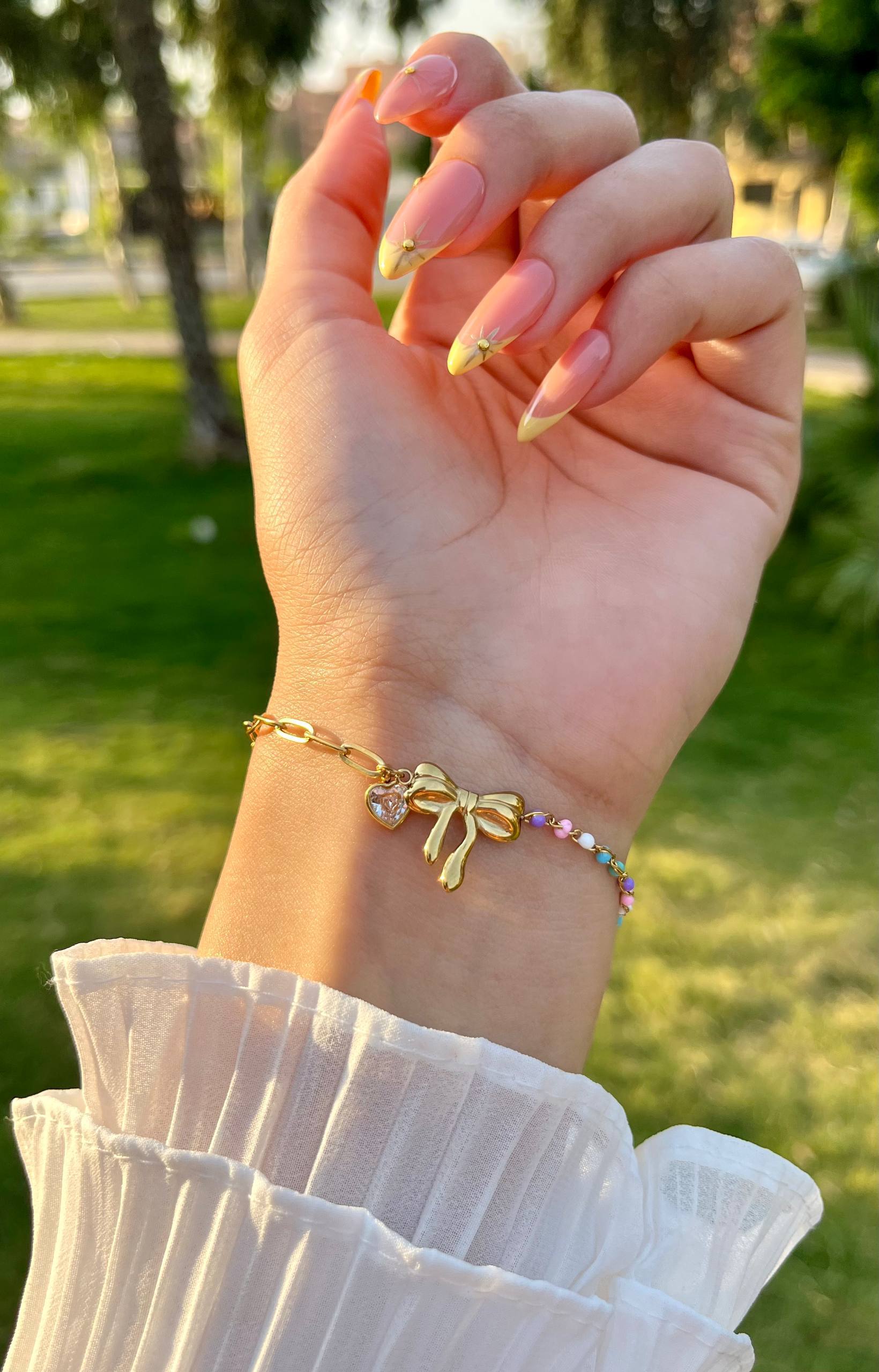 إسورة أنثوية جذابة مطلية بالذهب، تجمع بين تصميم الفيونكة الأنيق وقلادة القلب الرقيقة، مع خرز ملون يضفي لمسة مرحة ومشرقة. تعكس مزيجًا من الأناقة والمرح لتناسب الإطلالات اليومية والمناسبات الخاصة على حد سواء. قطعة مثالية لمحبات التفاصيل الناعمة والمميزة.