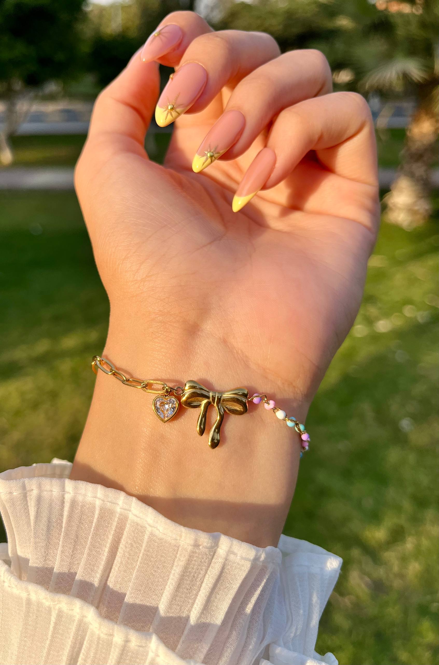 إسورة مطلية بالذهب بتصميم فيونكة مزينة بقلادة قلب وخرز ملون