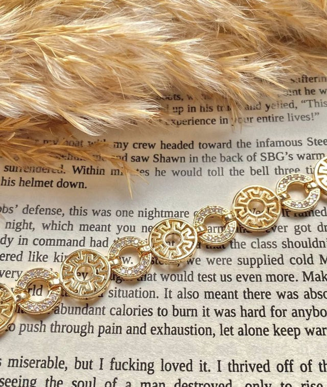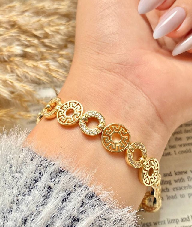 إسورة أنيقة مطلية بالذهب بتصميم المفتاح الإغريقي الكلاسيكي الذي يرمز للفخامة والأناقة الخالدة. تتميز بحلقات دائرية متصلة مزينة بفصوص كريستال لامعة تضيف لمسة راقية وجذابة إلى معصمك. مصنوعة من خامة عالية الجودة تمنحها متانة ولمعان يدومان طويلًا، مما يجعلها قطعة مثالية للمناسبات الخاصة أو للإطلالات اليومية الأنيقة.