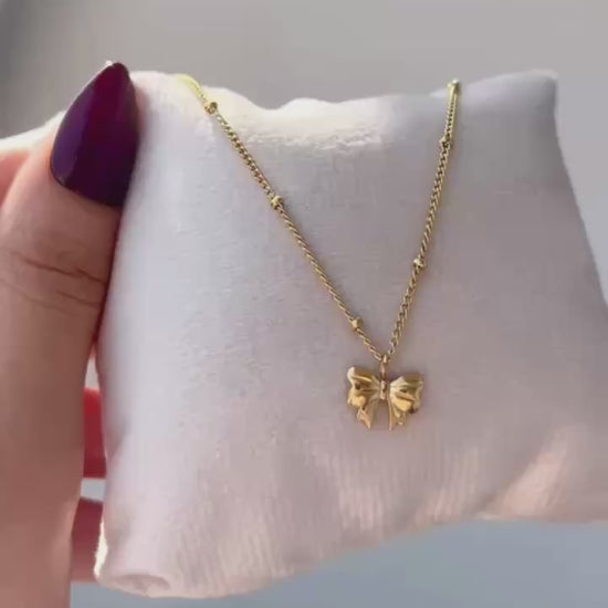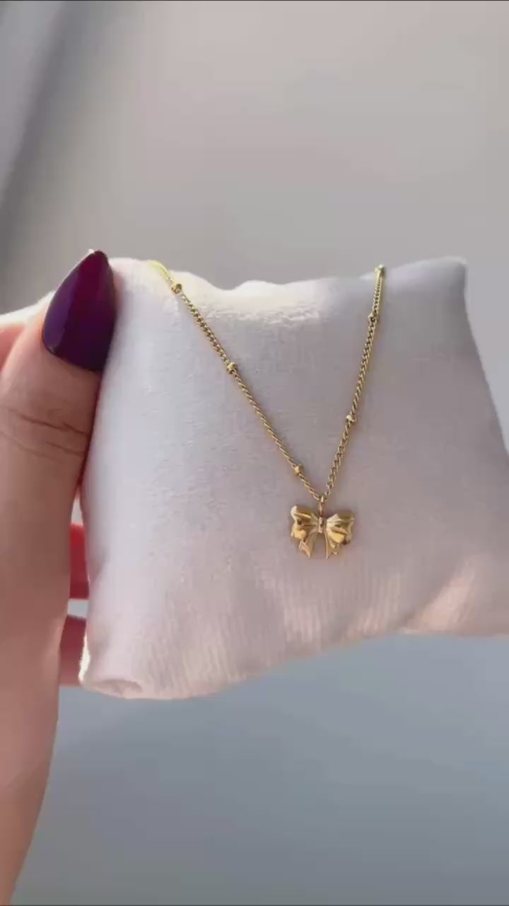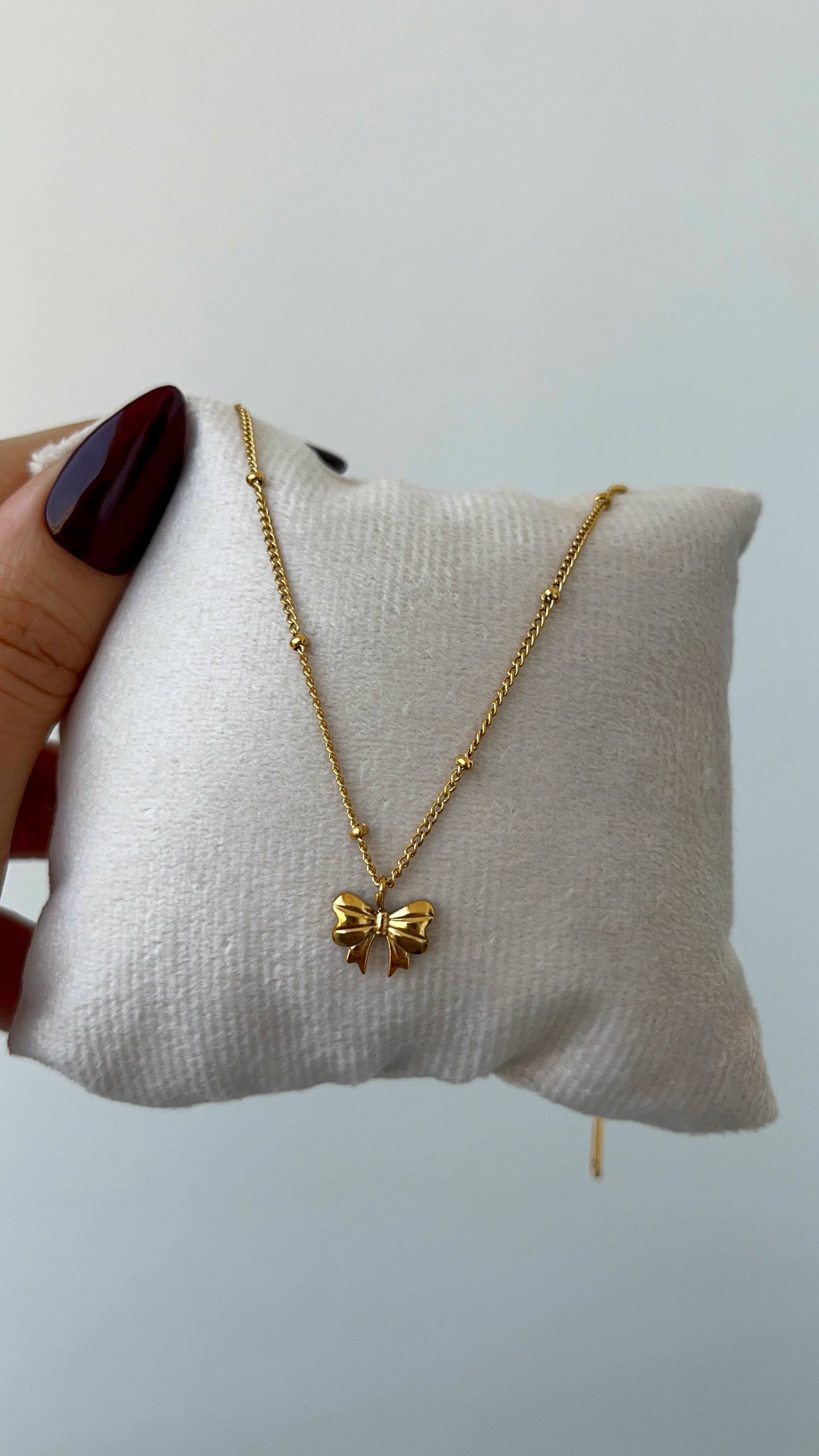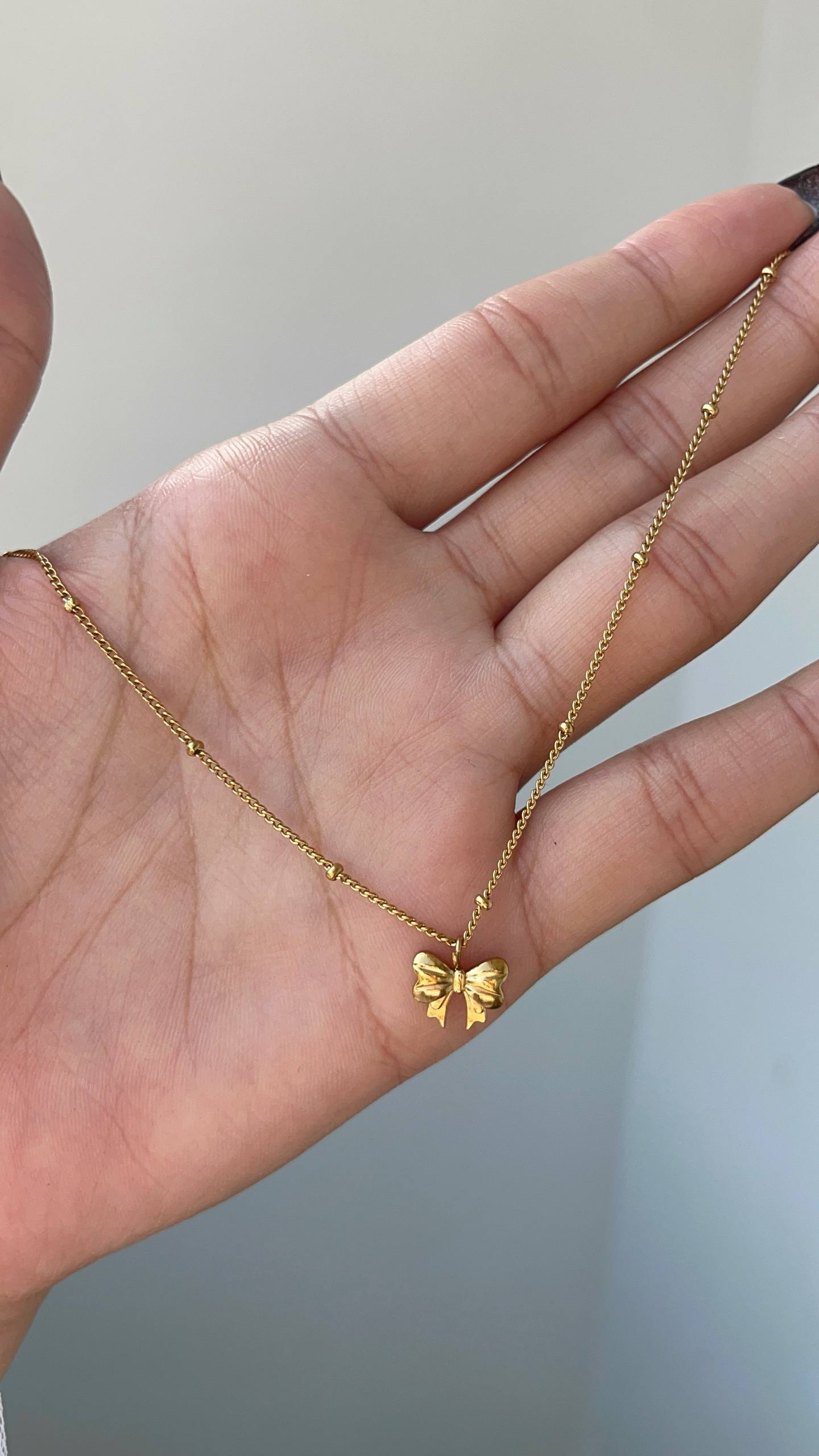 عقد أنيق بتصميم فيونكة رقيق مصنوعة من خامة الستانلس ستيل النقي باللون الذهبي اللامع، مما يمنحه مظهرًا ناعمًا وفخمًا يدوم طويلاً دون بهتان. يتميز بتفاصيل دقيقة تضيف لمسة أنثوية جذابة تناسب جميع الإطلالات، سواء اليومية أو السهرات. قطعة بسيطة لكنها لافتة، تُضفي لمسة جمالية راقية على أي لوك، كما تعد خيارًا مثاليًا للهدايا.