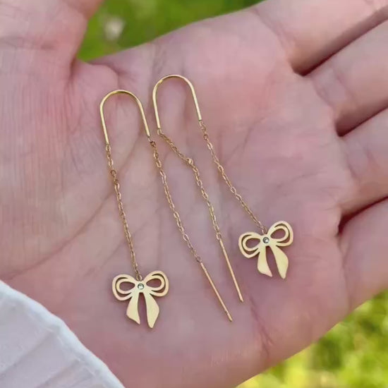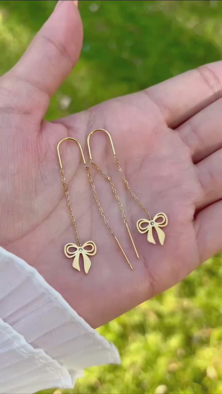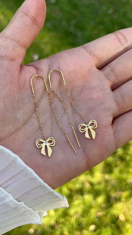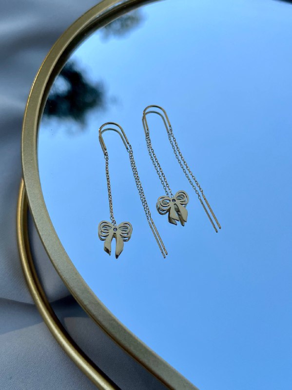 زوج من الحلقان الأنيقة المصنوعة من الستانلس ستيل عالي الجودة باللون الذهبي، يتميز بتصميم متدلٍ فيونكه لإطلالة أنثوية عصرية ولافتة. يضيف لمسة من الأناقة والحركة لكل إطلالة، مما يجعله مثاليًا للمناسبات الخاصة أو للاستخدام اليومي الفاخر.