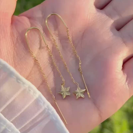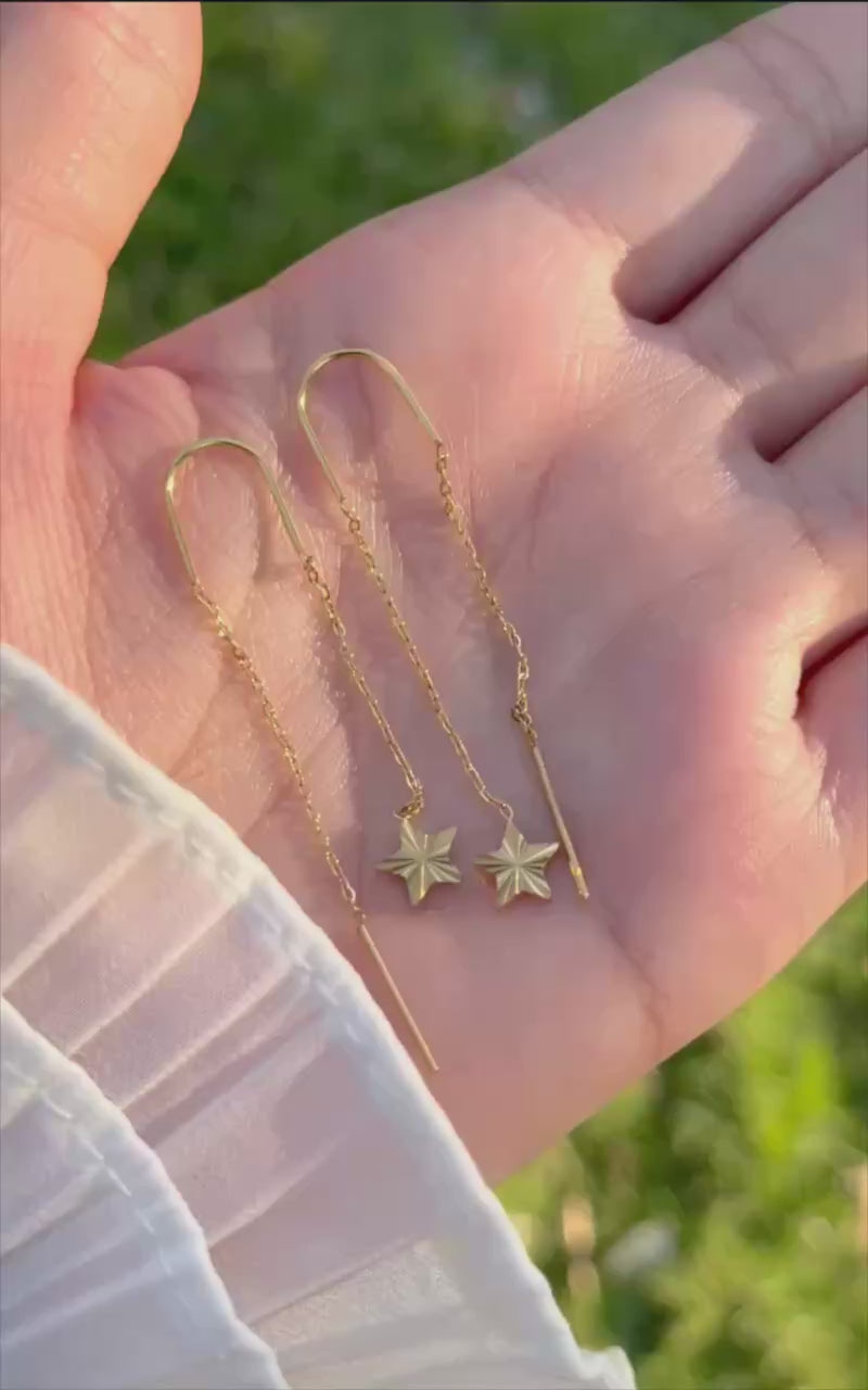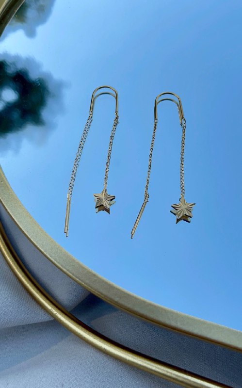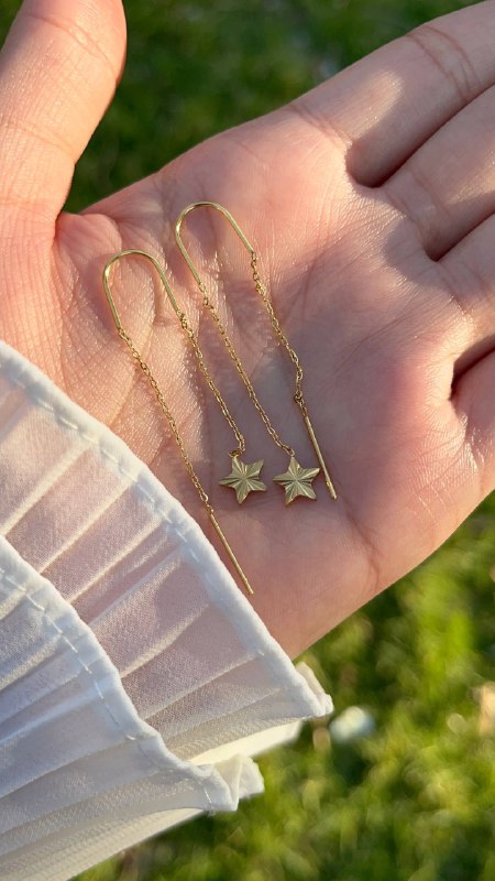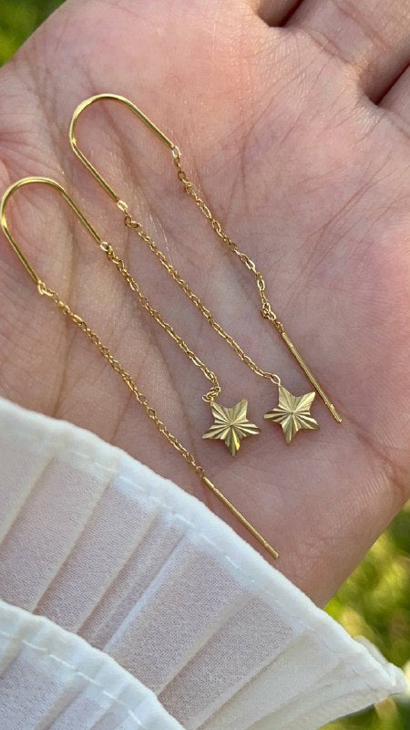 زوج من الحلقان الأنيقة المصنوعة من الستانلس ستيل عالي الجودة باللون الذهبي اللامع، بتصميم متدلٍ على شكل نجمة يضفي لمسة من البريق والأنوثة على إطلالتك. تجمع بين التصميم العصري والمتانة، مما يجعلها مثالية للاستخدام اليومي والمناسبات الخاصة على حد سواء.