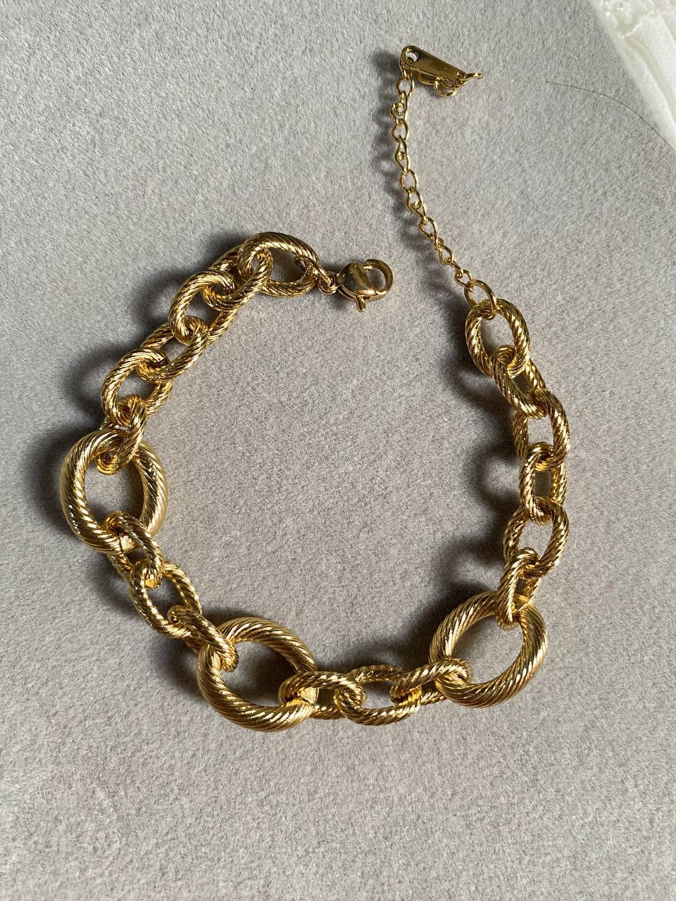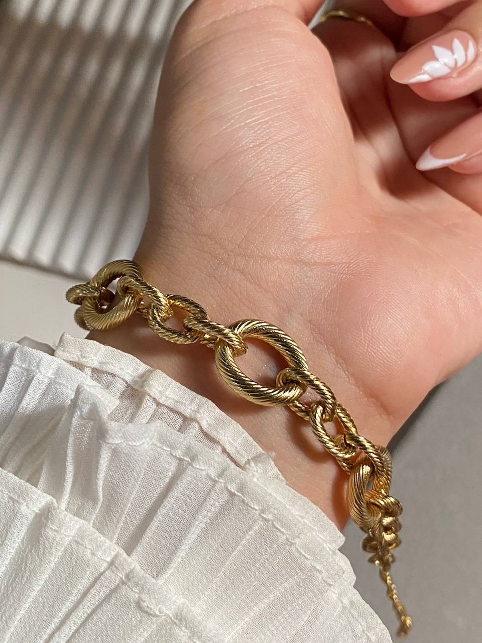 إسورة أنيقة بتصميم عصري وجريء تجمع بين الفخامة واللمسة الكلاسيكية. تتميز بسلسلة سميكة باللون الذهبي مع روابط دائرية ملتفة تمنحها مظهرًا فخمًا ومميزًا. مزودة بقفل توغل أنيق يسهل ارتداؤها ويضفي لمسة من الرقي على معصمك. مثالية للإطلالات اليومية أو المناسبات الخاصة، ويمكن تنسيقها بسهولة مع مختلف الإكسسوارات الذهبية.
