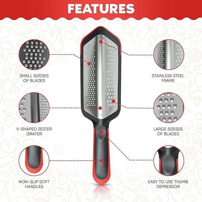 أداء احترافي: تتميز بشفرة حادة للغاية مصنوعة من الفولاذ المقاوم للصدأ، مما يضمن لك بشرًا سهلًا وفعالًا للجبن، الخضروات، والزنجبيل.