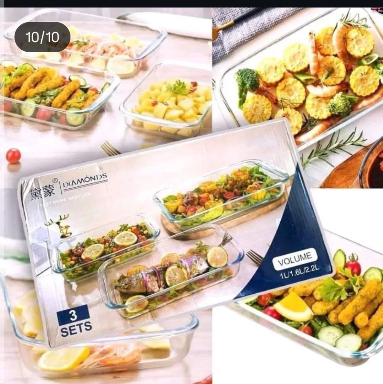 طقم طواجن بيركس حراري مستورد عالي الجودة مكون من 3 قطع مستطيلة بأحجام مختلفة، مثالية لتحضير أشهى الأطباق في الفرن أو تقديمها مباشرة على السفرة، تتحمل الحرارة العالية وتُعد عملية وسهلة التنظيف