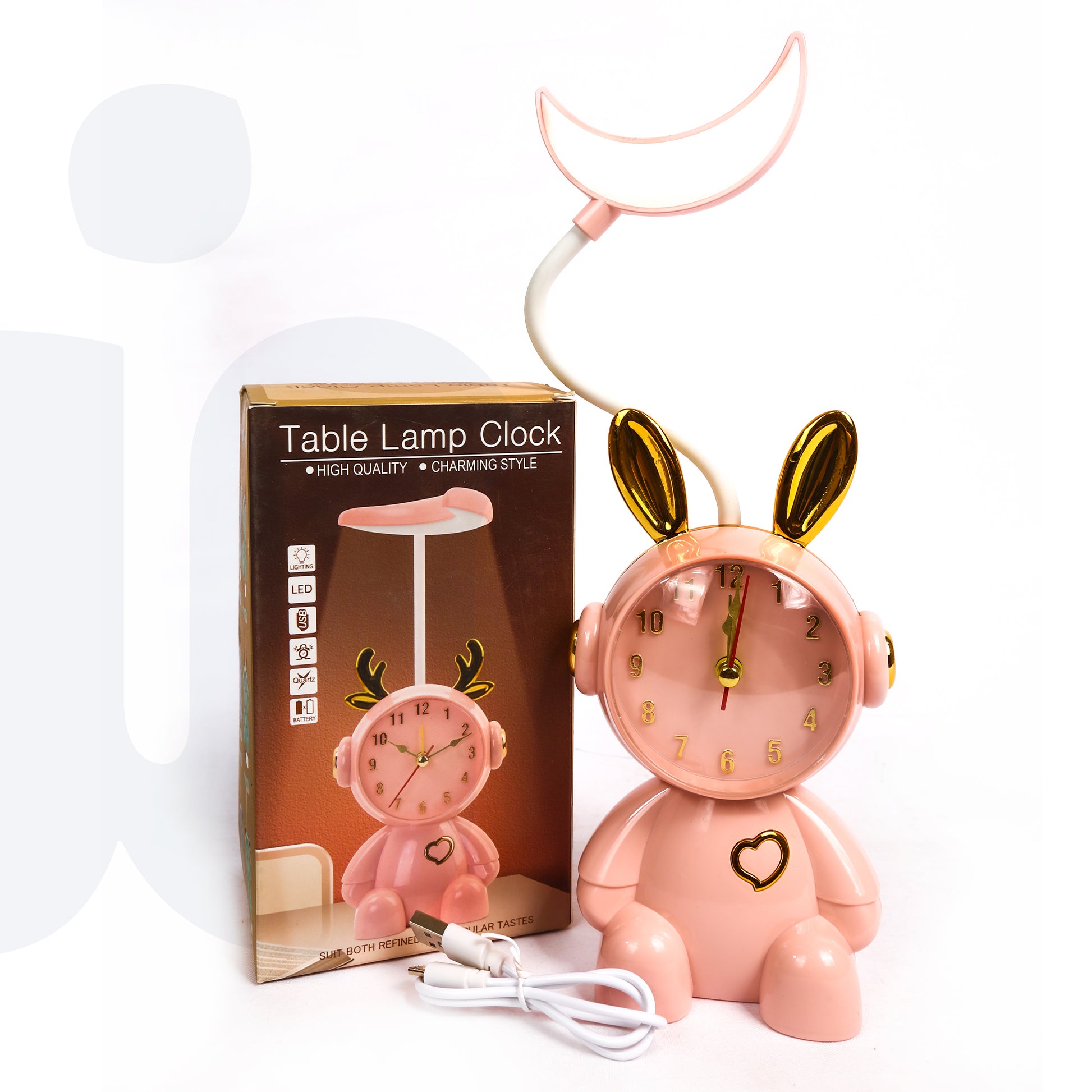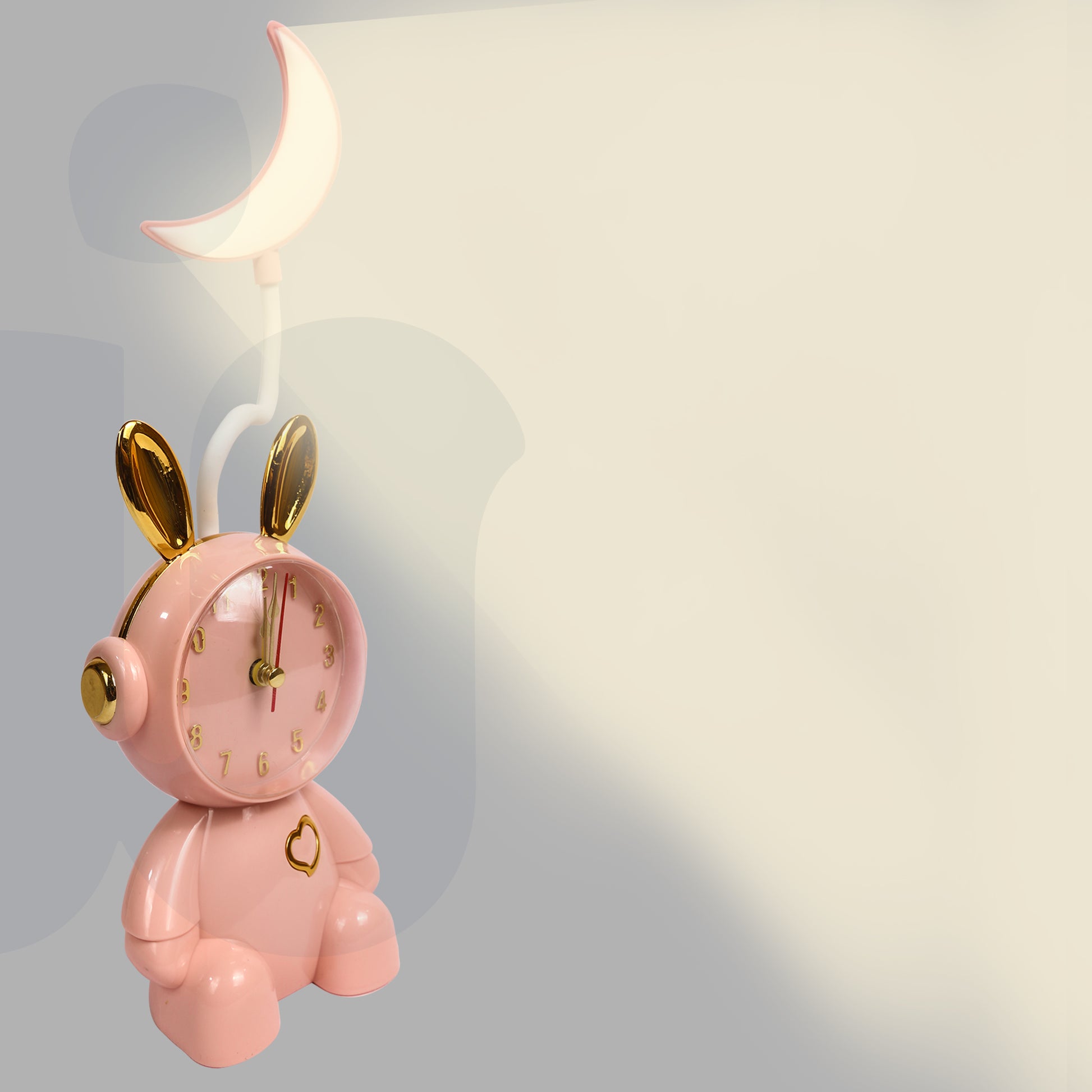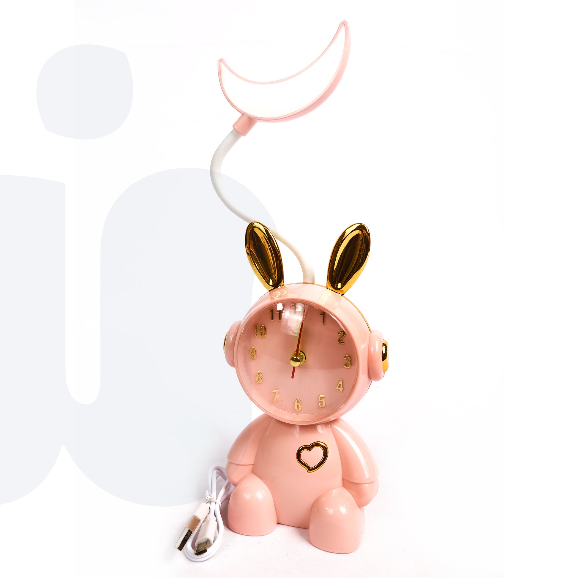 بلمسات وردية وذهبية، مزودة بضوء مرن بعنق متحرك. LED ساعة مكتب على شكل أرنب لطيف مع مصباح قمر